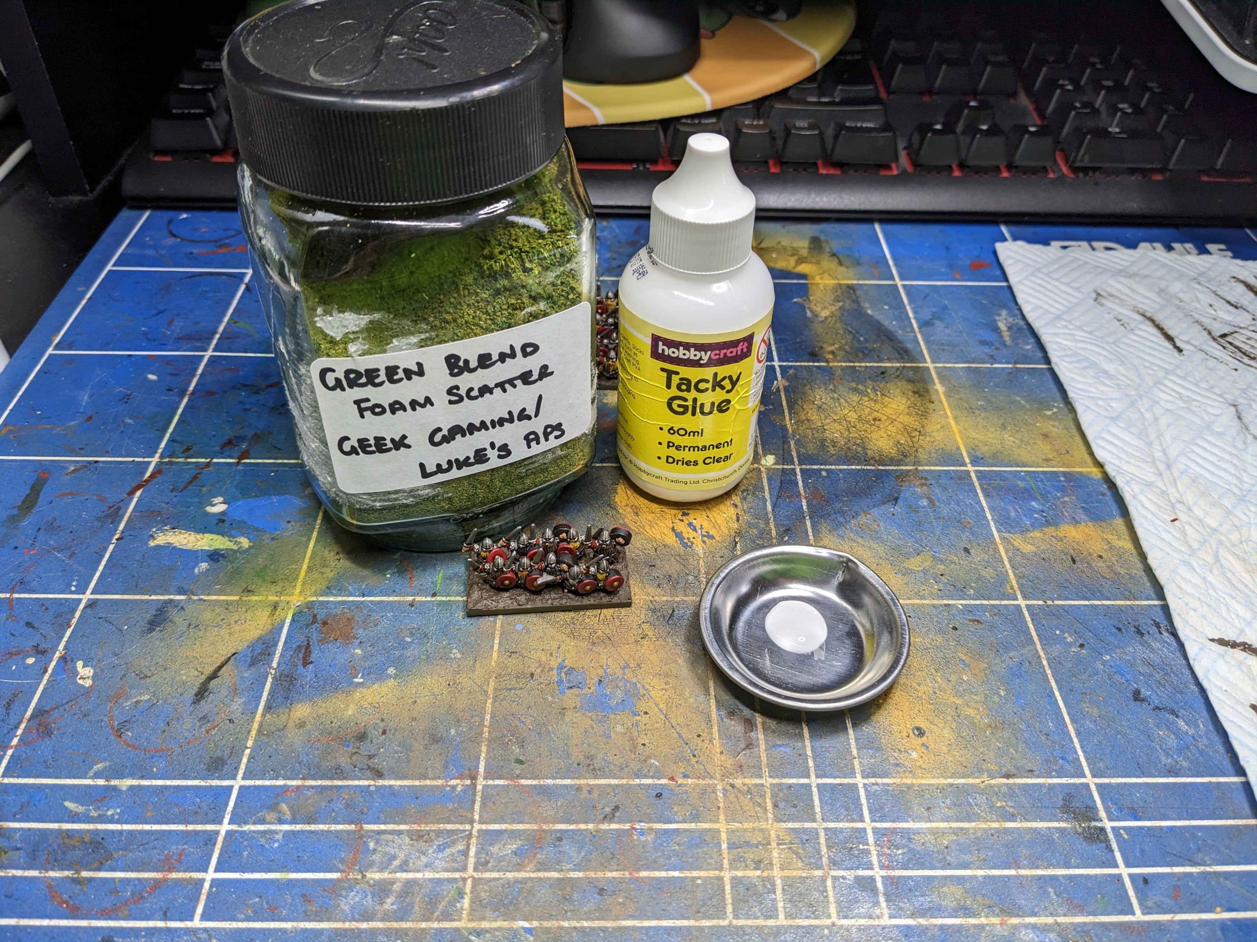 - Flock used is a green blend foam scatter flock from Geek Gaming Scenics that has been in the cupboard for several years at this point.