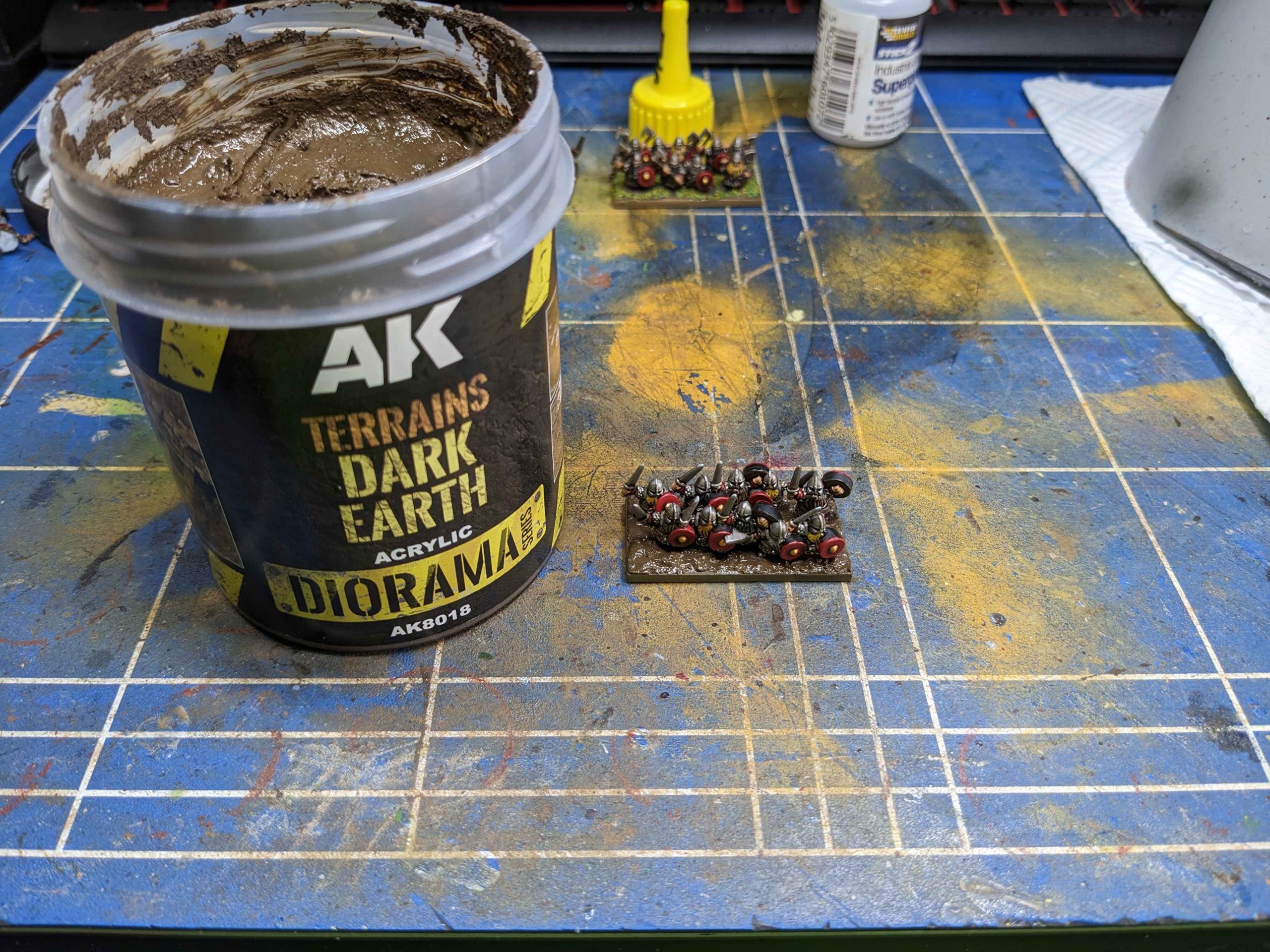 - Using AK’s Dark Earth texture paste, fill the area between the back row and the back of the base. Also put down the paste that will sit between the two rows