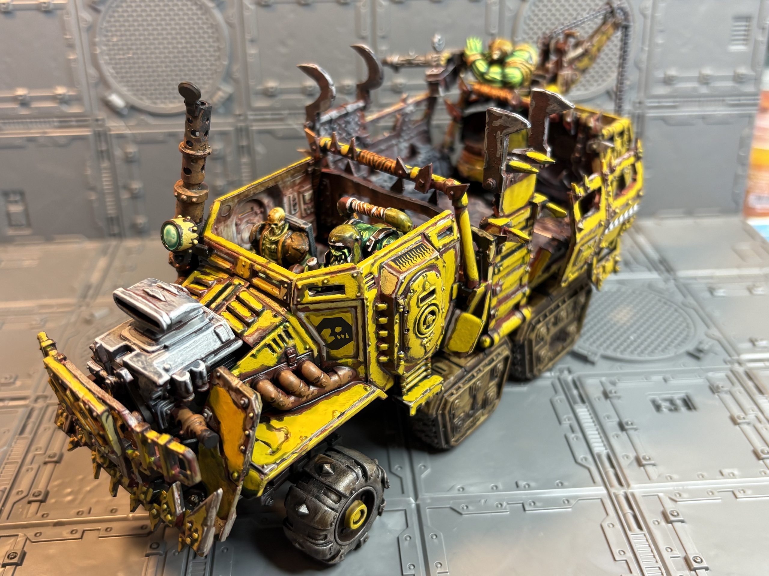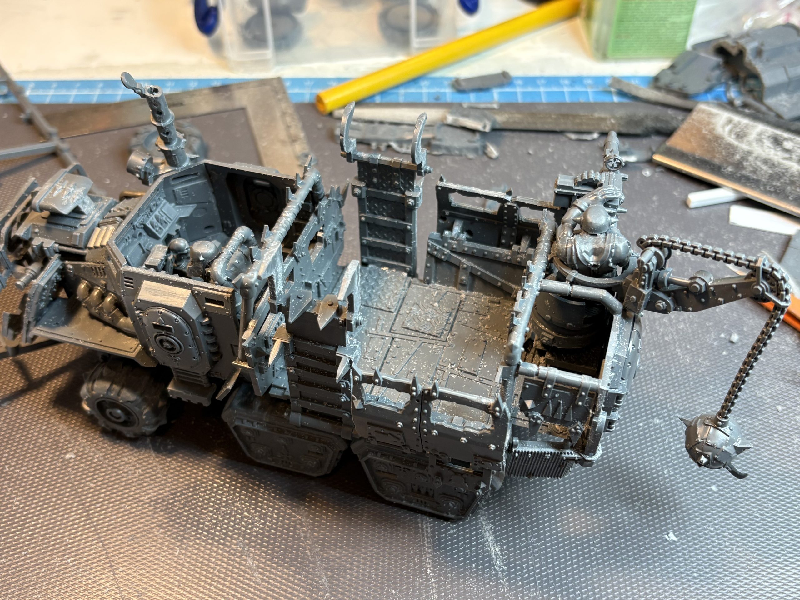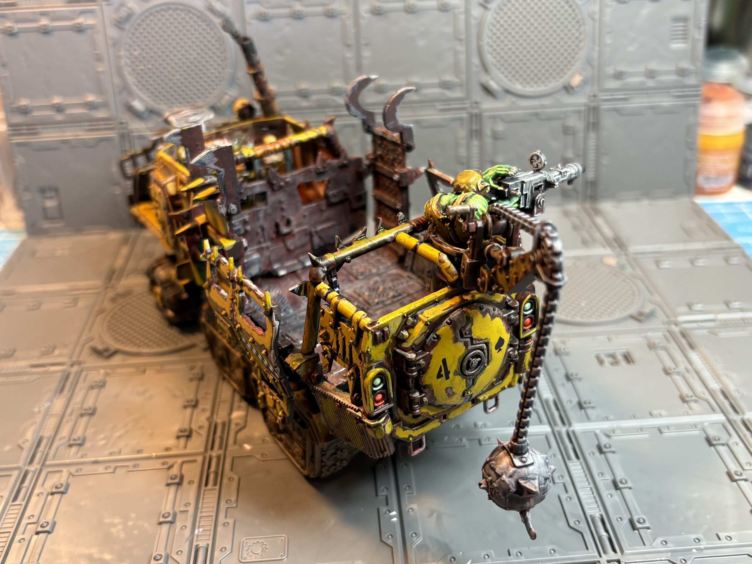 Used a paint pen to make it white (AFVs are white inside); some contrast paints for screens and buttons and things that no Ork would use; then Vallejo rust powders, fixer, and using a q-tip with some alcohol, wiped away the top mess. Had the nice effect of removing a bit of the white to show normal wear, too.