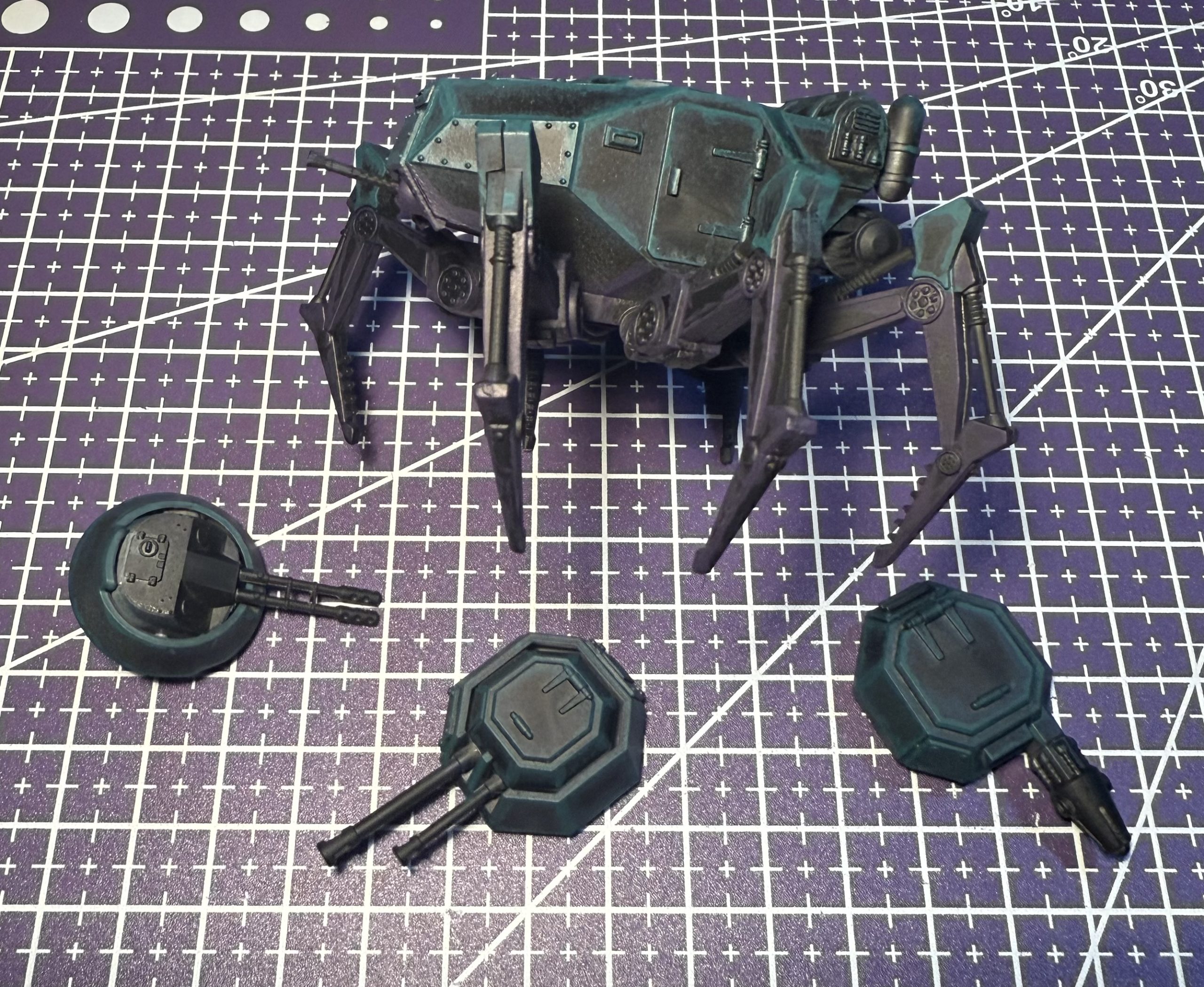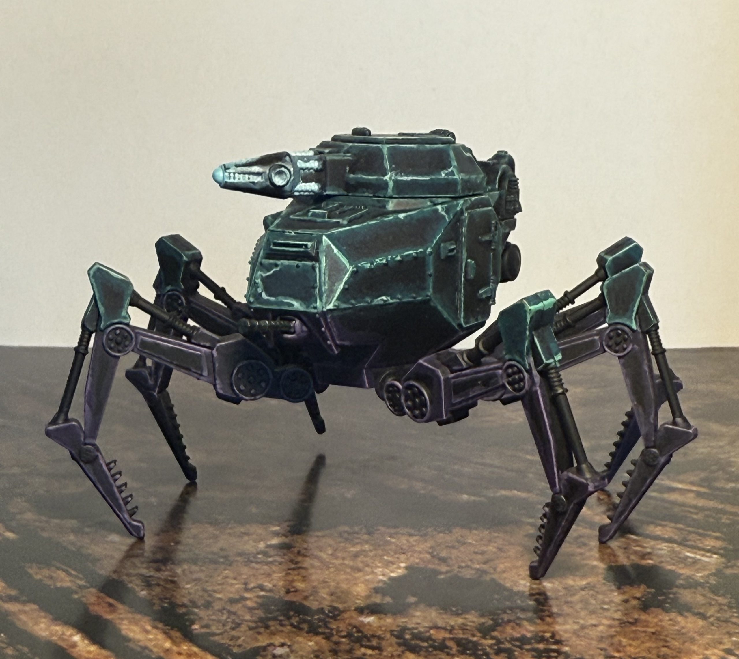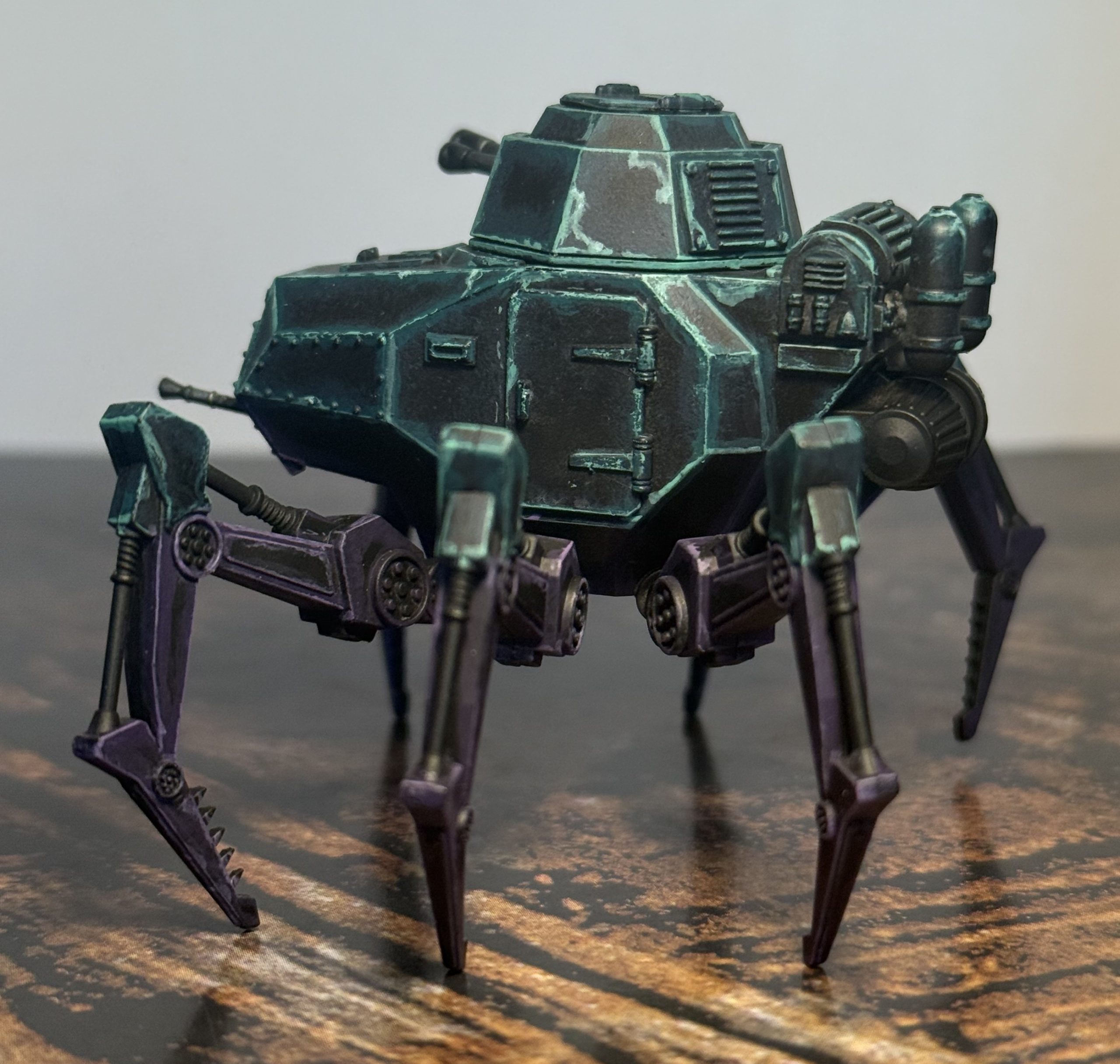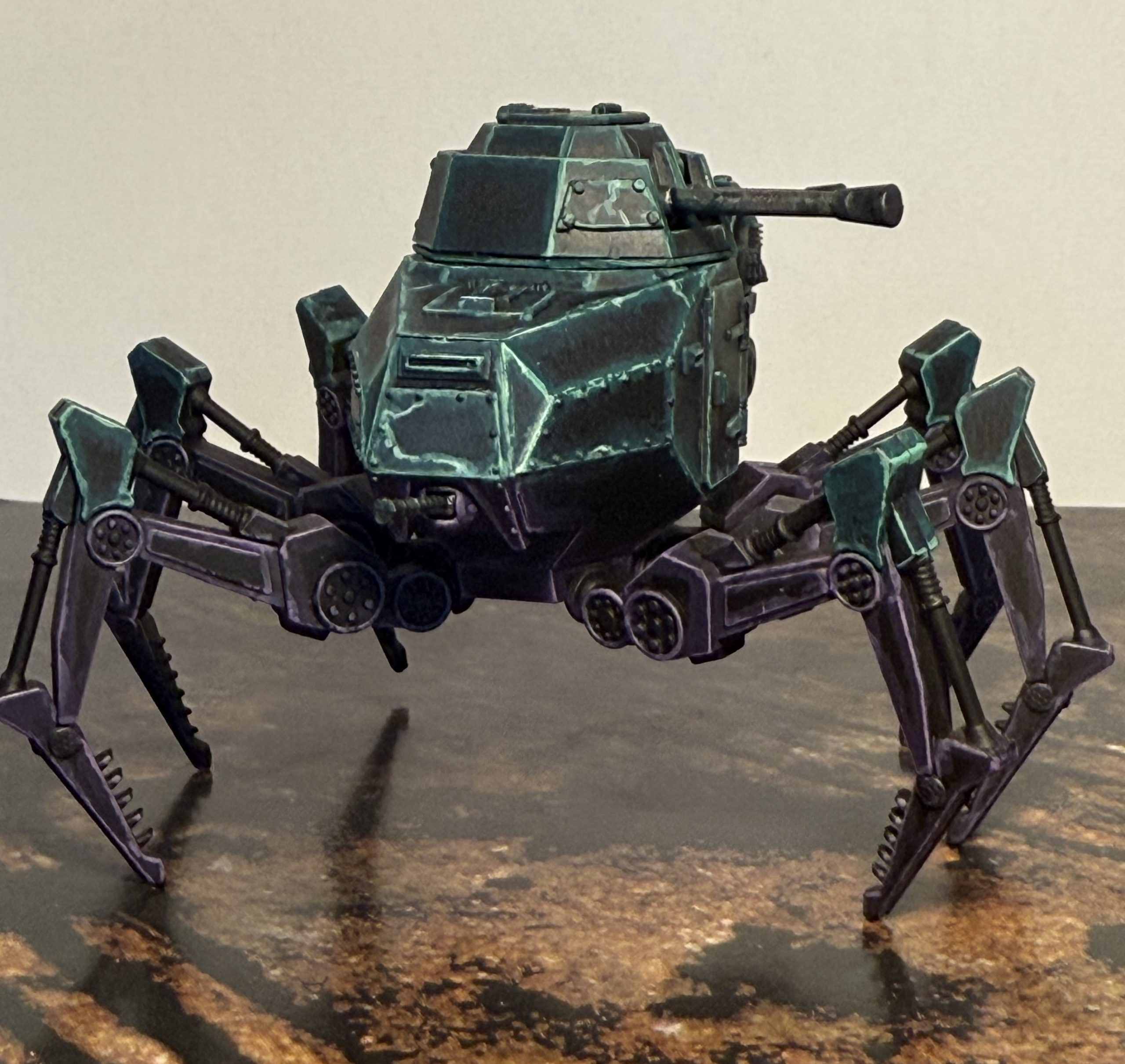 I’m quite happy with the result. It may be a bit bright to stay hidden, but when the dust kicks up and it starts clattering around the battlefield, I think it would be the last thing its enemies would want to see emerge ahead of (or behind) them. I do imagine that the colours are more muted while idling, maybe a future opportunity for painting a second one.