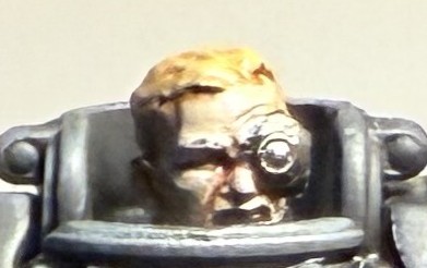 Then things turned weird. I saw the masked head that didn’t have a helmet and I saw a robotic arm on a Stargrave sprue and I saw a round shield, with concentric rings on a Wargames Atlantic Skelebob sprue. Uh-oh, I’m about to do something stupid.