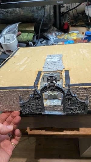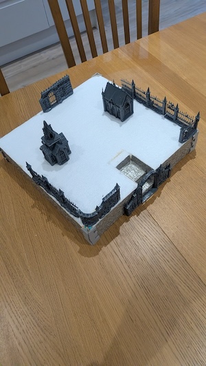 At this stage I dry fitted a few fence sections and mausoleums to see what everything looked like : pretty good. Although I noted they would easily get knocked off.