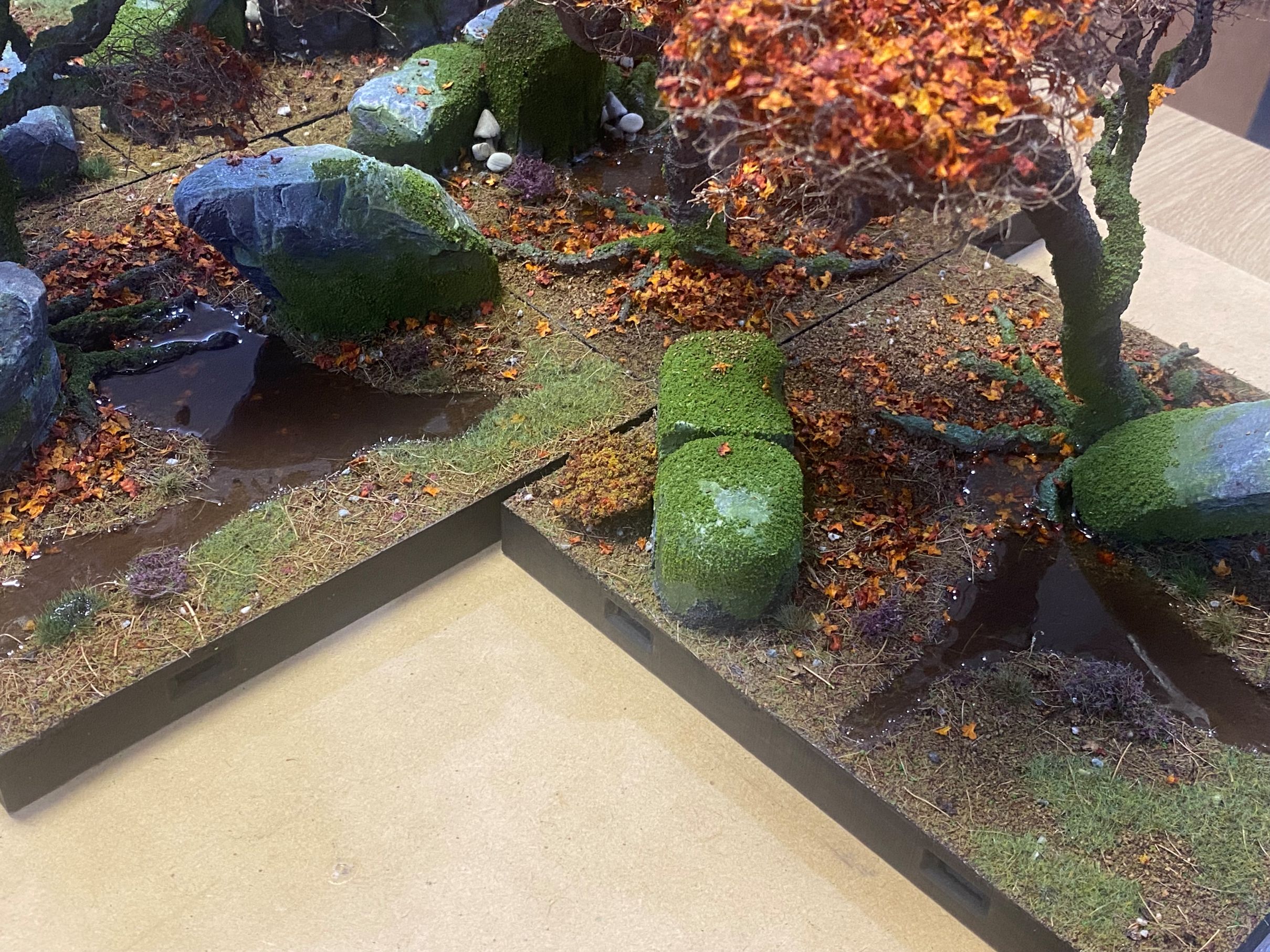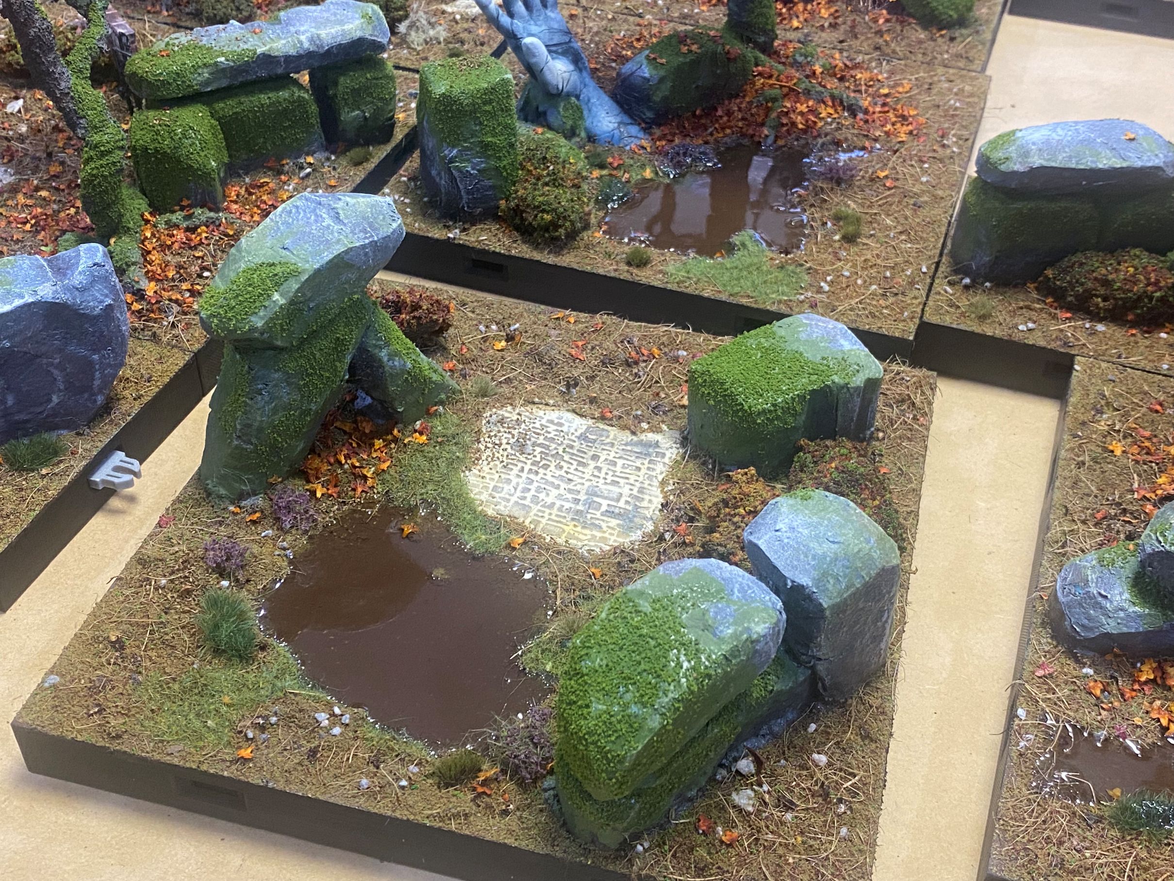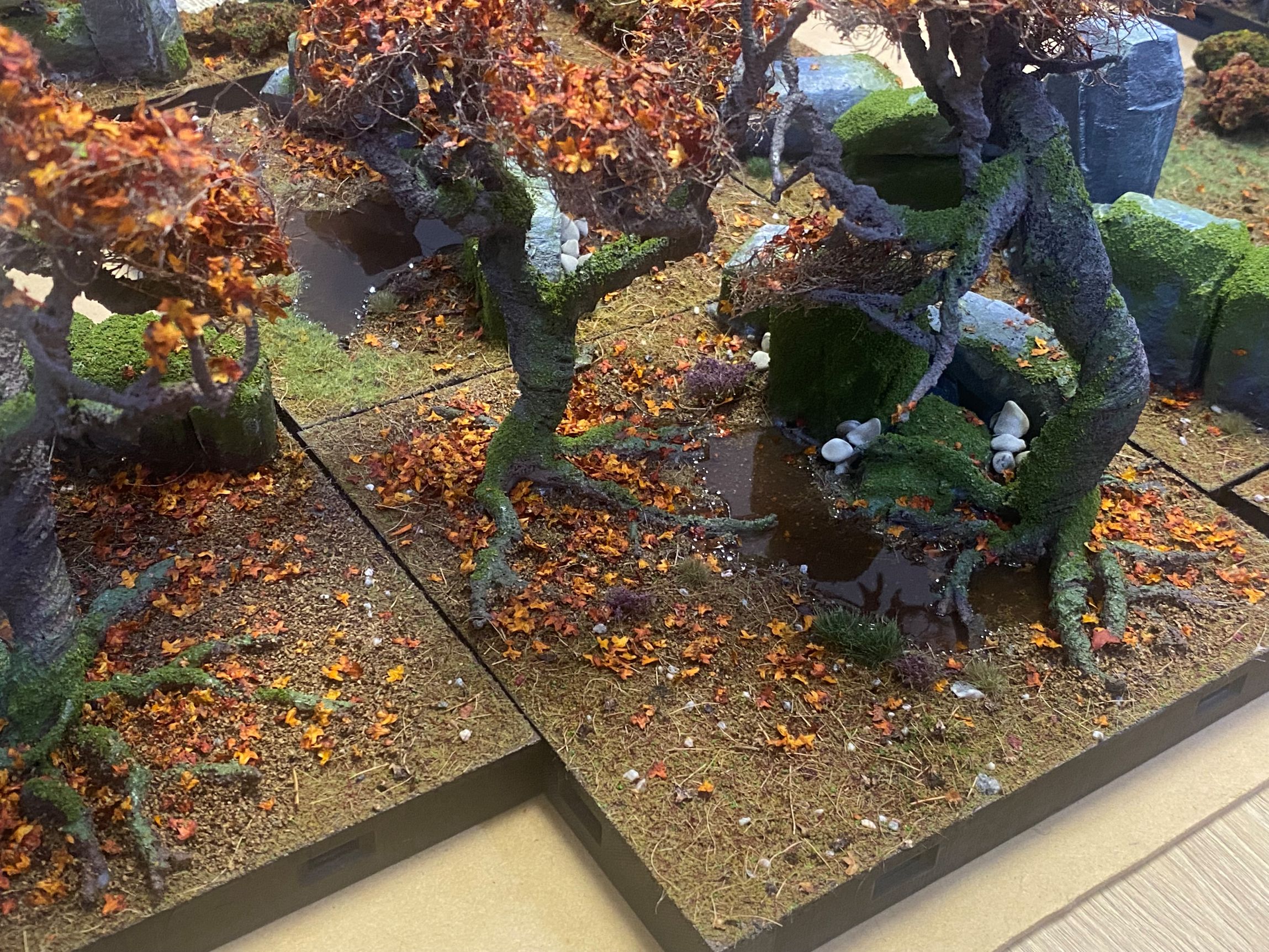 I am quite happy with how it looks from figure height. The rocks and bushes really break up the lines of sight nicely and create lots of hiding spots, whilst the tree canopy gives the hint of trees, whilst still allowing access to move figures around easily.