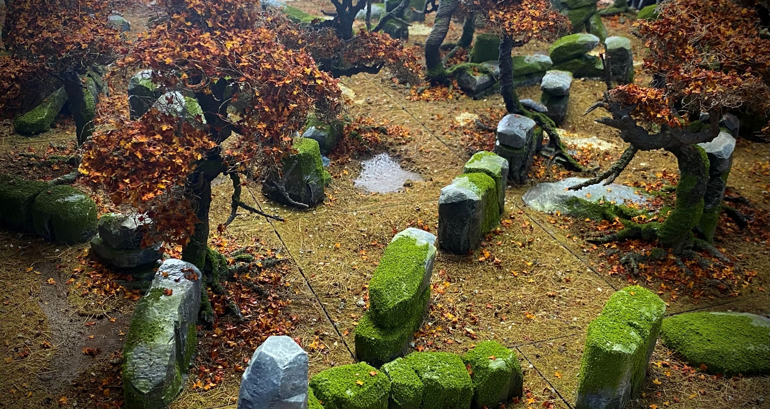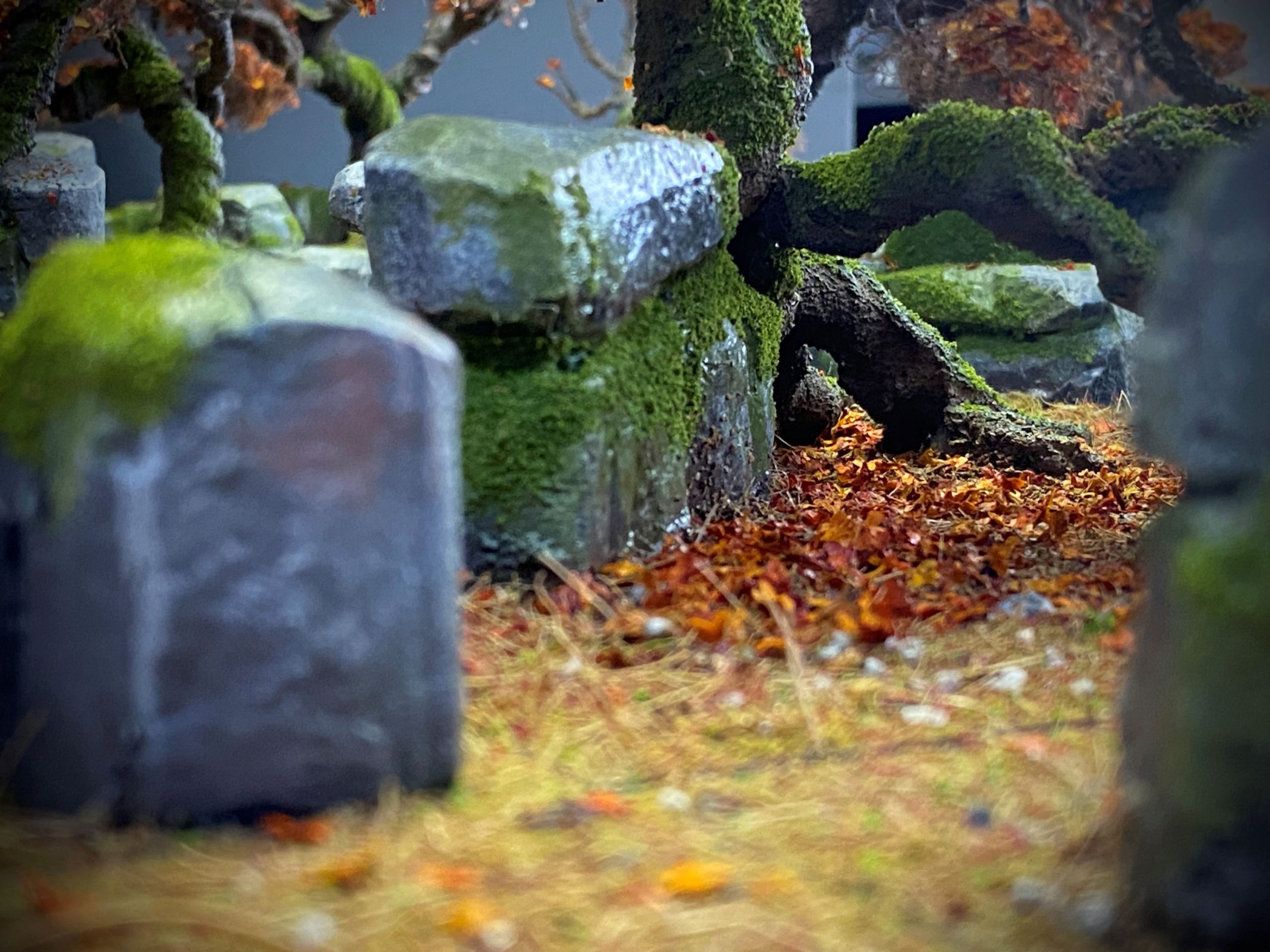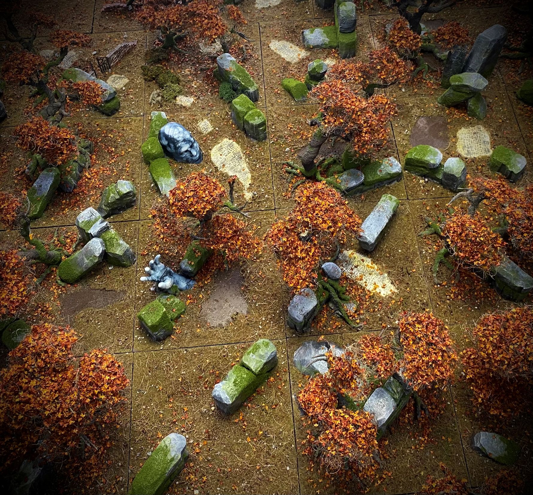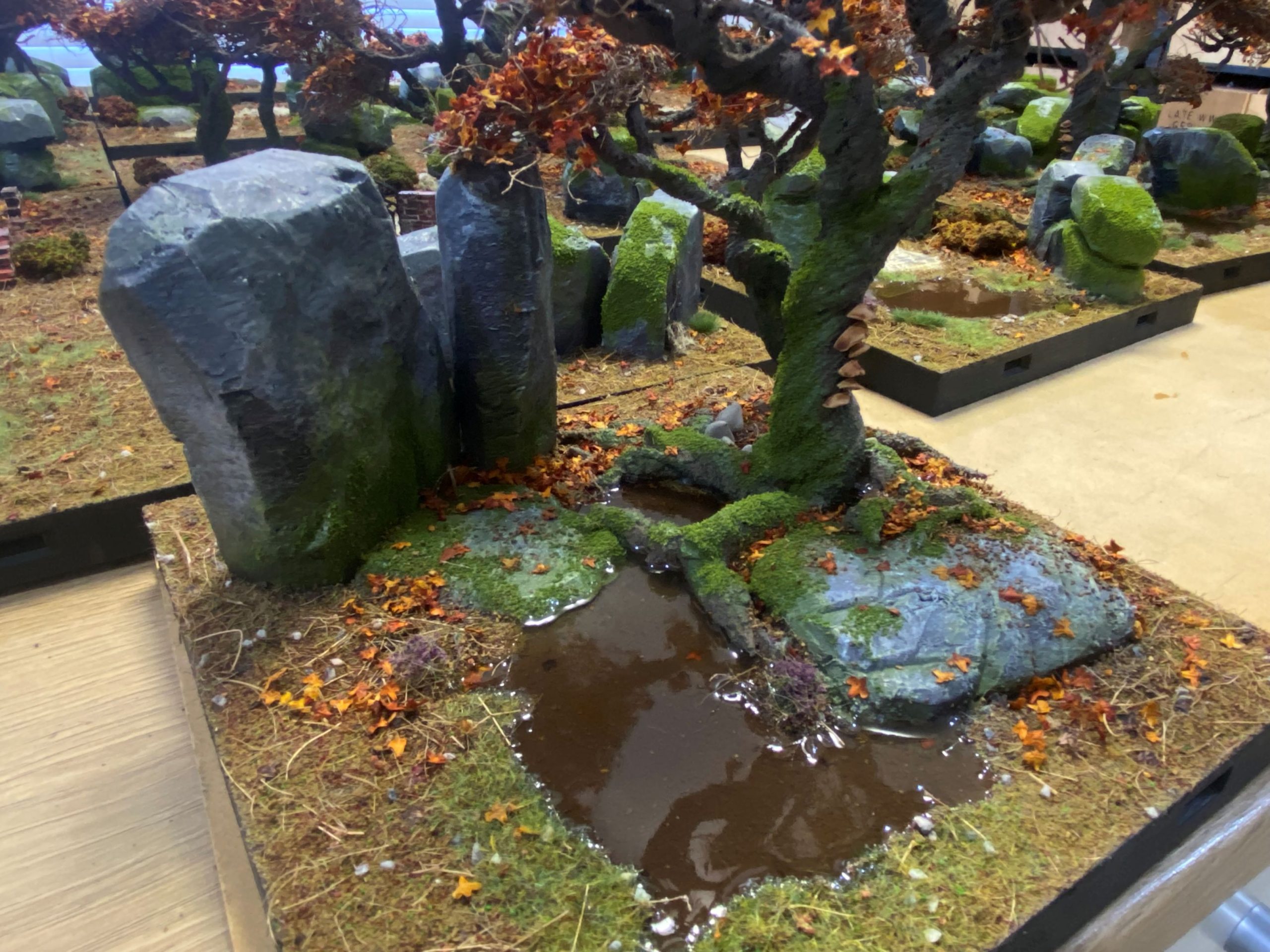 I am quite happy with how it looks from figure height. The rocks and bushes really break up the lines of sight nicely and create lots of hiding spots, whilst the tree canopy gives the hint of trees, whilst still allowing access to move figures around easily.