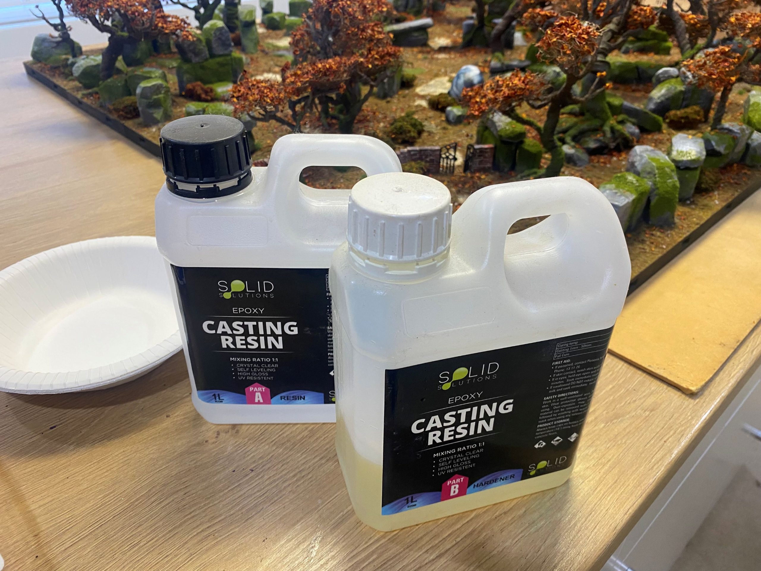 I have some resin left over from my Dungeon Terrain project. It is a two-part resin where you simply mix equal parts together. I added some Citadel Agrax Earthshade to the mix to give it a bit of depth.