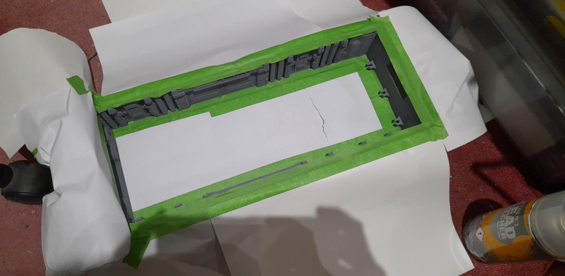 The interior had the same spray process. I then masked off the floor area and painted the walls with a bright white spray. The idea was to make it look like the interior of a rebel ship from Star Wars.