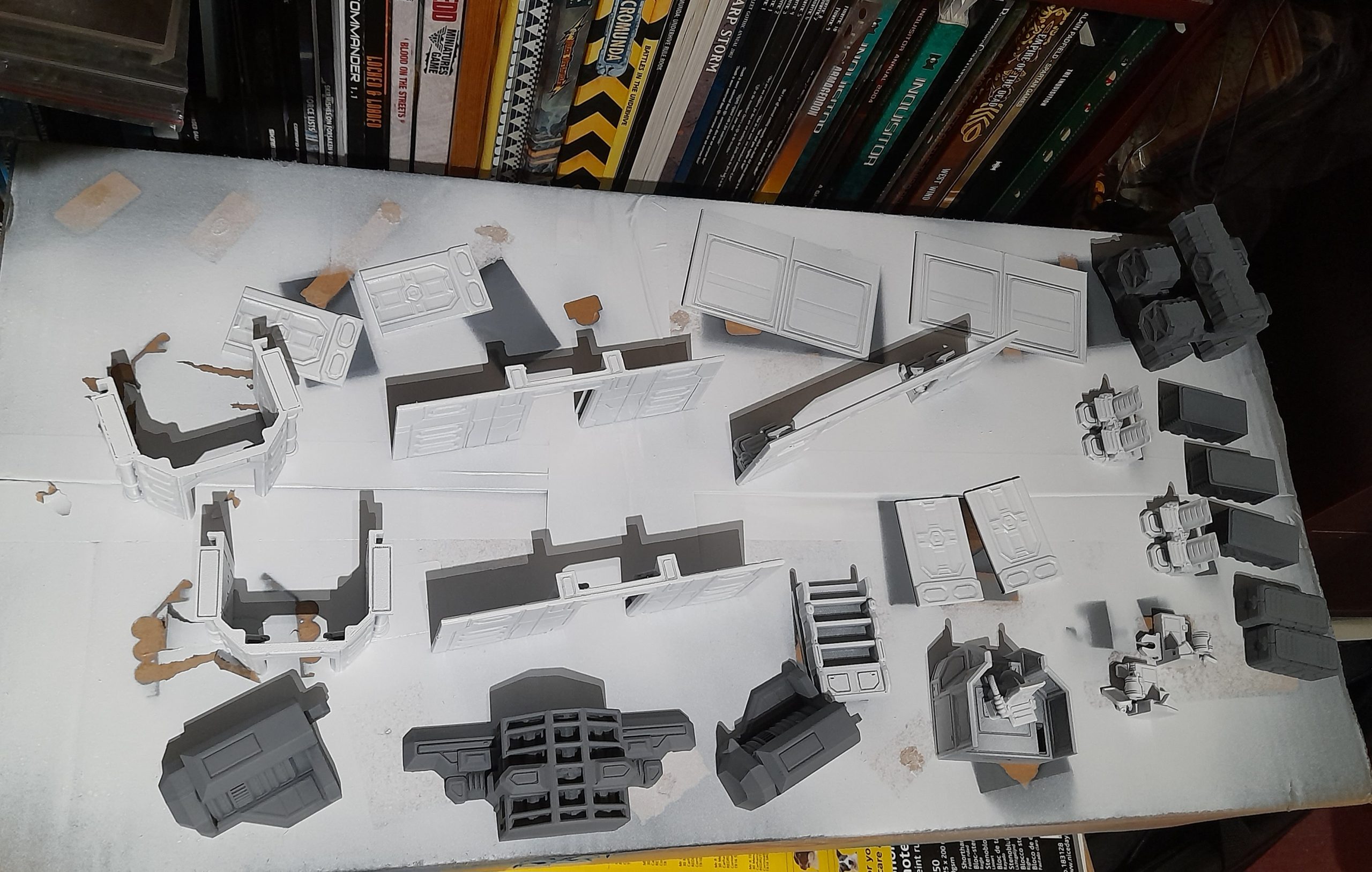 I have sprayed up the interior pieces in bright white, to match the aesthetic of Star Wars rebel alliance interiors, and primed the various crates.