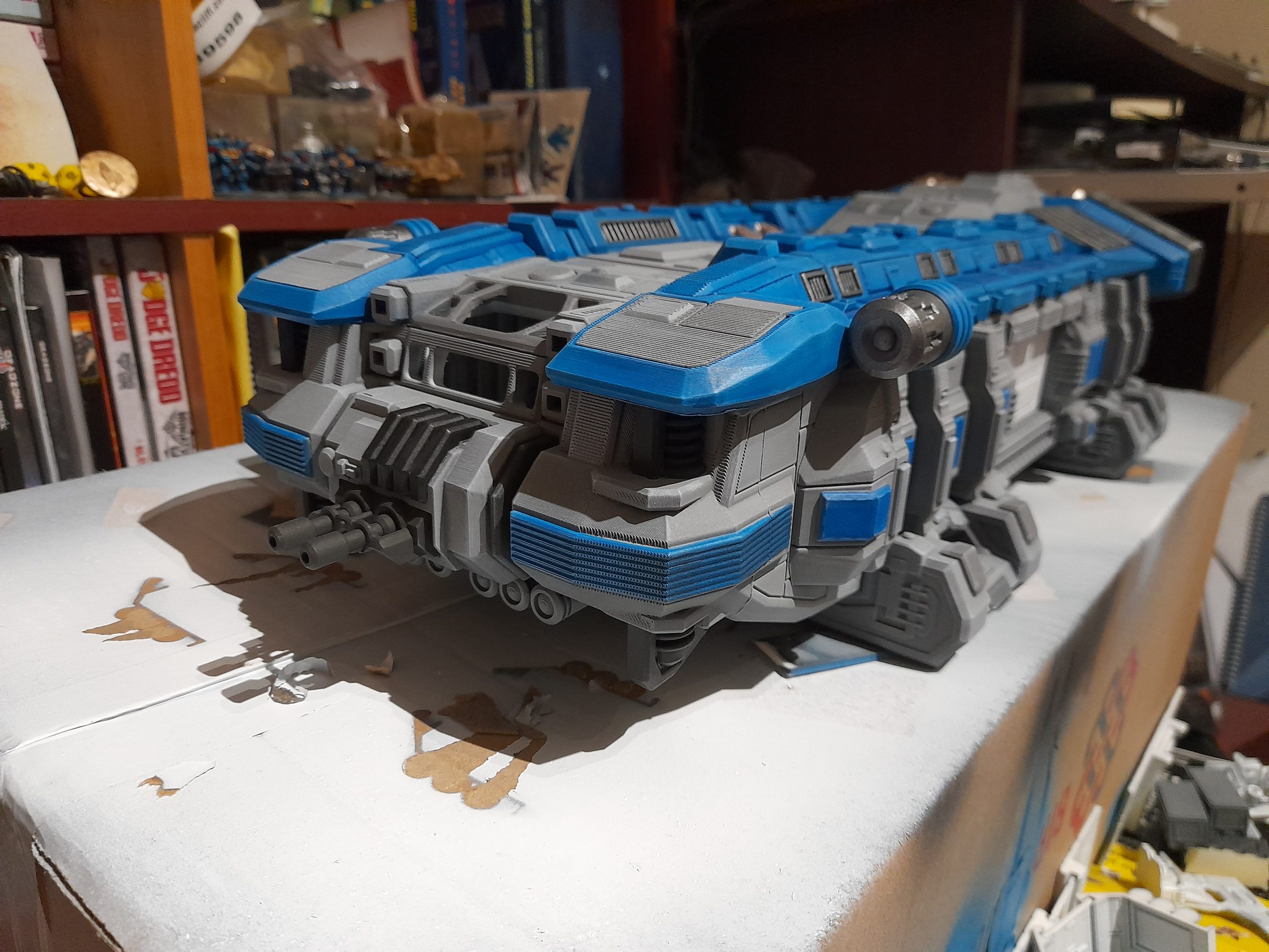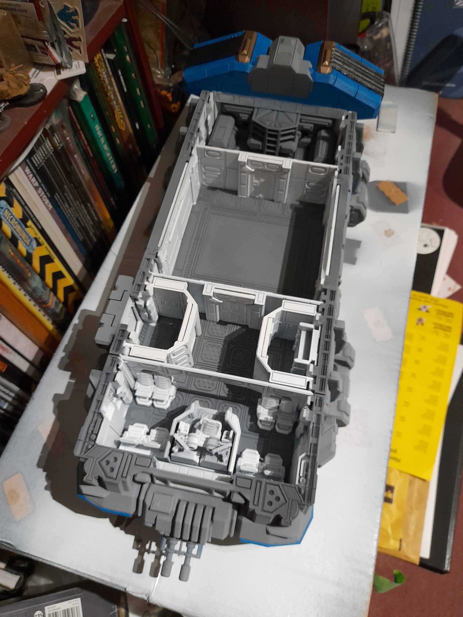 Then it was onto drybrushing all of the blue with a pale blue. Followed this up with painting in the darker blue panels, then picking out the vents with rubber black.