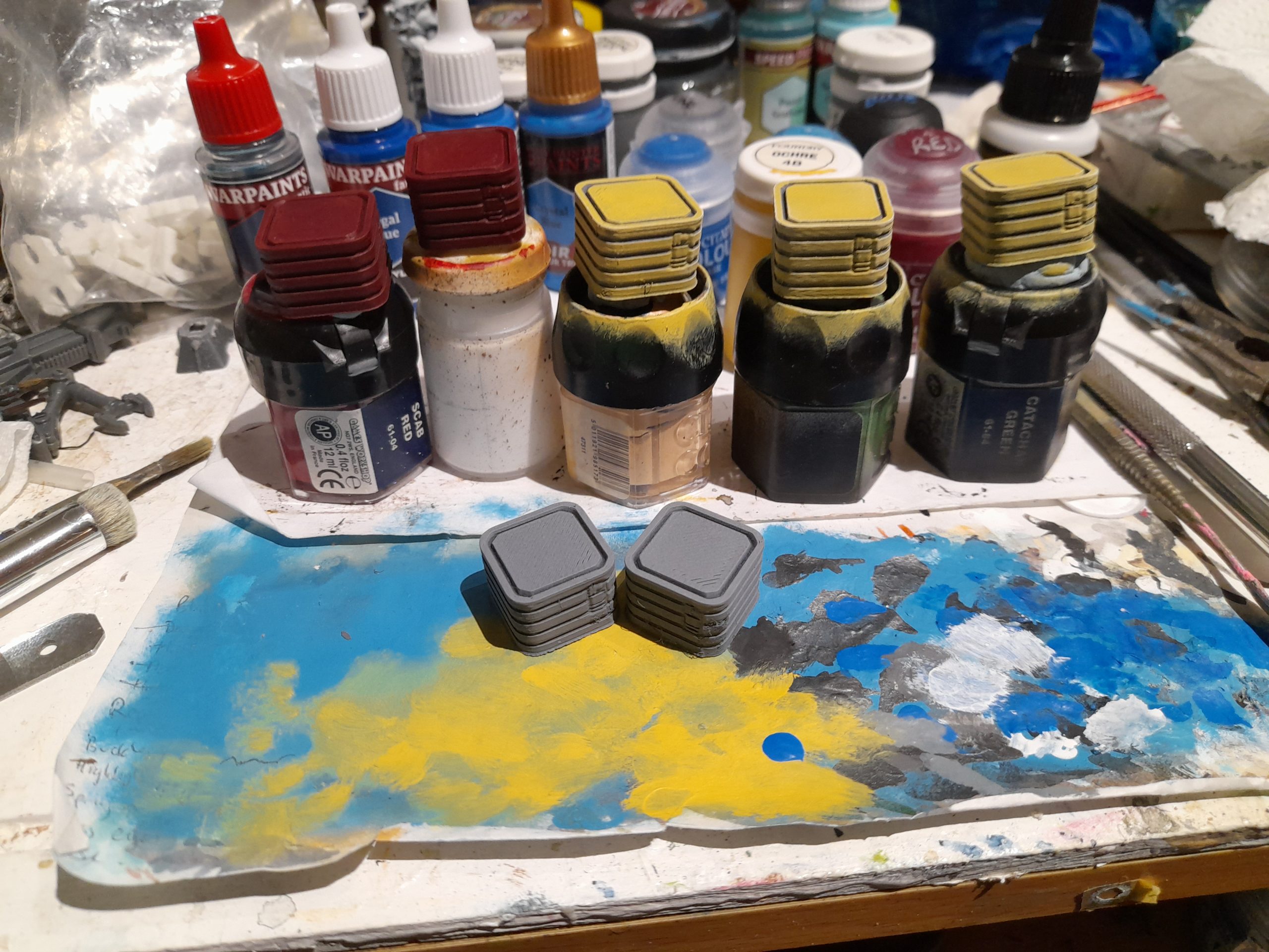 I then painted the floor sections between the walls and the hazard stripes in gun metal, washed with Nuln oil then drybrushed over with lead belcher.
