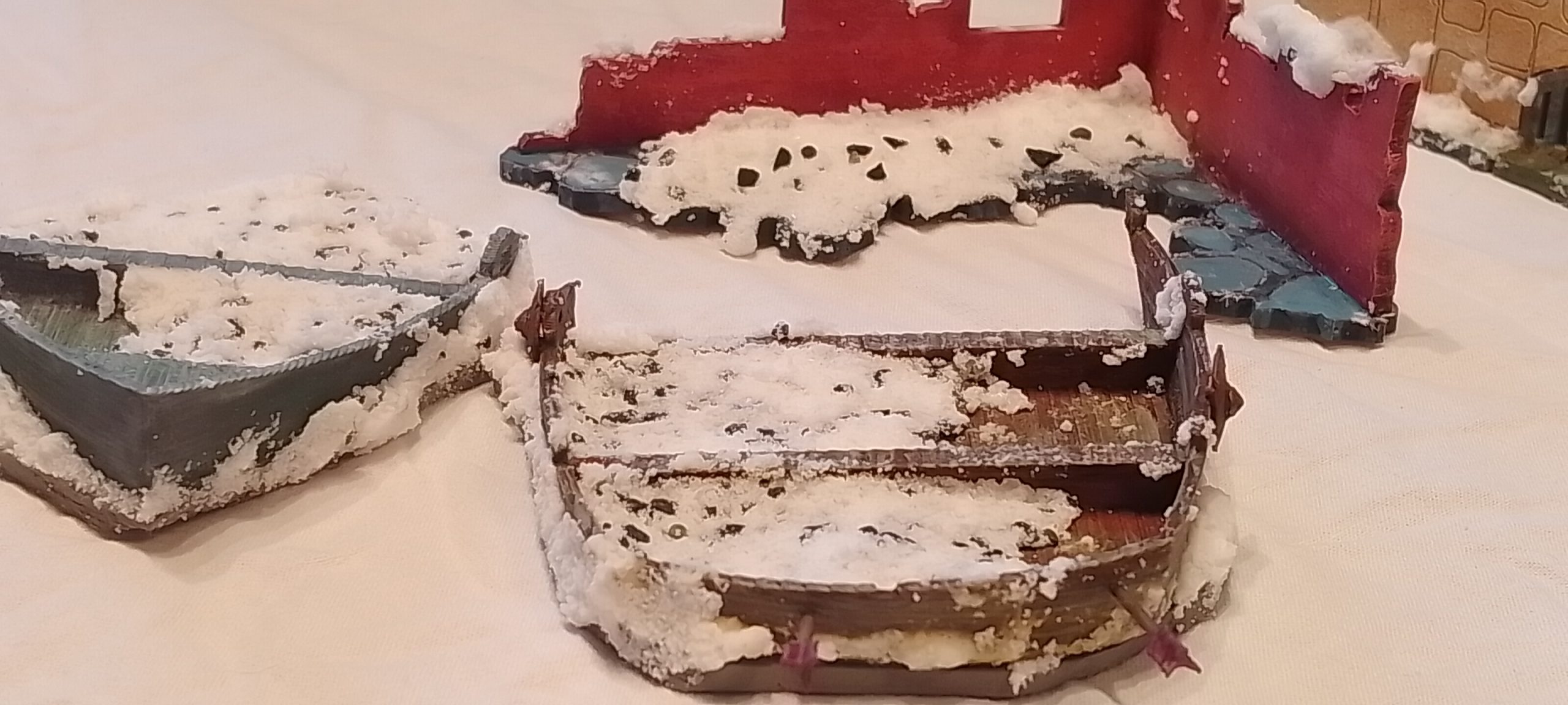 I have sourced two nice bits of mdf from the gatehouse kit to go on the boats halves. I did two separate looks one really Frosted and a creaky brown one to spread out the boat love on the tabletop.