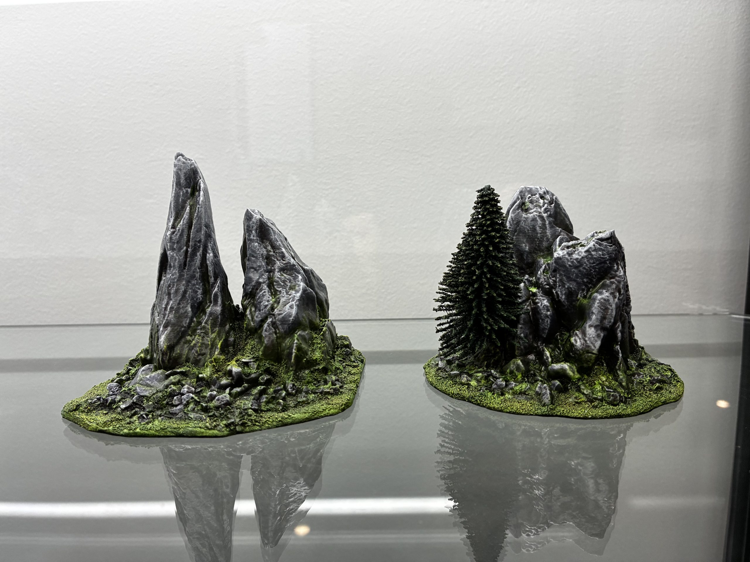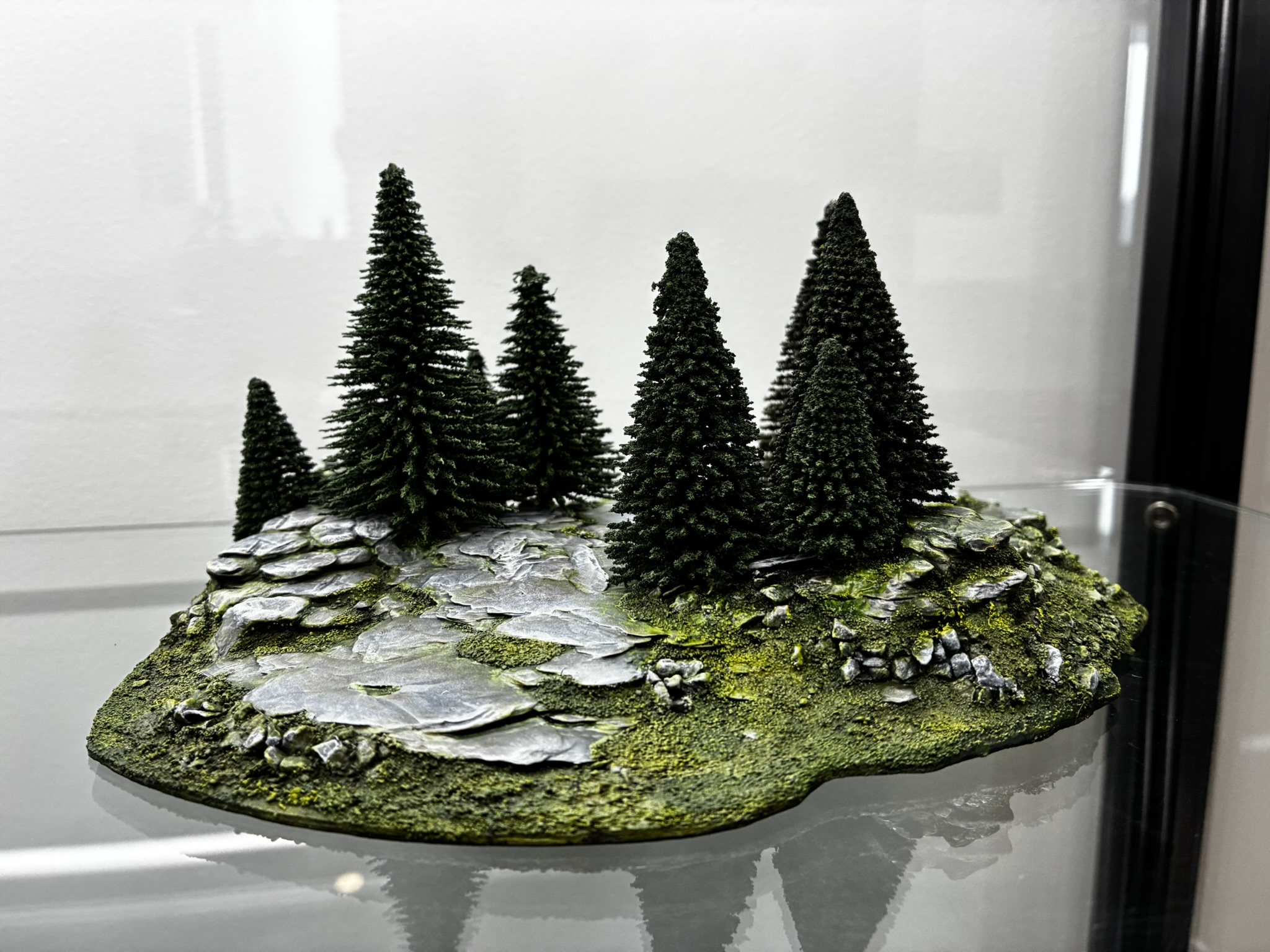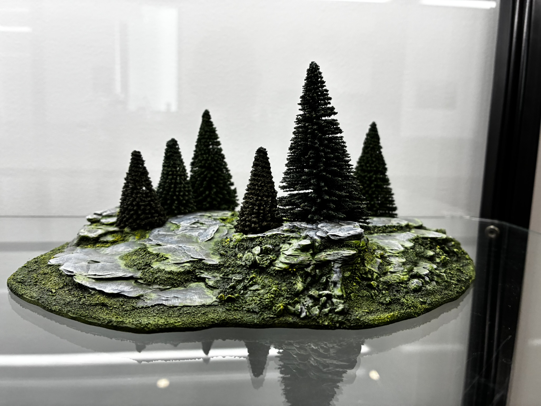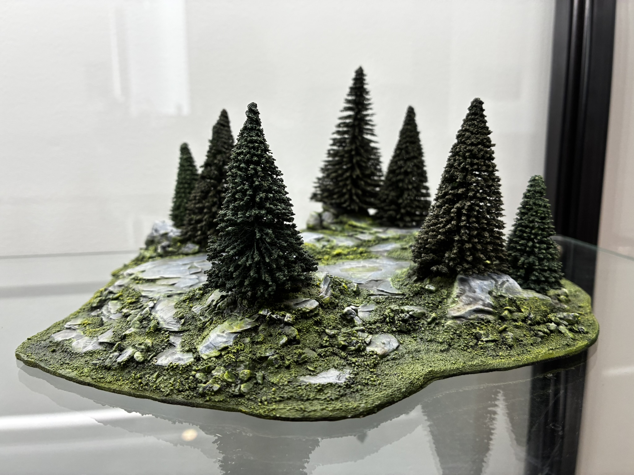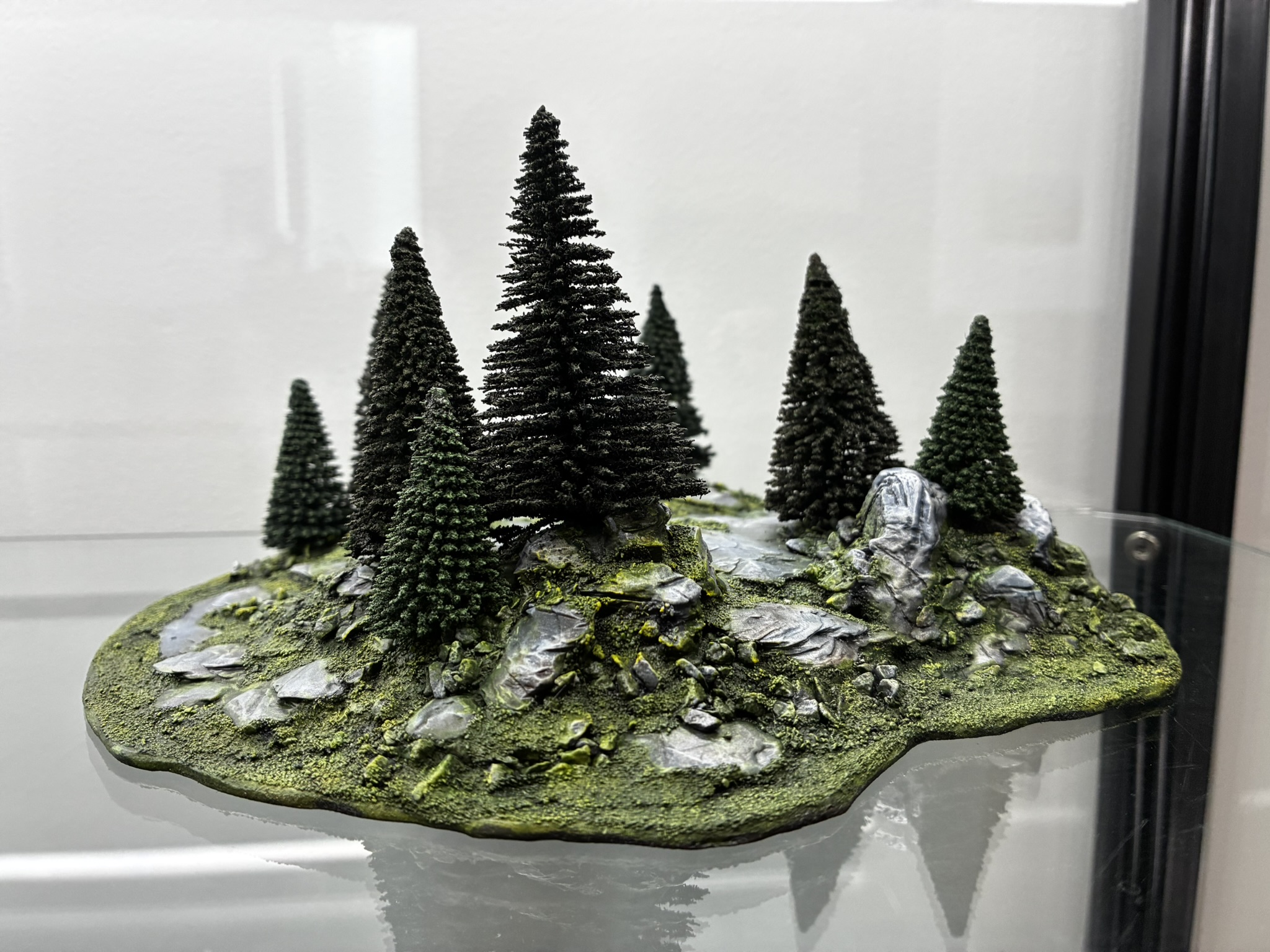 Intent with these forest pieces was to create functional area of effect terrain that provides cover benefit in game, while matching the rest of the table in style. The principle was the same as for previous pieces, where each forest involved combining multiple rock STL files into the desired shapes then reducing the vertical axis of the file to essentially ‘squash’ the files creating flat areas. The trees were painted in subtlety different colours for variety.