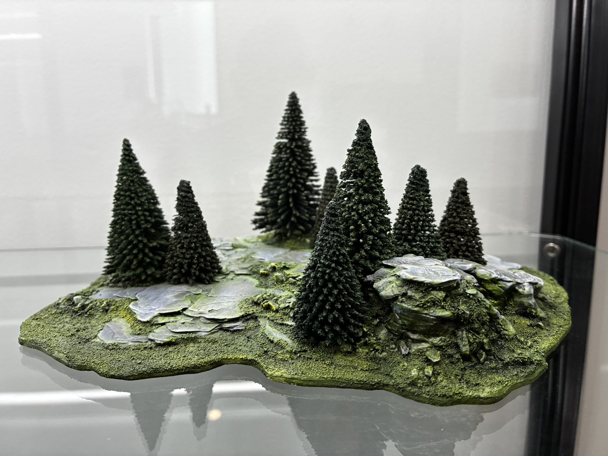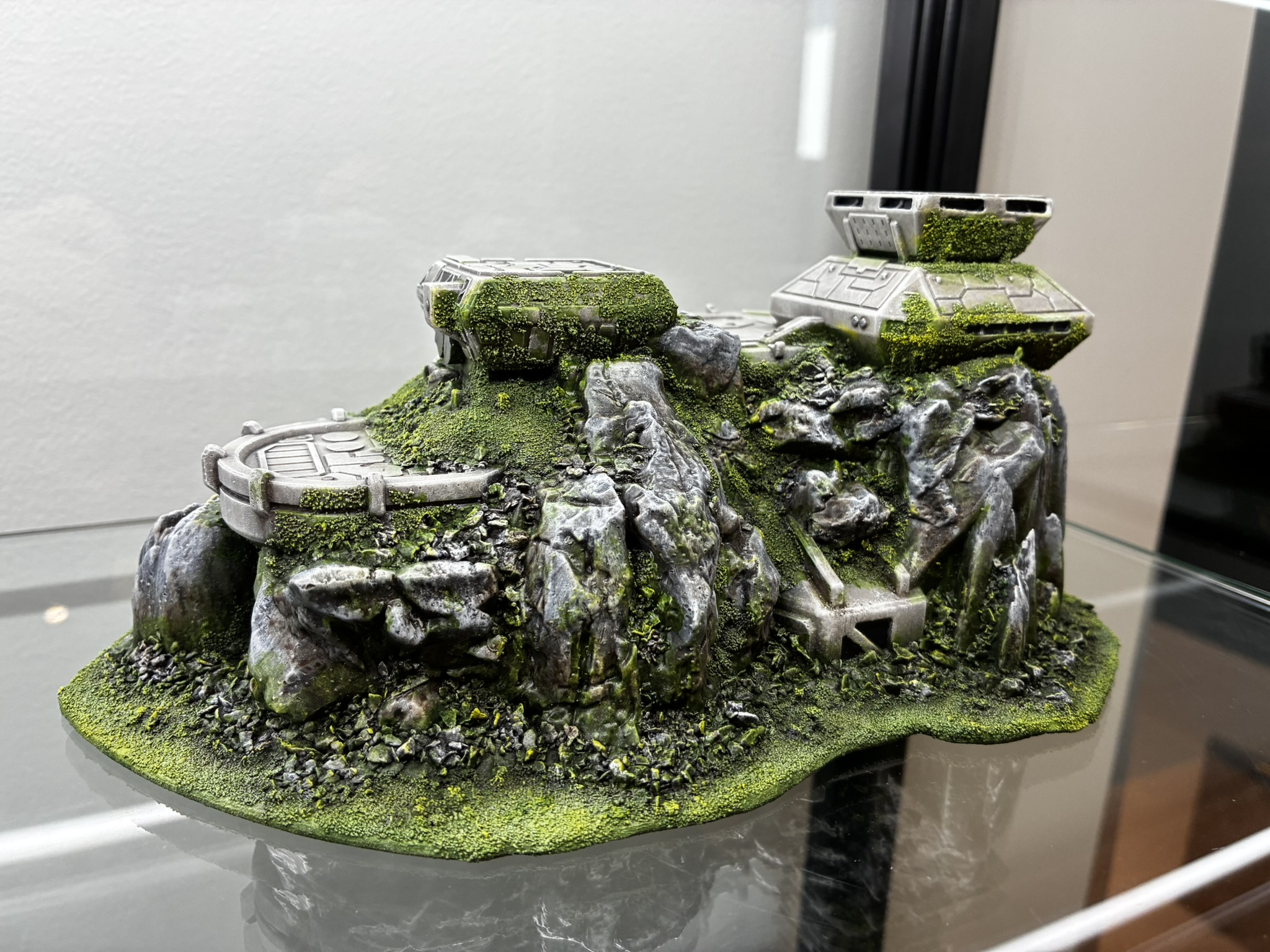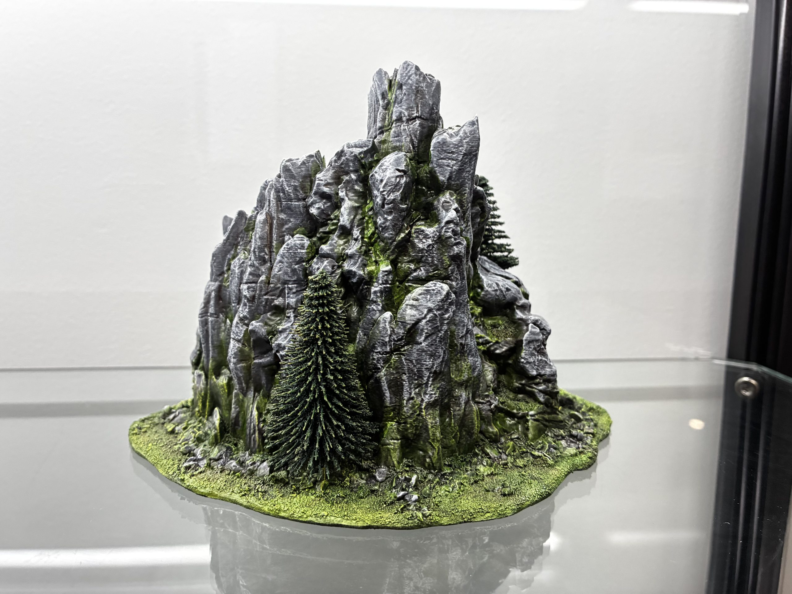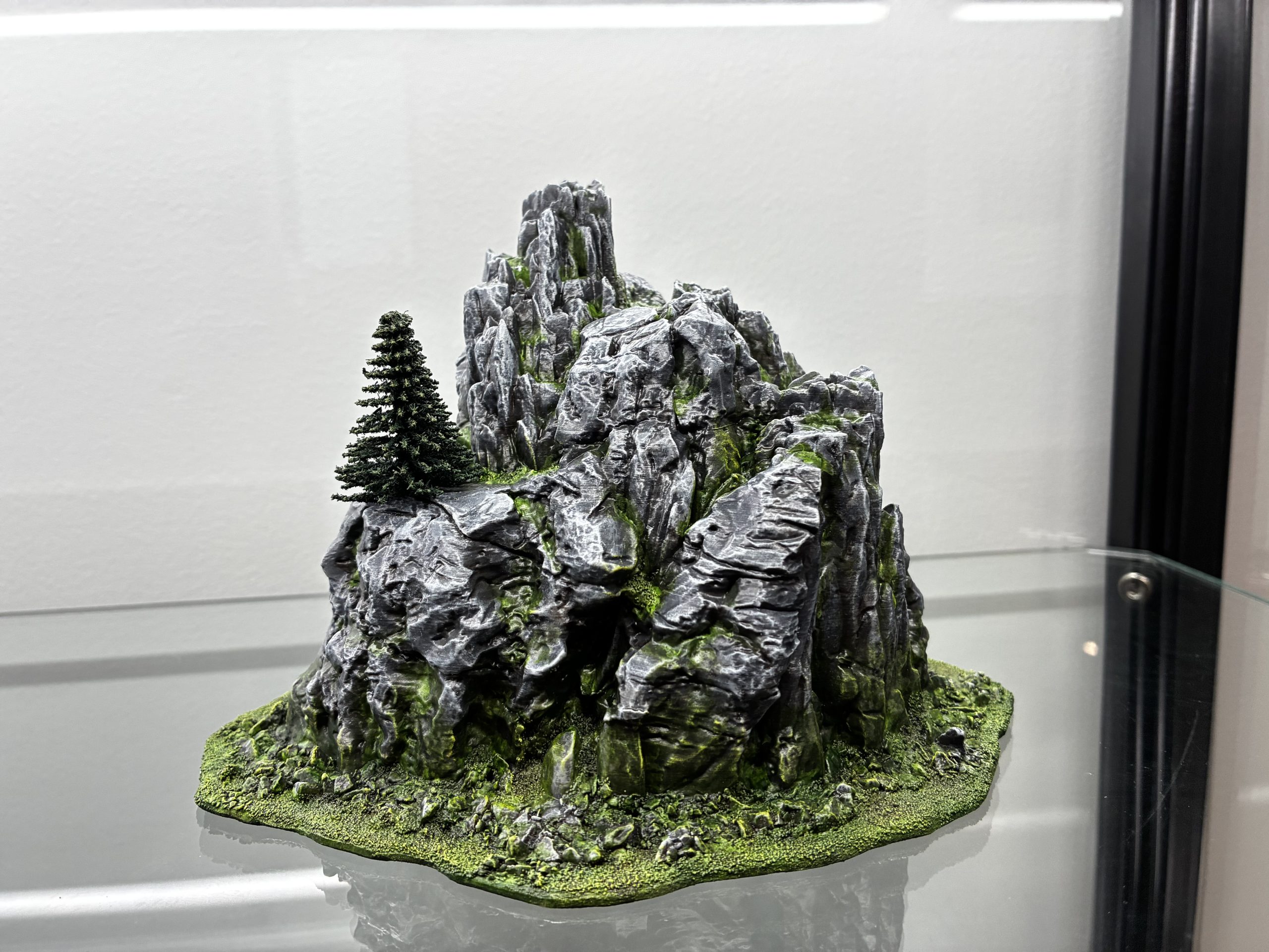 Intent with these forest pieces was to create functional area of effect terrain that provides cover benefit in game, while matching the rest of the table in style. The principle was the same as for previous pieces, where each forest involved combining multiple rock STL files into the desired shapes then reducing the vertical axis of the file to essentially ‘squash’ the files creating flat areas. The trees were painted in subtlety different colours for variety.