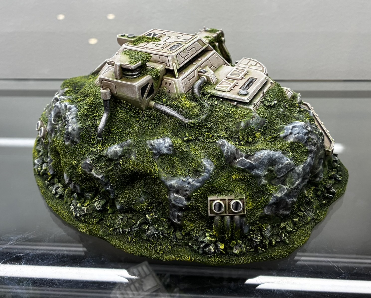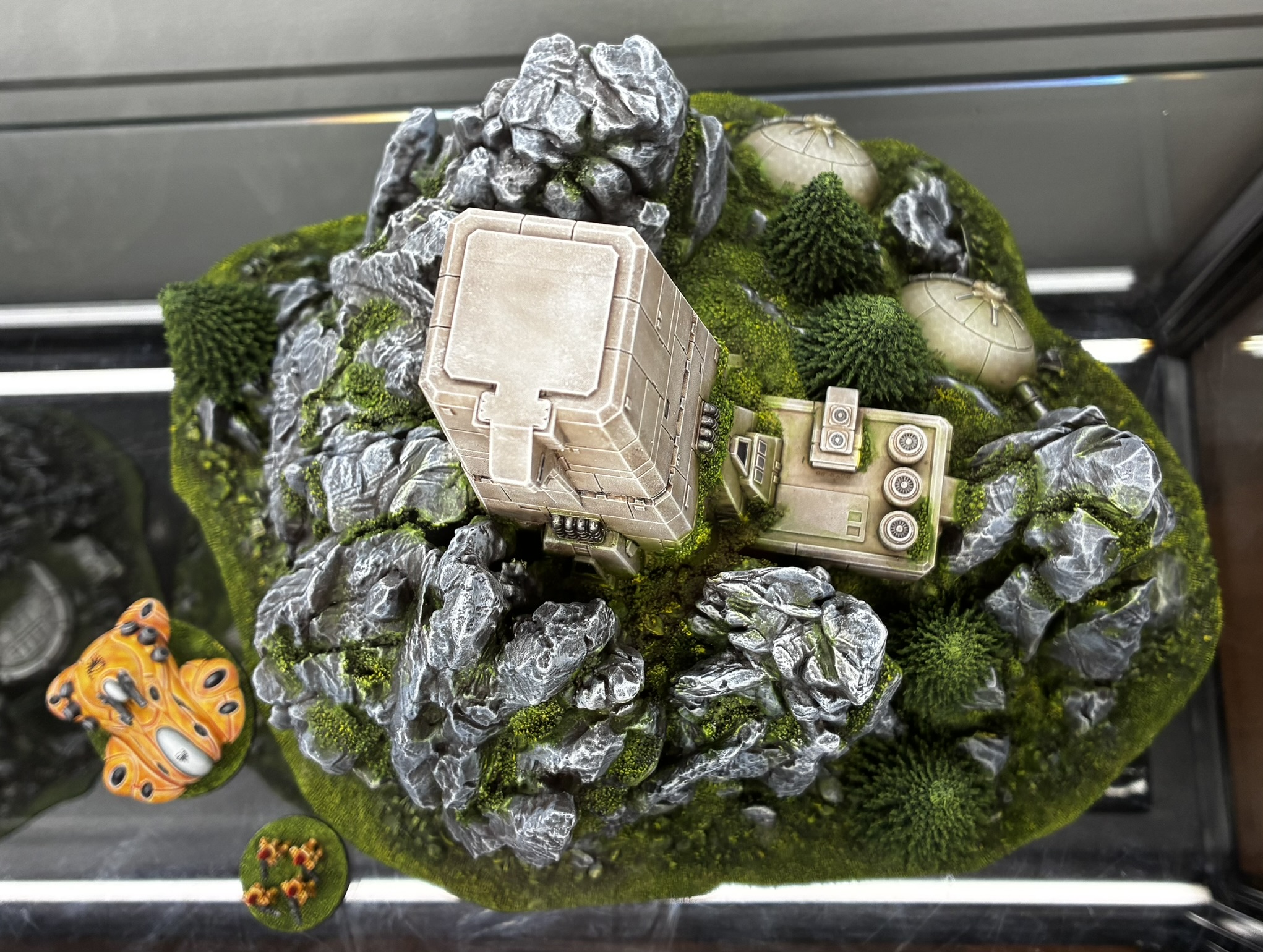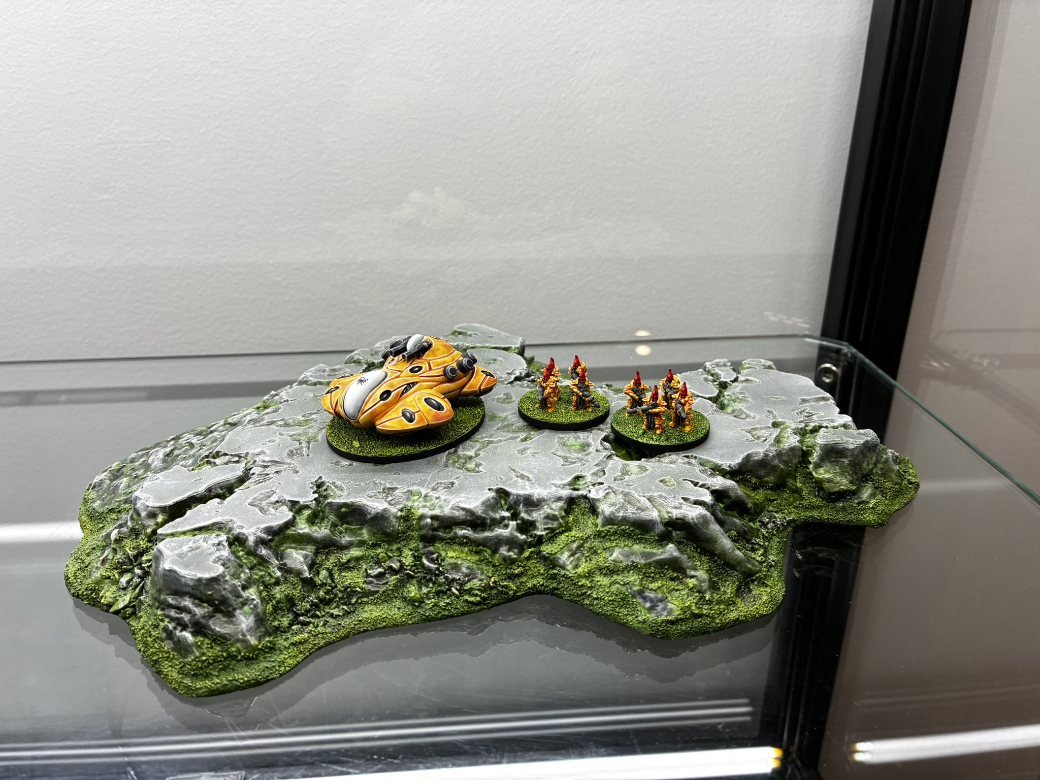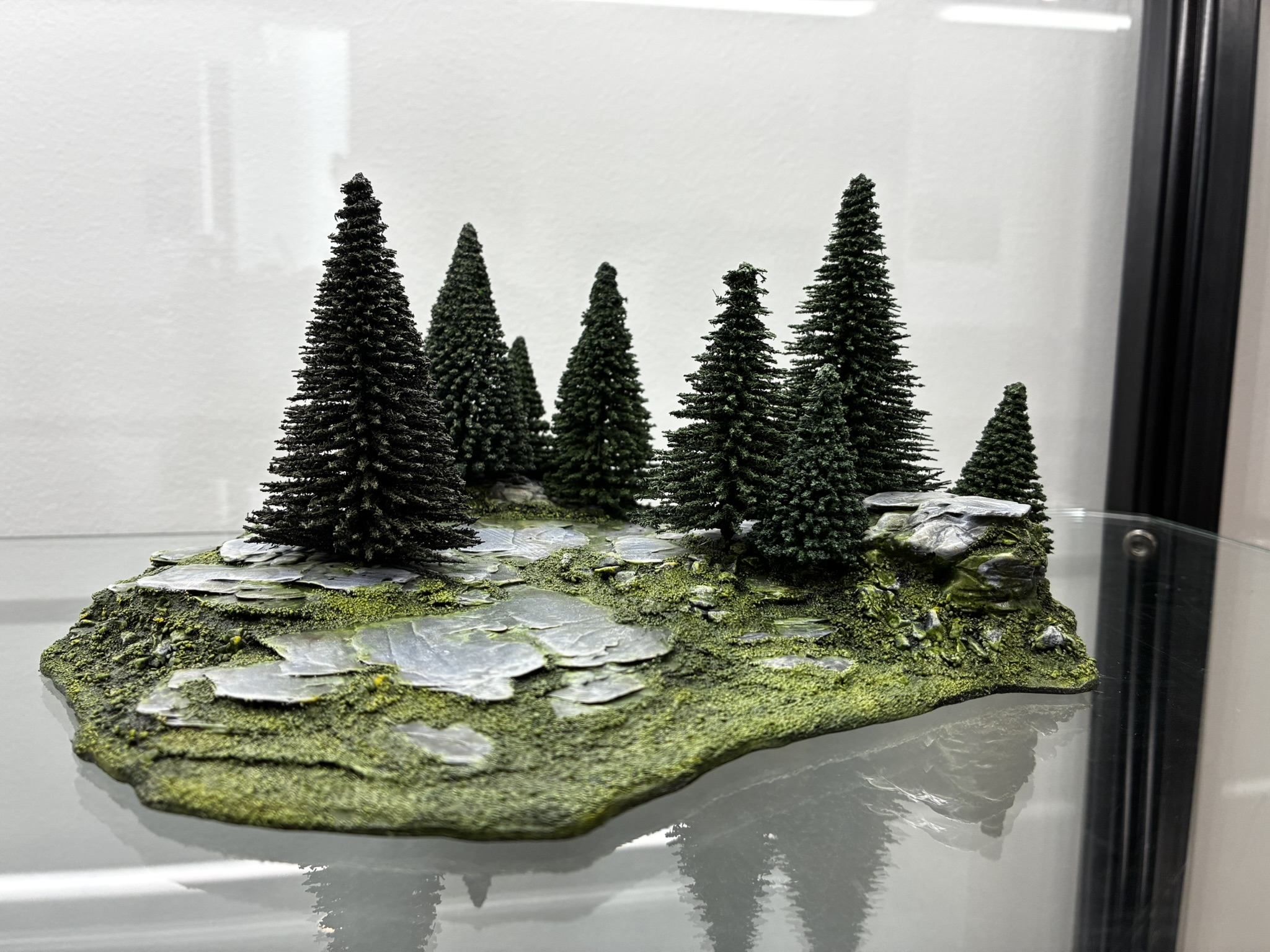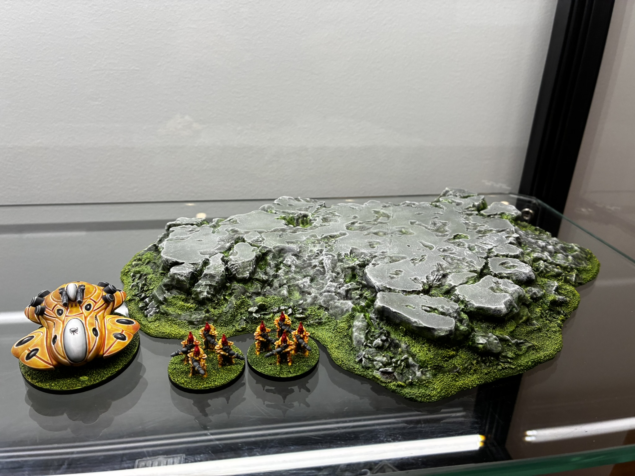 Intent with these forest pieces was to create functional area of effect terrain that provides cover benefit in game, while matching the rest of the table in style. The principle was the same as for previous pieces, where each forest involved combining multiple rock STL files into the desired shapes then reducing the vertical axis of the file to essentially ‘squash’ the files creating flat areas. The trees were painted in subtlety different colours for variety.