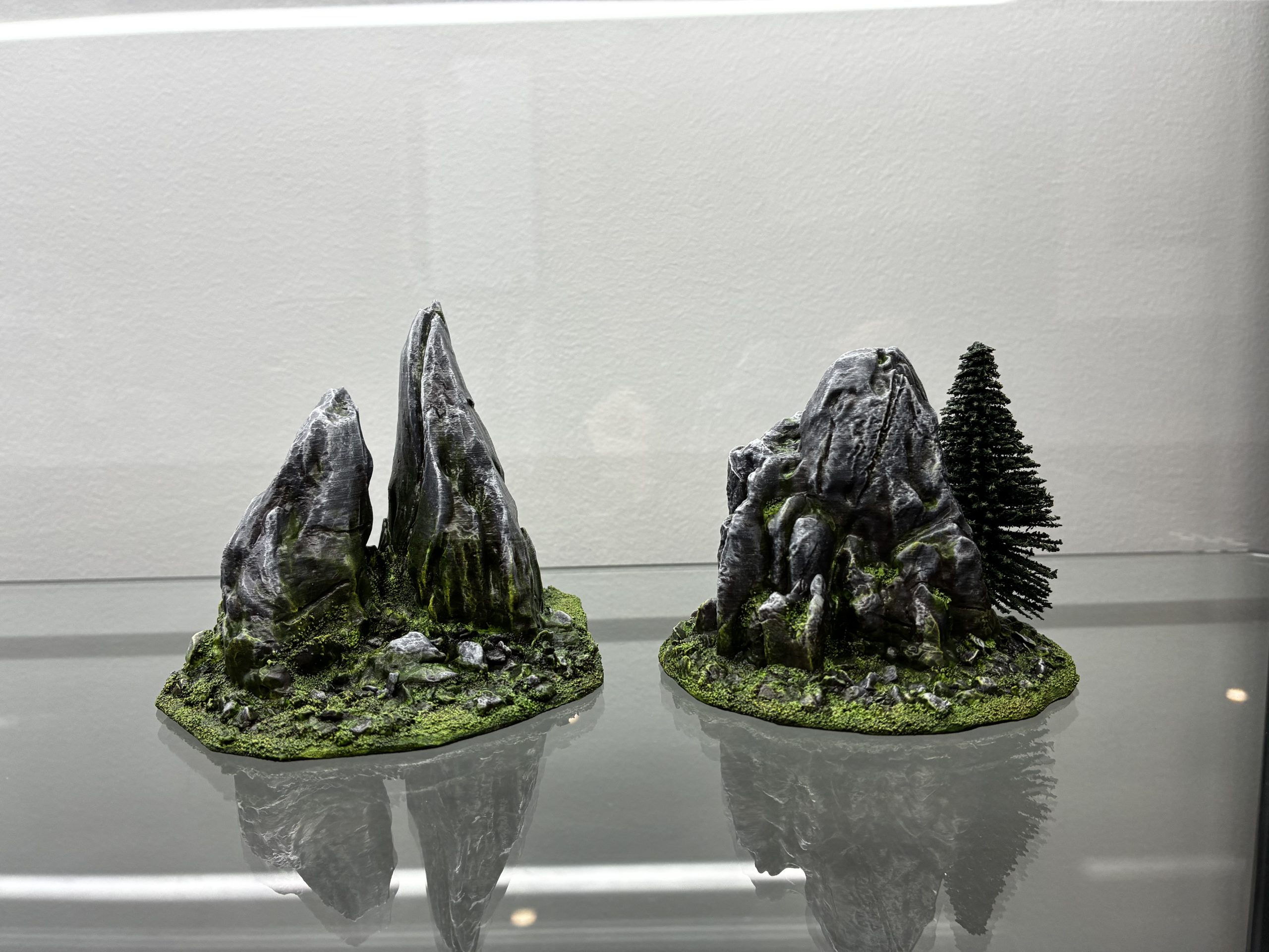 These are four rock outcrops of various sizes. Intent is that they will block los and force movement choices around them during the game while perpetuating the look and feel started with the buildings.