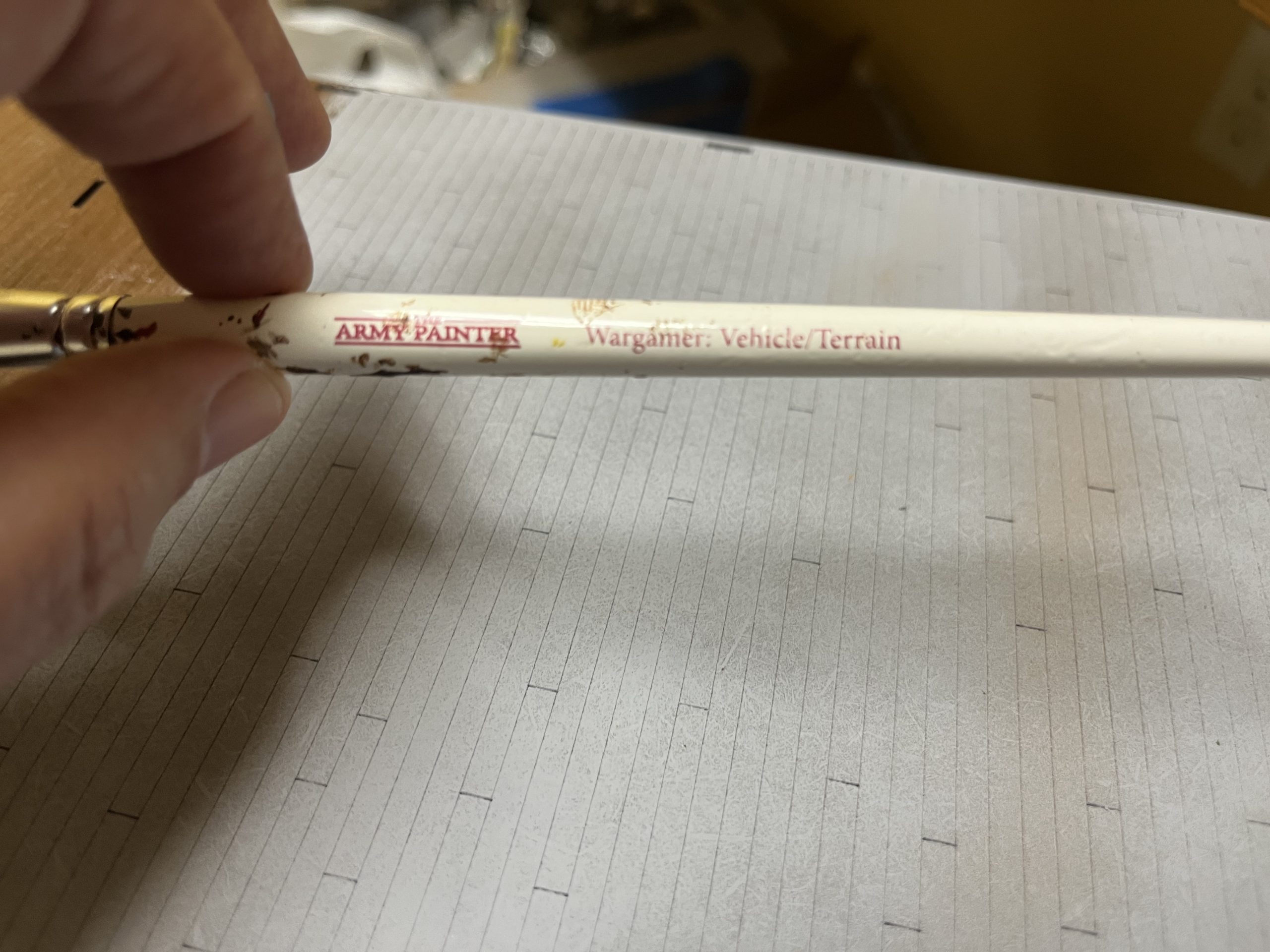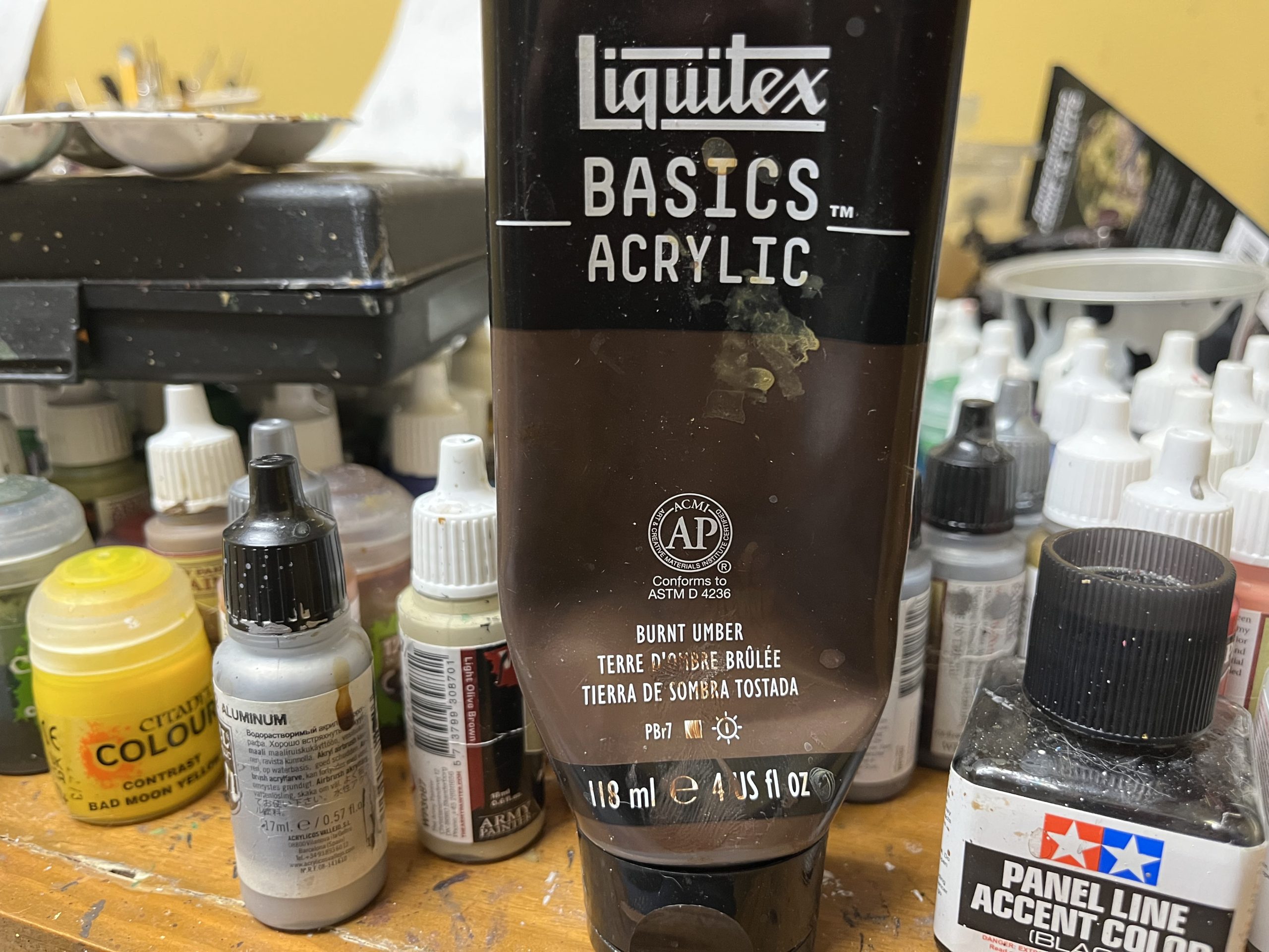 Liquids artists acrylic paints are incredibly cheap. Umber Brown makes a perfect choice to replicate unpainted wood. Paint it Gray