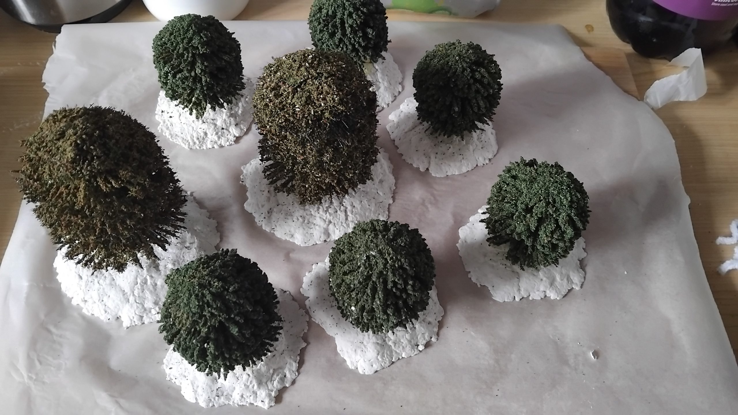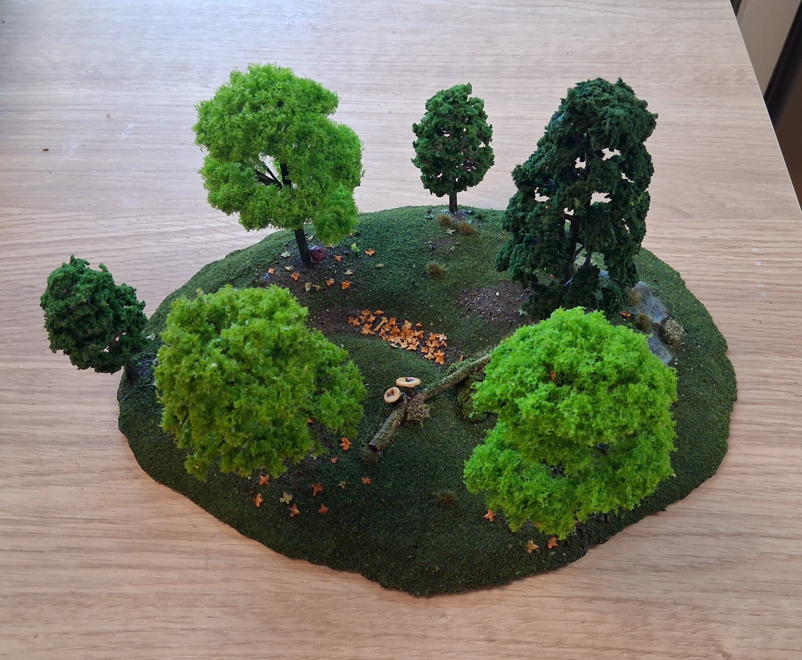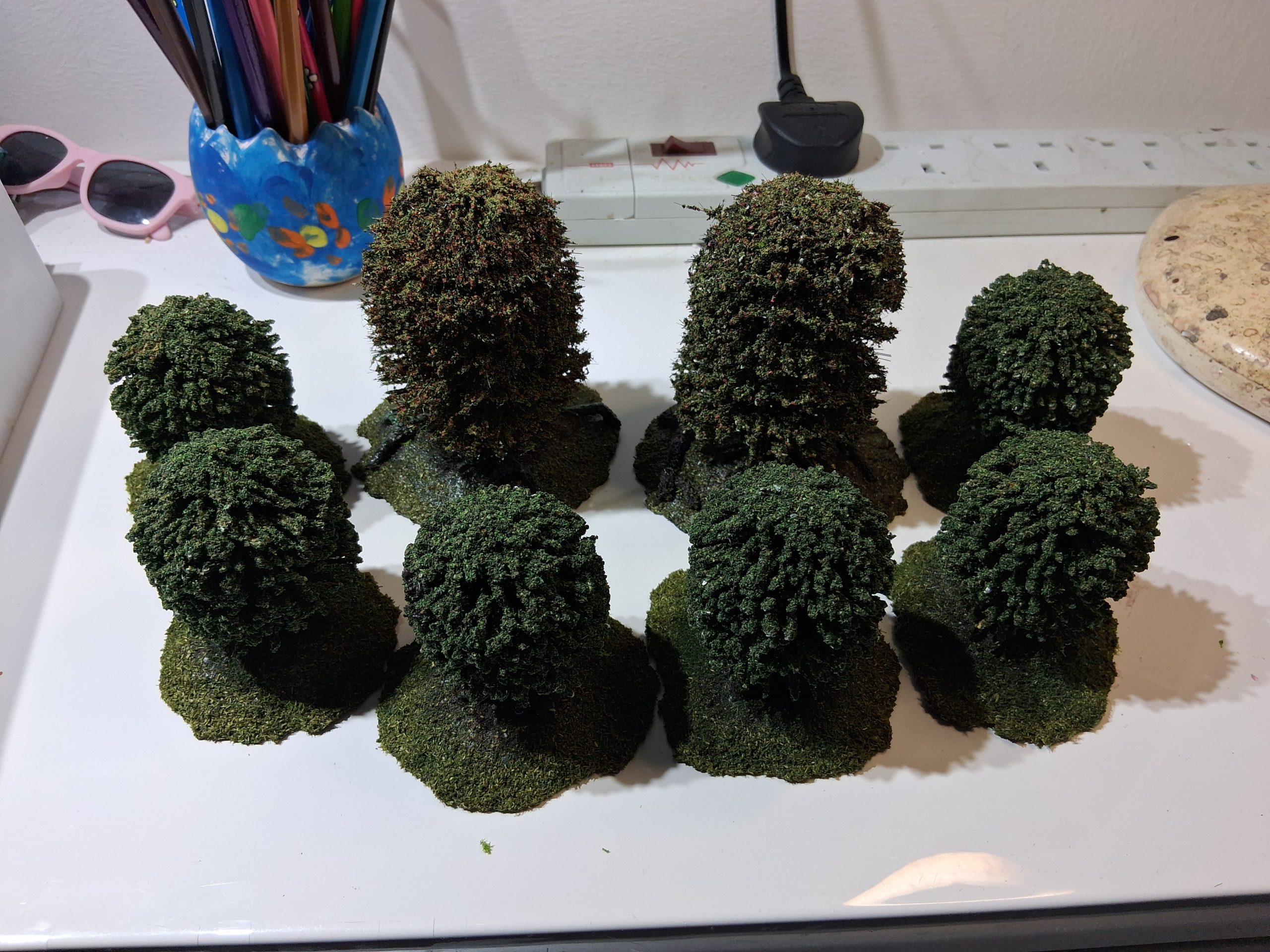I have produced a further 3 forest bases, with another 4 in various states of completion. I have figured out that I can produce 1-2 of these per week, the limiting factors being space and time. Because I am using sculptamold, they need to be left to cure for a few days and I don’t have a lot of space so I am limited to 2. I have started a sort of production line to try and workaround that. On any given week I will make one or two new bases and leave them to dry, then I will take the two from the previous week and finish them off; painting, flocking, detailing and adding the trees.