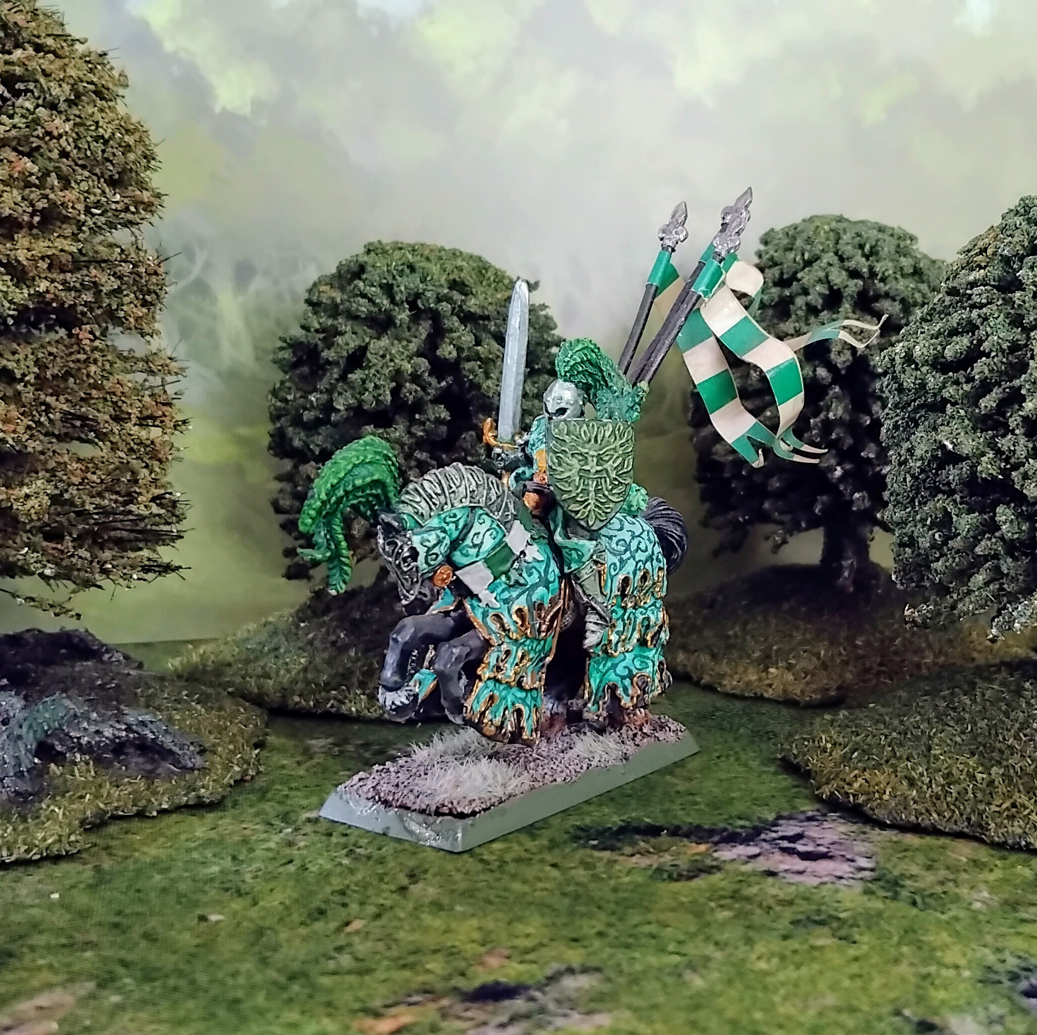 They were previously stuck to plastic miniature bases but I decided to make them look a bit more interesting. I made new bases for them using sculptamold which, when it was dry, was then painted dark brown and drybrushed with green. This really helps when you put the flock over the top, giving it a much more natural undertone and making any gaps in the flock less obvious. For the two larger trees I also made some roots out of pipecleaners that I soaked in watered down brown paint and PVA glue. I then gave them a dark brown wash and a green drybrush, after they had been stuck to the base. As you can see from the pictures, I used flock rather than the fine turf I now use. These were very much a first attempt and my personal opinion is that the flock looks to coarse, each individual grain seems to look to big and the end result looks a bit spikey. I do like these trees, they have a real old-school charm to them – I remember the pages of White Dwarf would be filled with pictures of battles that were full of things like this. I took the opportunity to photograph my very old, original metal Green Knight miniature among some trees. Because why not?