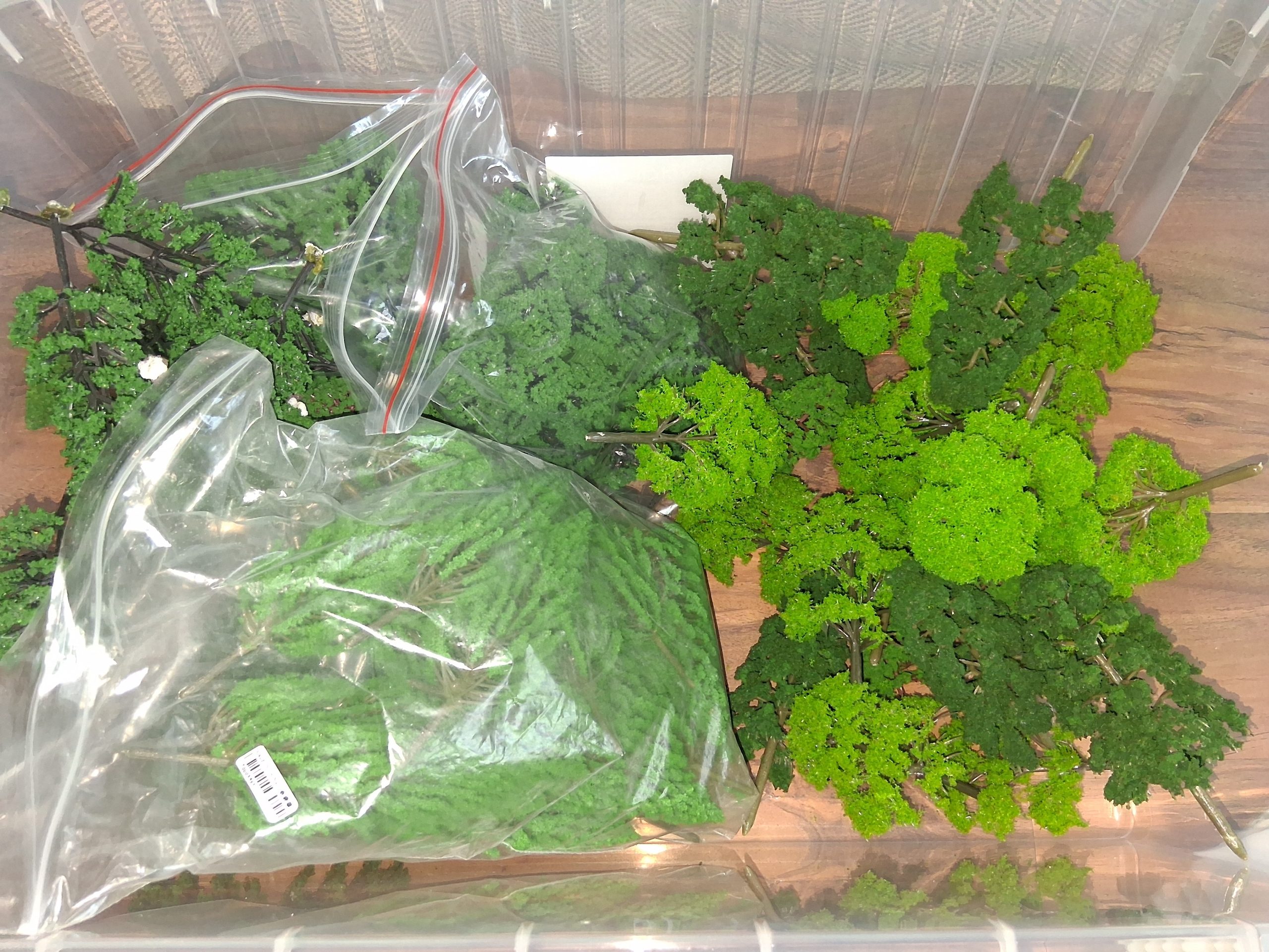 As well as the material shown, I am also going to need some trees. Lots of trees. I know that you can make these on your own but I have discovered that you can actually buy bags full of model railway trees from Wish and Temu and they work out at about £1 per tree. You will have to do a bit of work to some of them – notably spraying them with a PVA sealer to stop the foliage falling off – but you can’t really complain for the price. I currently have a large selection of trees for making both “temperate” (Northern Europe) forests as well as some more mediterranean looking trees. I will be making forest stands for both themes