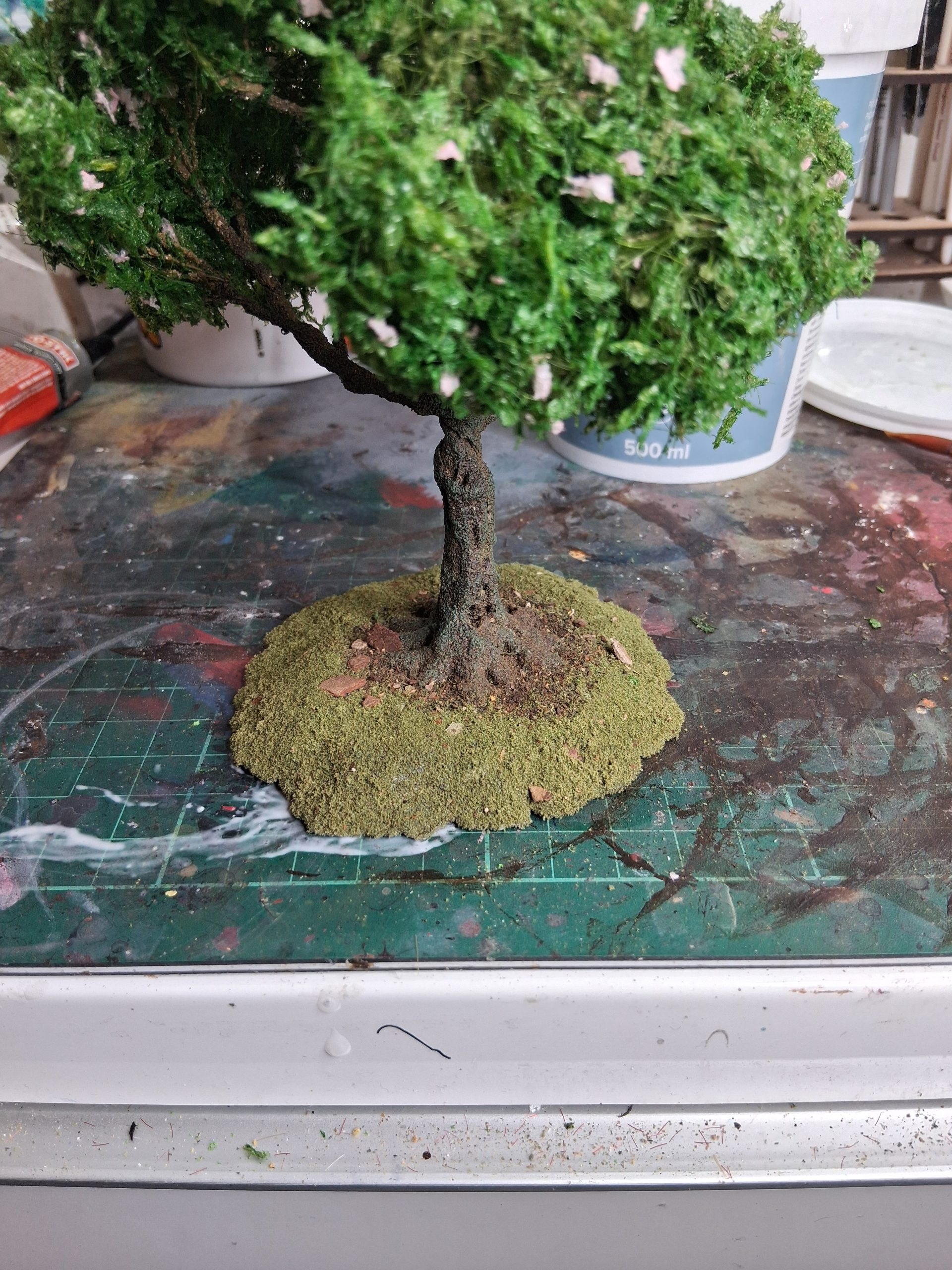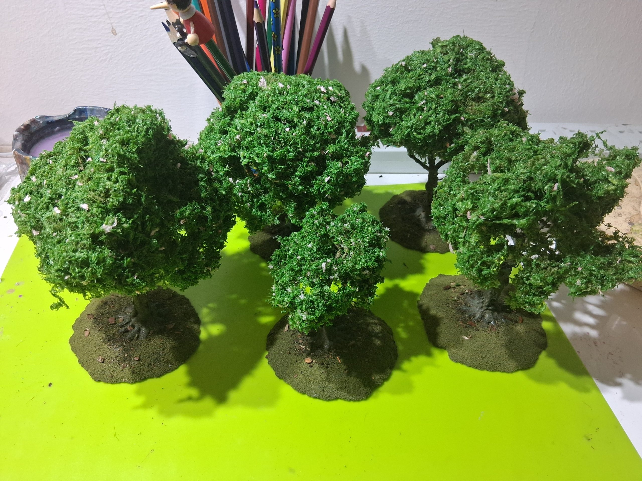 This post could almost be a “Spring Clean Challenge”. I found some really old trees that I purchase way back in the 90s. Some of them were beyond repair and had to be thrown away, however I did manage to salvage 8 of them – two large and six small. As they don’t really look like the other trees that I bought from Wish, I decided to make these into freestanding trees, rather than being part of a larger forest base.