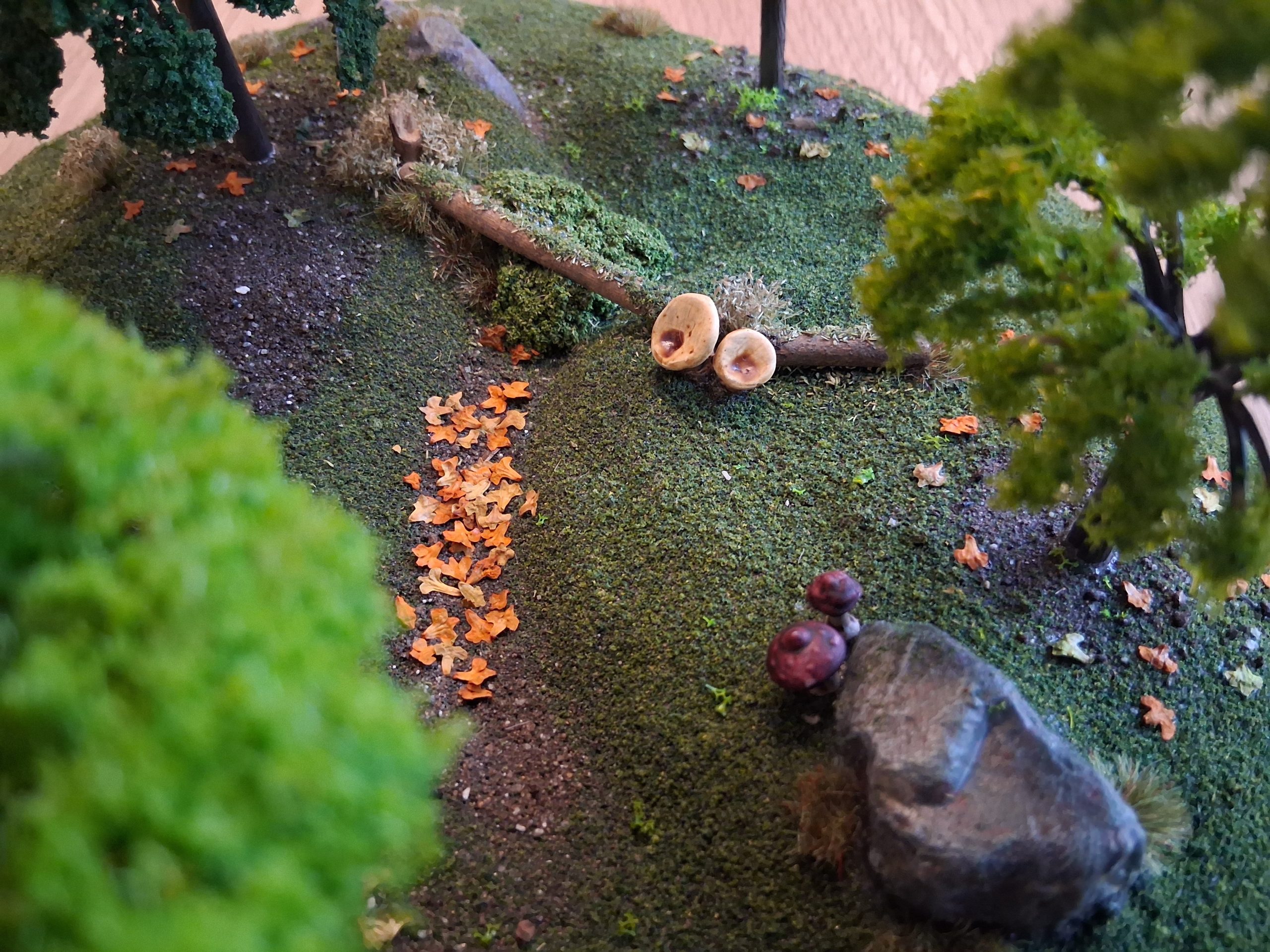 The next one I did I experimented a bit with relief, making one end of the base higher than the other and adding a small ledge. I also added a fallen log using an old twig, which I baked in the oven for 20 minutes to kill off any bacteria. I glued flock to the top of the log to look like moss and added some fallen leaves around the base of each tree. As with the test piece I added a couple of strategic Mushrooms.
