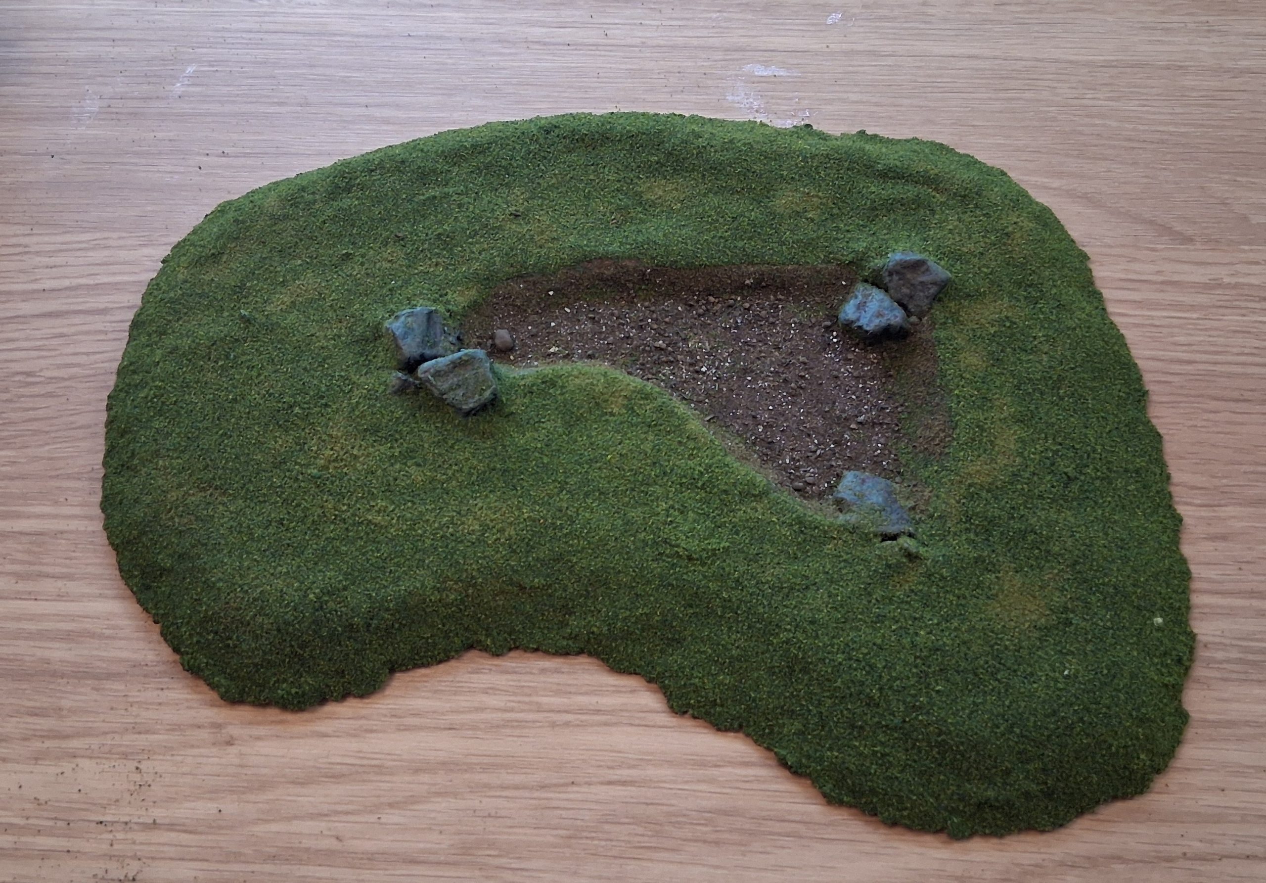 At present I have two reasonably large pieces that have been flocked and are ready to have trees etc. added to them. One of them will also have a small pond in the middle, so that will take some time to do with the water effects. The other has a much higher level of elevation than the others and has a small cliff face at one end and what will eventually become a hidden shrine at the end of a pathway that leads through the forest.