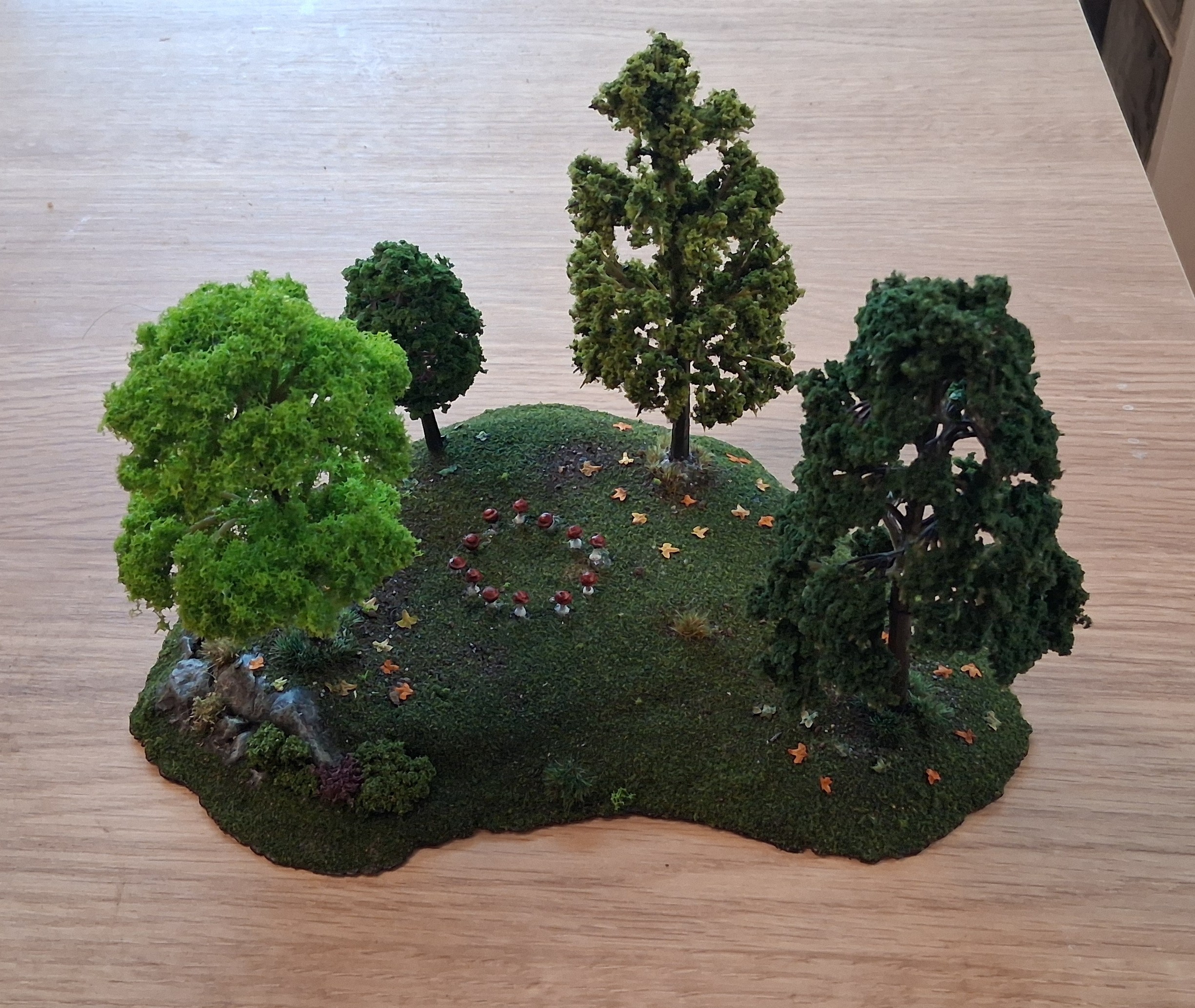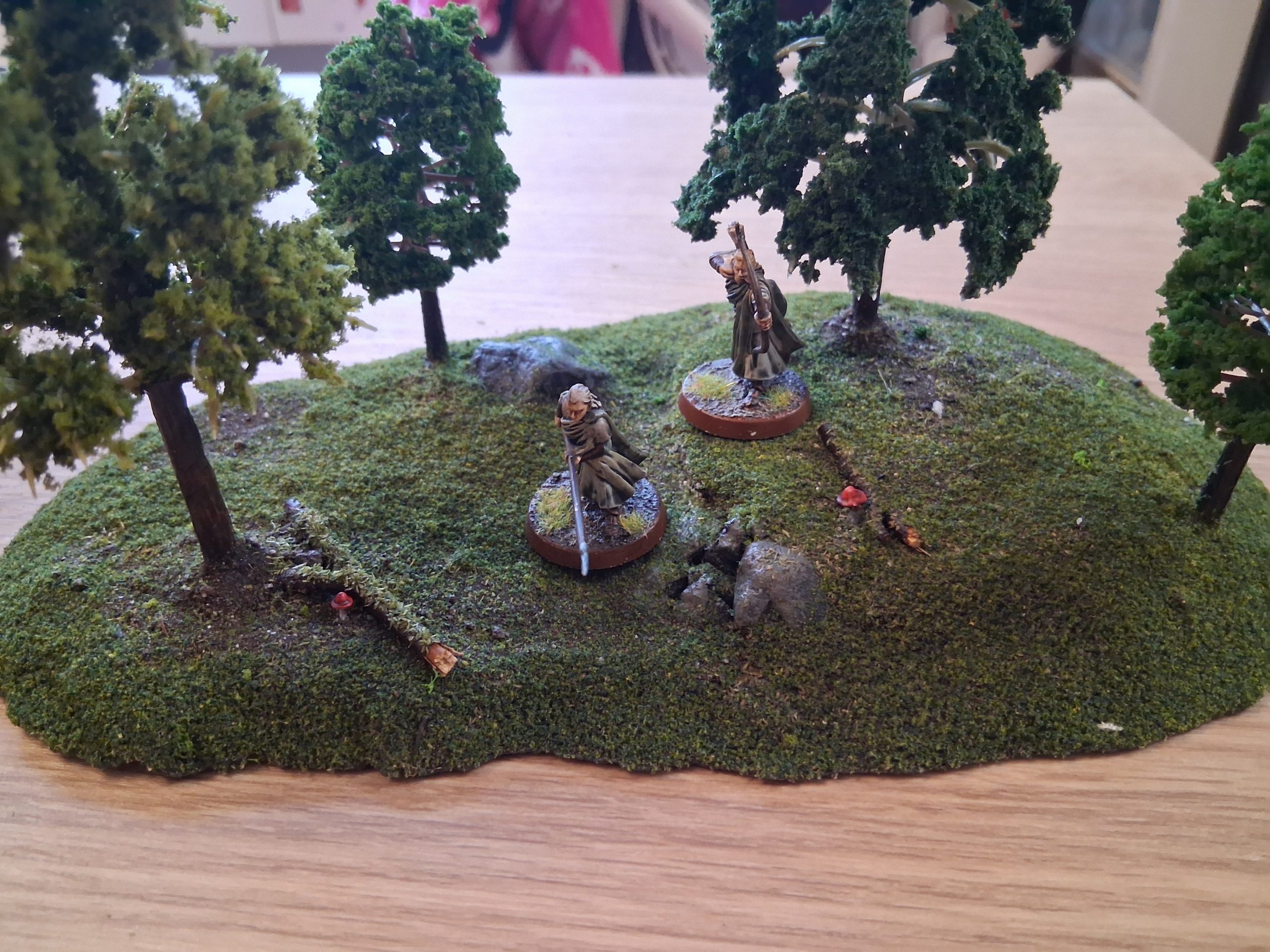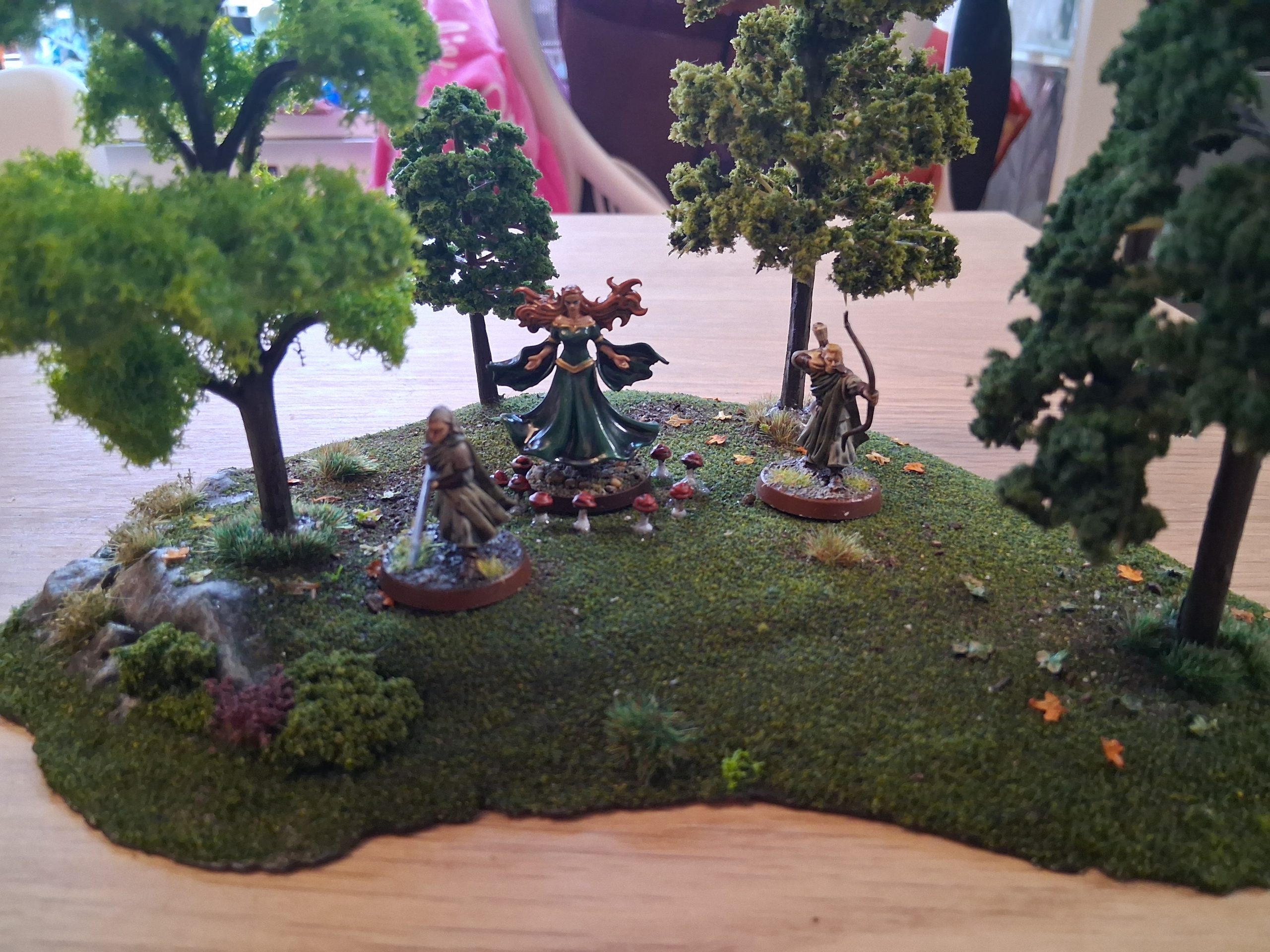 The first one is just a basic stand of trees, similar to the test piece. However I did decide to add a little fairy circle, or rather my daughter told me I had to add one. Either way it looks pretty good, and shown below being fittingly modelled by some middle earth wood elves