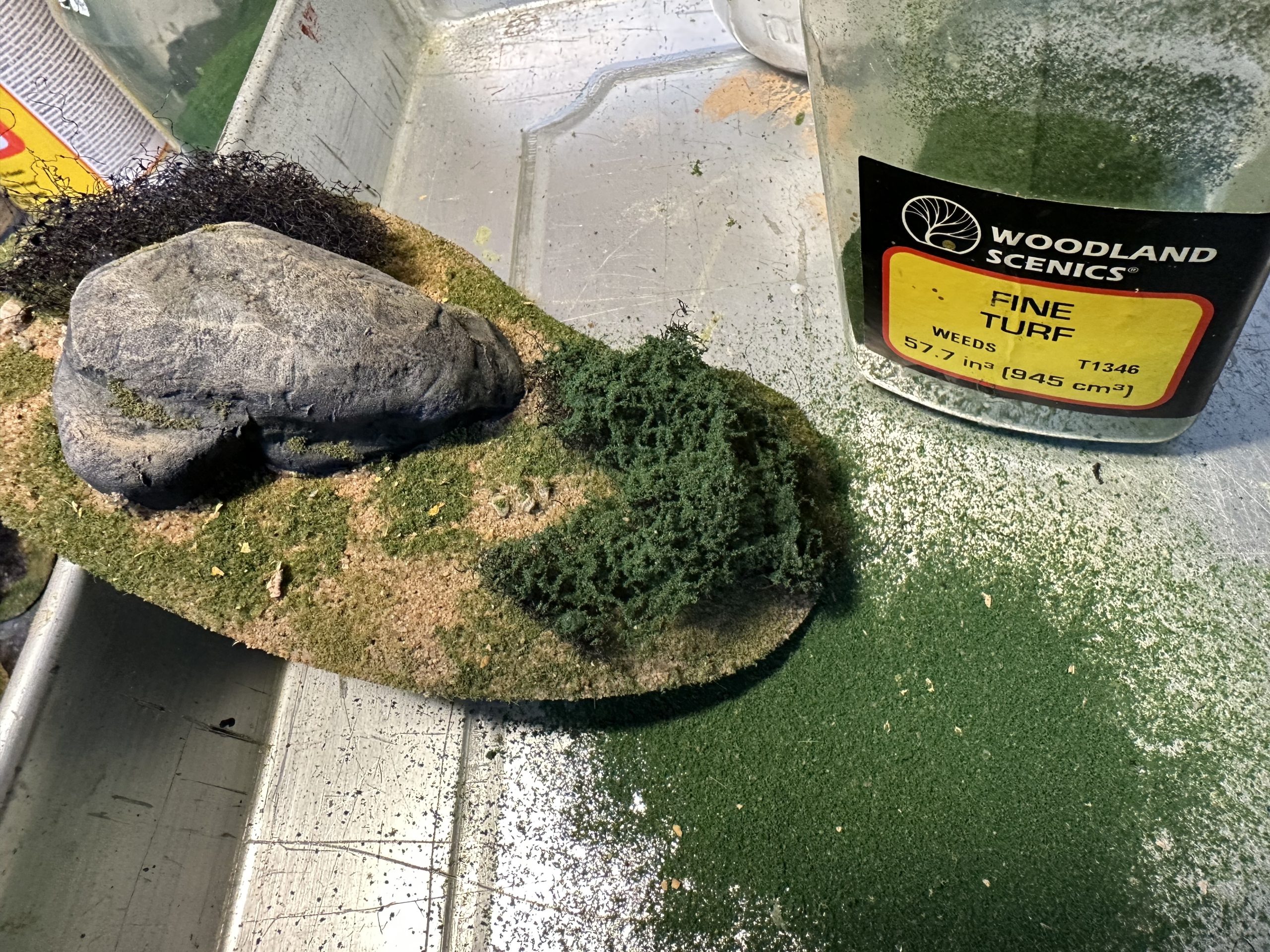 Once the flocking on the bases was dry, I added some small bits of clump foliage. Finally, I painted on more PVA and sprinkled on some medium grass 2mm static grass. This unified things nicely.