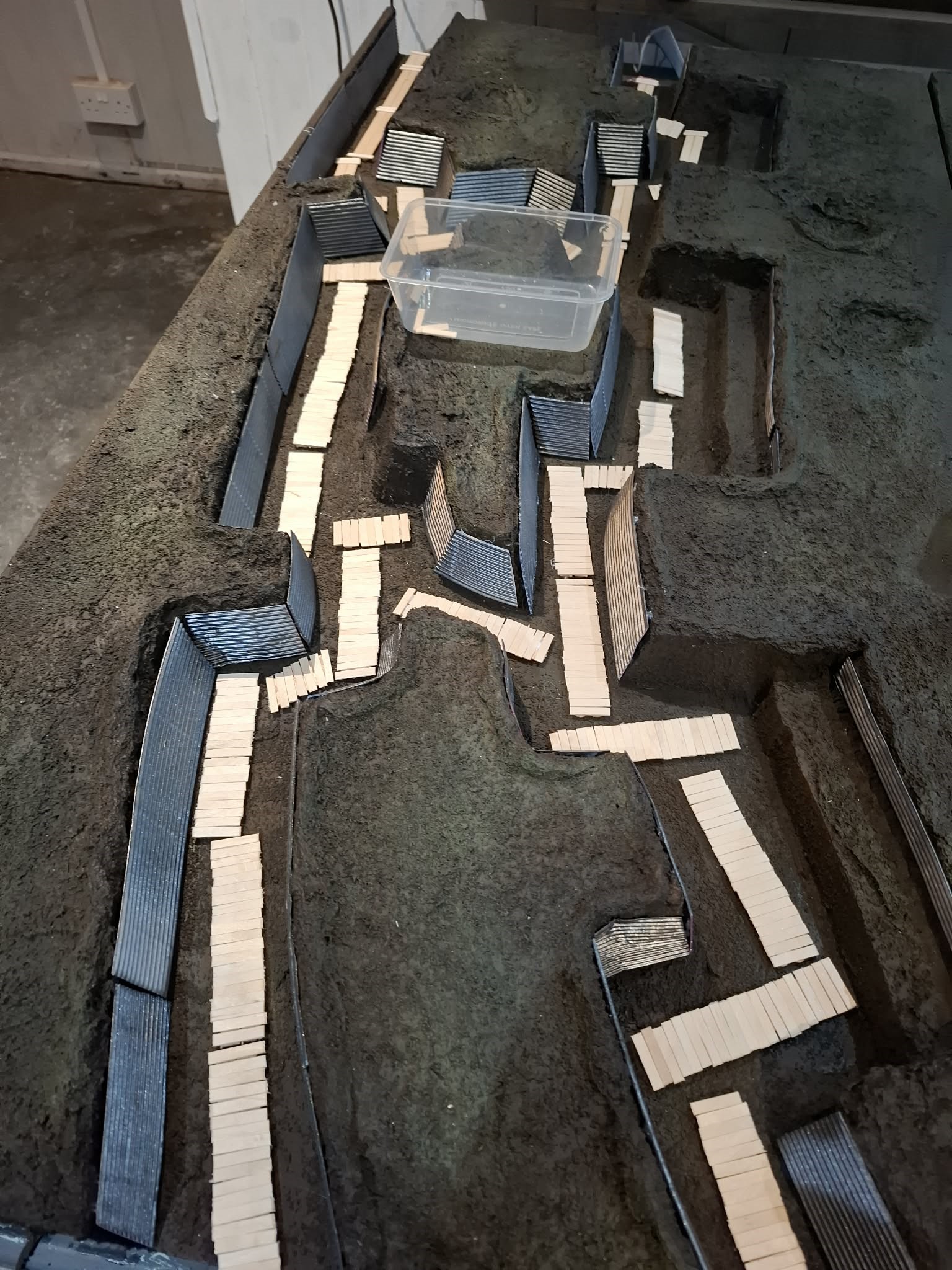 – Making the walkways. Done by cutting up lollipop sticks to layout the pathways, then coffee stirrers to 1 inch widths and sticking them across the lollipop sticks to create the wooden walkways. I have also used this method to create some trench wall panelling in a couple places.