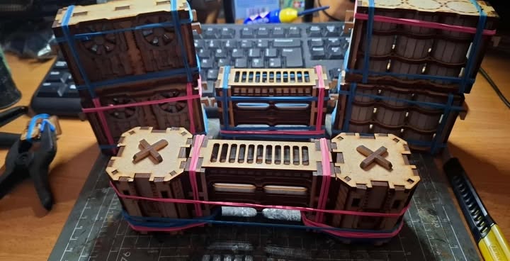 Carefully removed from the MDF frame and built, glued with PVA glue thinned with a touch of water. I bought multiple rubber band balls from Tesco and used bands to hold them together. I will say, the instructions could be a touch better. The pillars in particular, were a pain. I saw that I had put the slotted uprights in the wrong way, and had to take them all off again and reglue them properly. That was a pain in the bum!