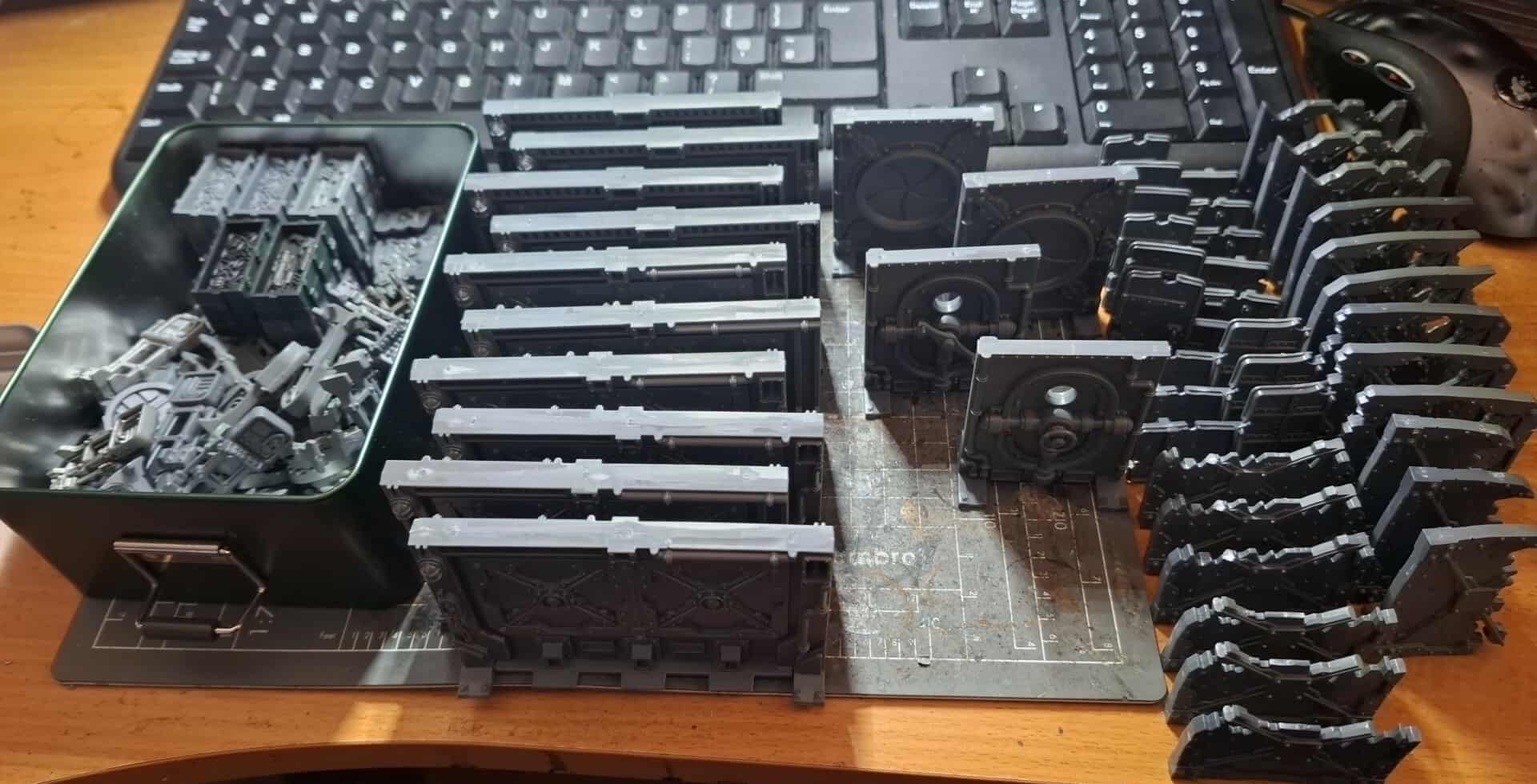 With all 3 MDF kits for the Zone Mortalis style of gameplay build and dry, I looked to cleaning multiple copies of the walls and doors from the Necromunda core box as well as the crates, tentacles and other odds and sods.