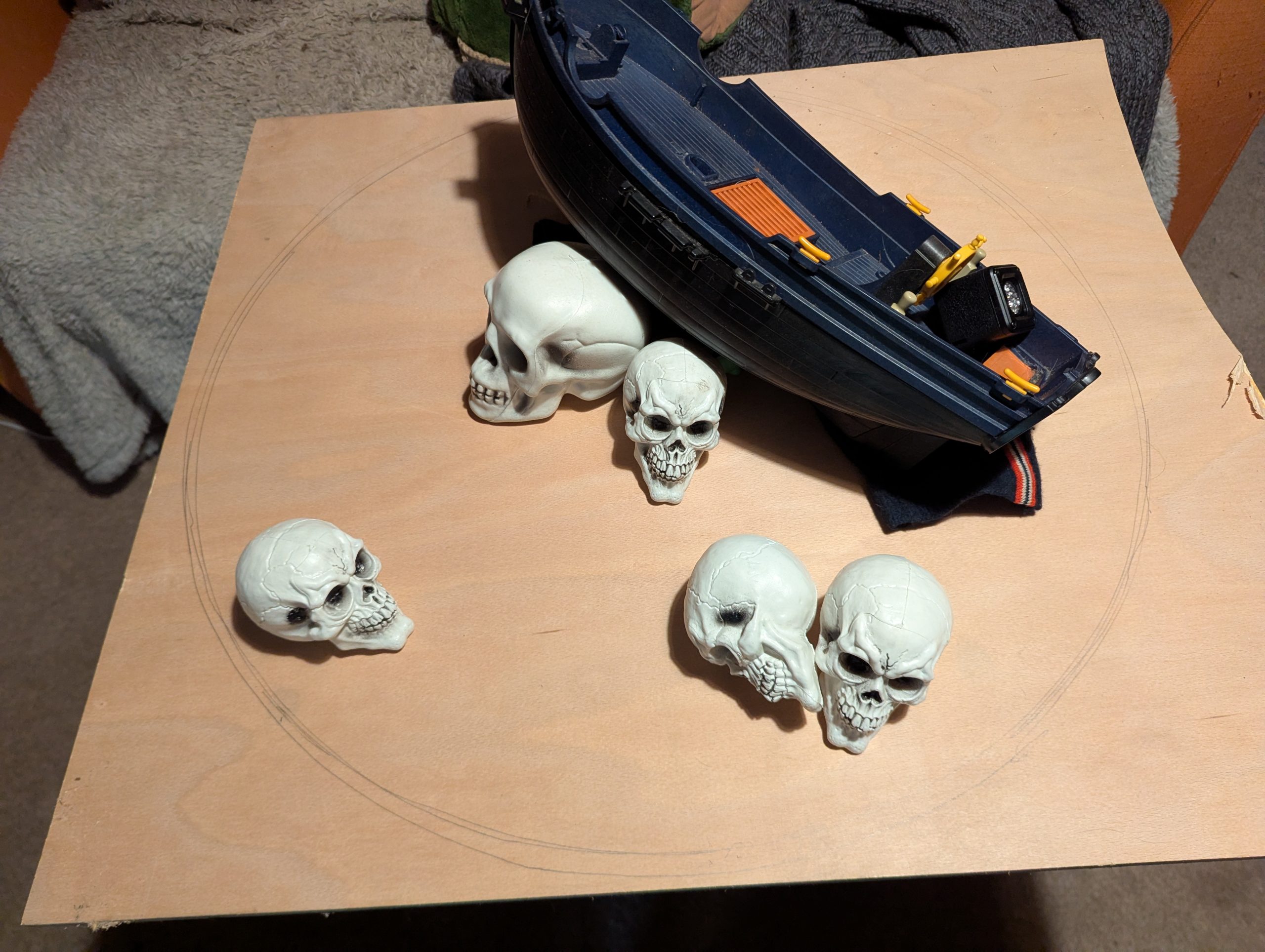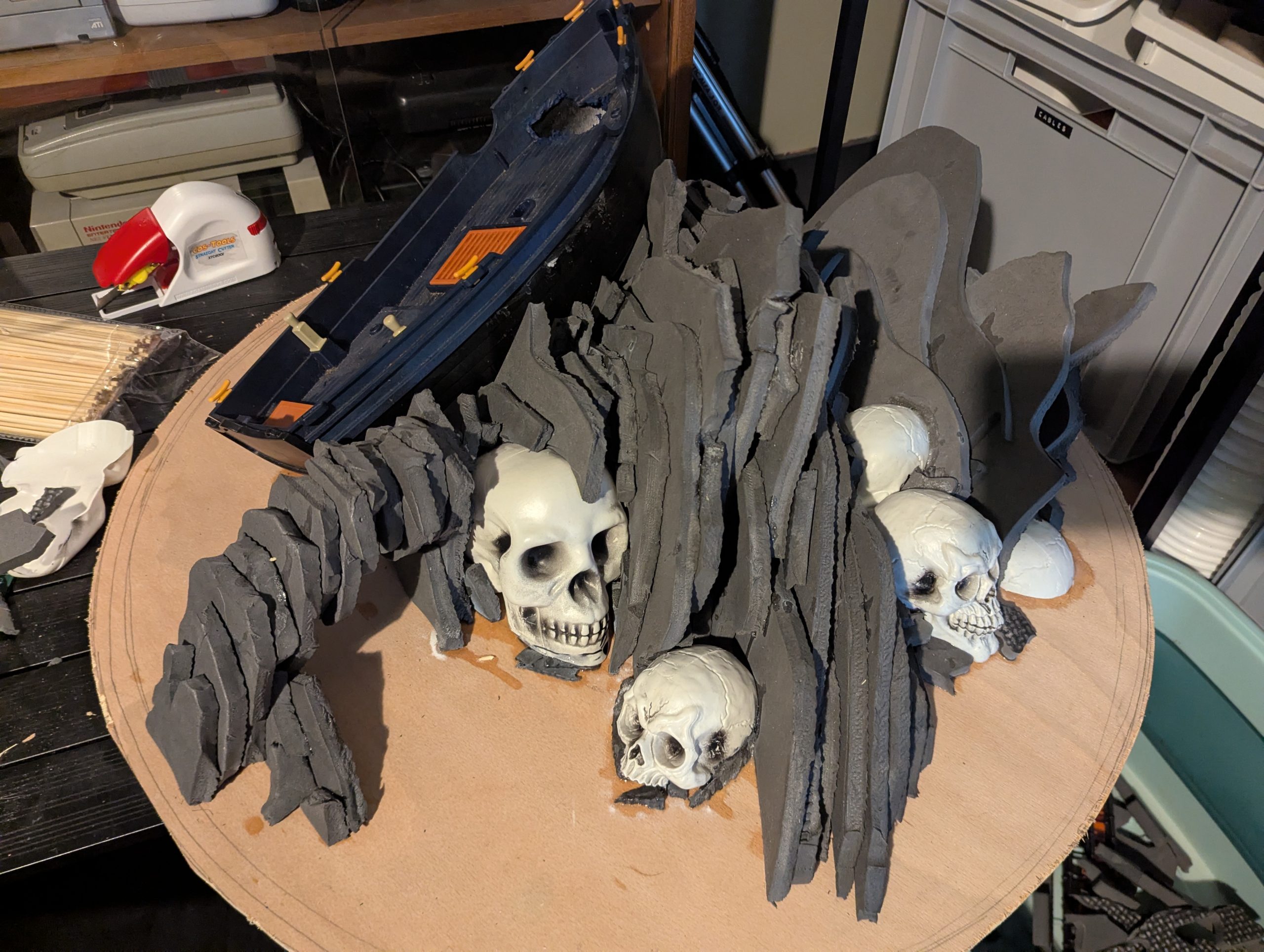 For the initial shapes I cut/ripped 10mm EVA (craft foam) floor tiles to shape and used bamboo skewers to hold in place before locking them in place with liquid super glue. EVA foam loves superglue! this allowed my to secure the skulls which were again roughly cut to shape. The scale breaking sections of the playmobile pirate ship were removed with a rotary tool and ball gouge.