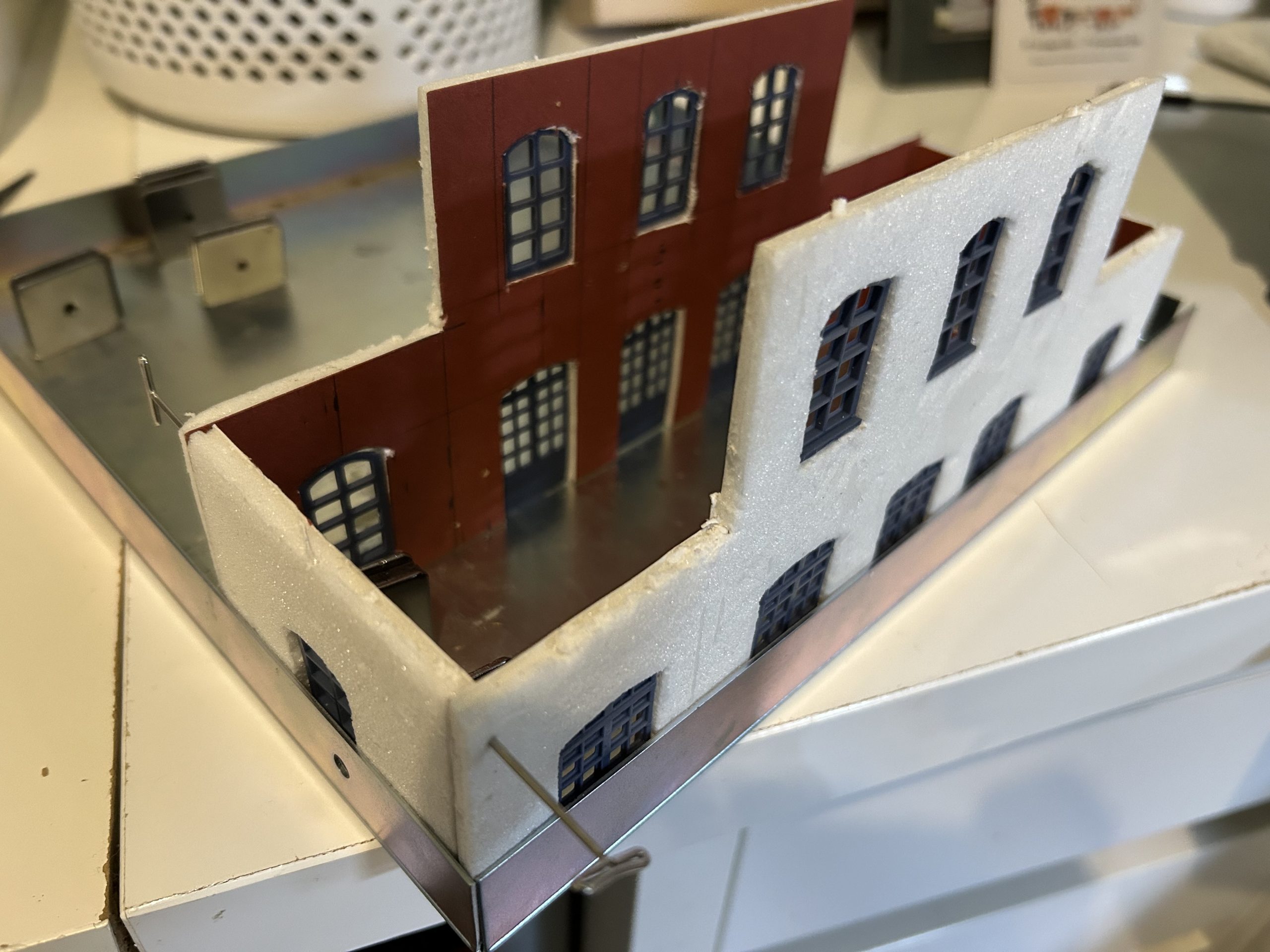 The walls have been cut from 5mm foam board. I designed and printed the windows and doors, and have started to glue them in.
