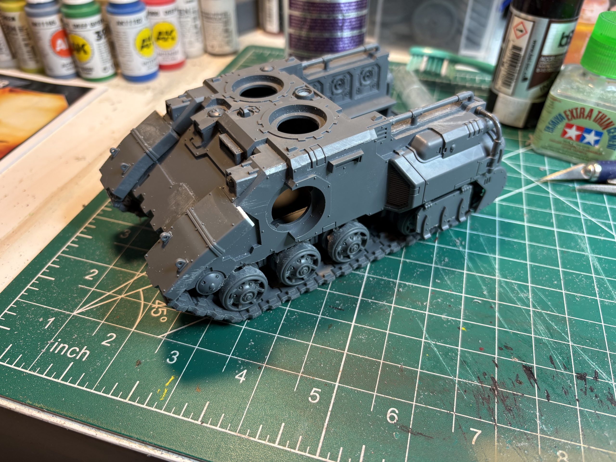 I really dislike the floaty new Space Marine tanks, so I decided to convert them back to being tracked. The donor kit for the tracks is the IG Rogal Dorn. The tracks are beefy, they have LOTS of track in each kit, and there is the bonus of loads of stowage in the Dorn kits. Is this the least expensive way to do this? Nope. Will it look cool? Yep!