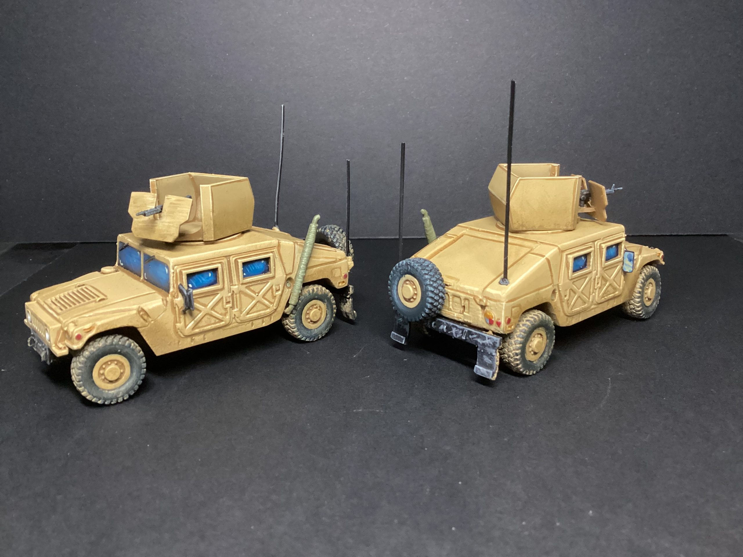 Humvee Vehicles. These were added to my project last moment as I didn’t think they would arrive in time with over a month wait for them to arrive. I’m not a big fan of 3D prints, the small bobbles just cover the surfaces the wing mirrors were completely gone, the back ends were not formed very well, pit marks all over the place ( so many) give me plastic any day….with that said they came out fairly well with my limited experience painting vehicles ( I’ve only ever done the plastic cars from the walking dead game.) I made the mirrors from some plastic airplane kit bit, you would never know. The aerials I made from bits of wire. Adding a bit of weathering powder brought them to life.