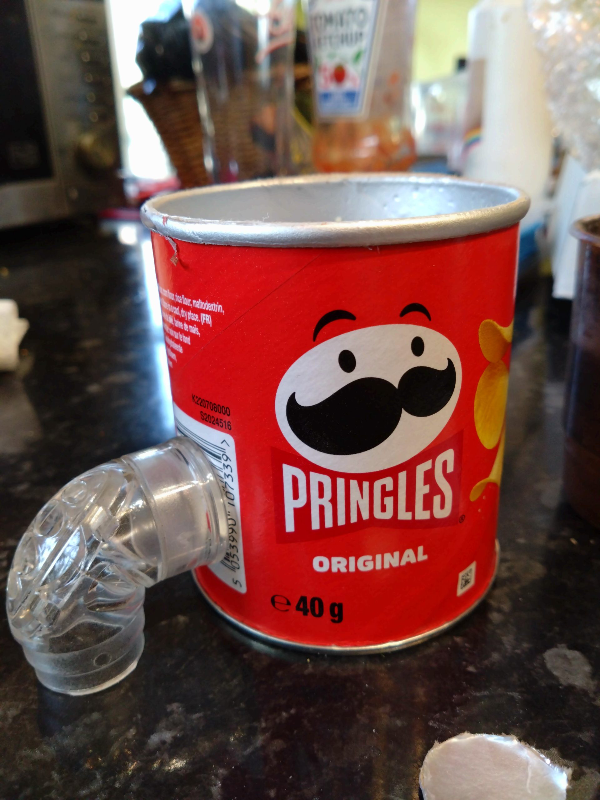 My sleep apnea mask broke. The hose connector to the mask has a sci-fi look to me. Plugged into a Pringle tube it looks kinda fun.