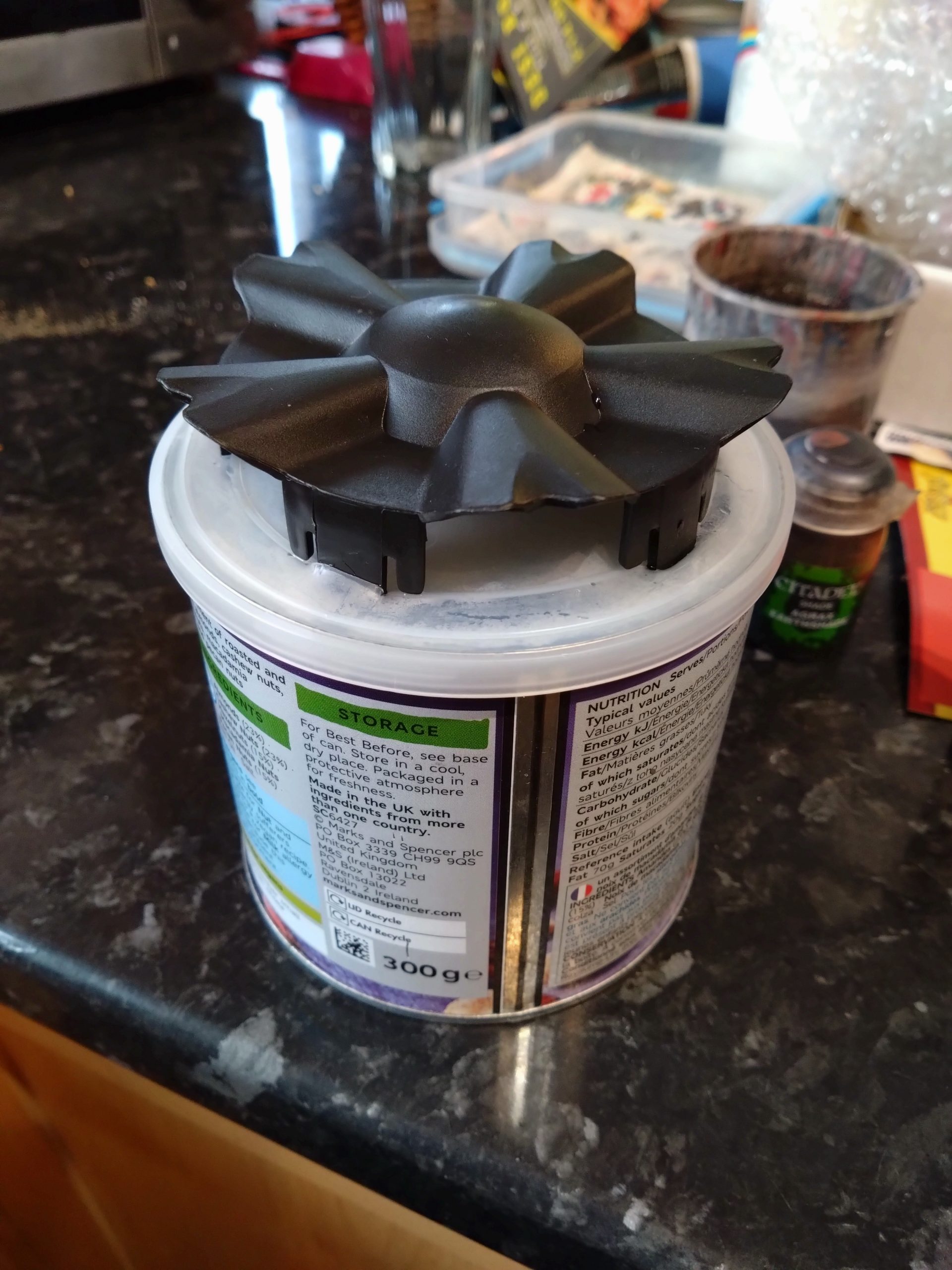 The top piece fitted into the peanut tub lid once I made some marks and craft knife cuts for the grommet's own clipping points to push through.