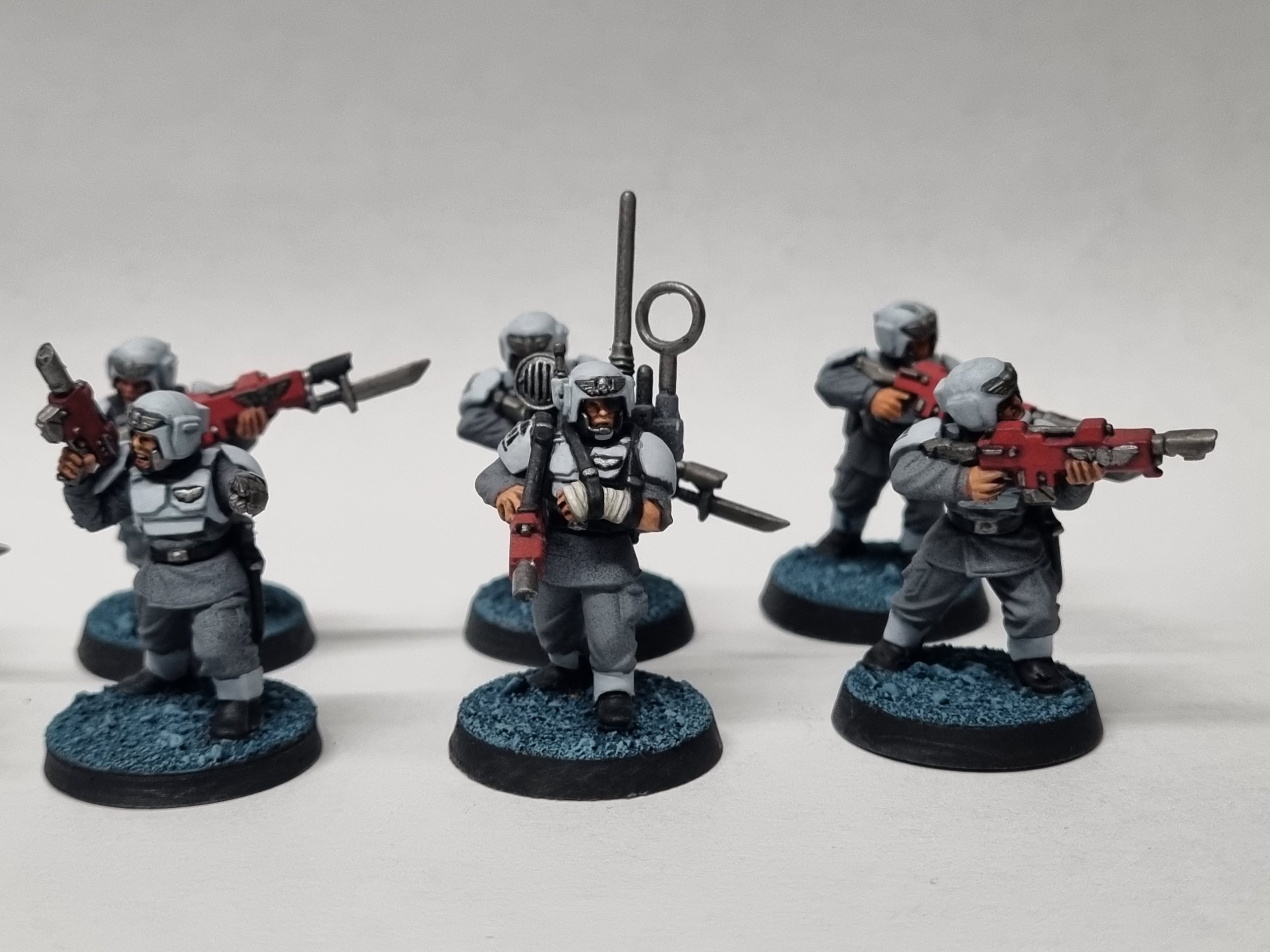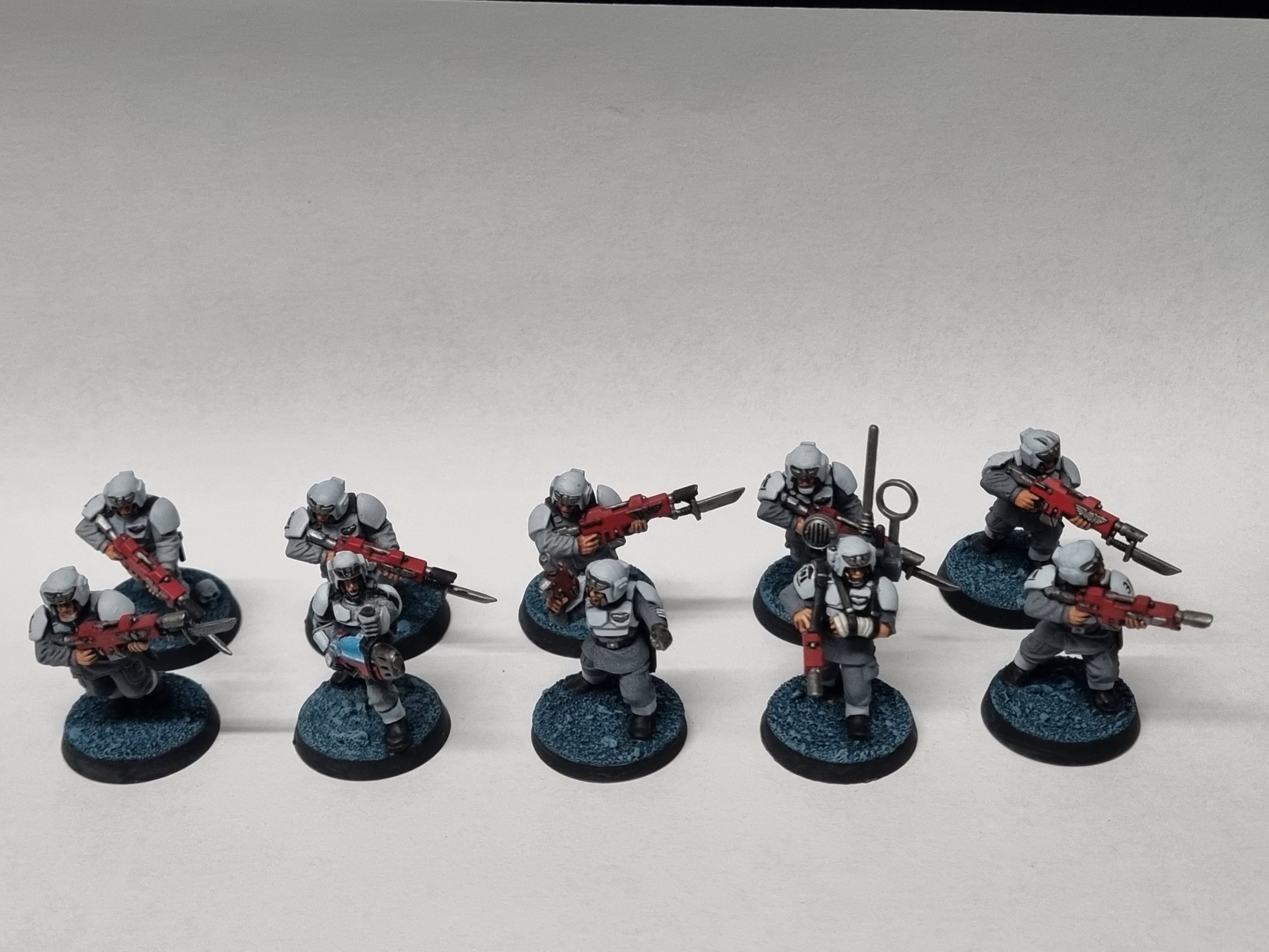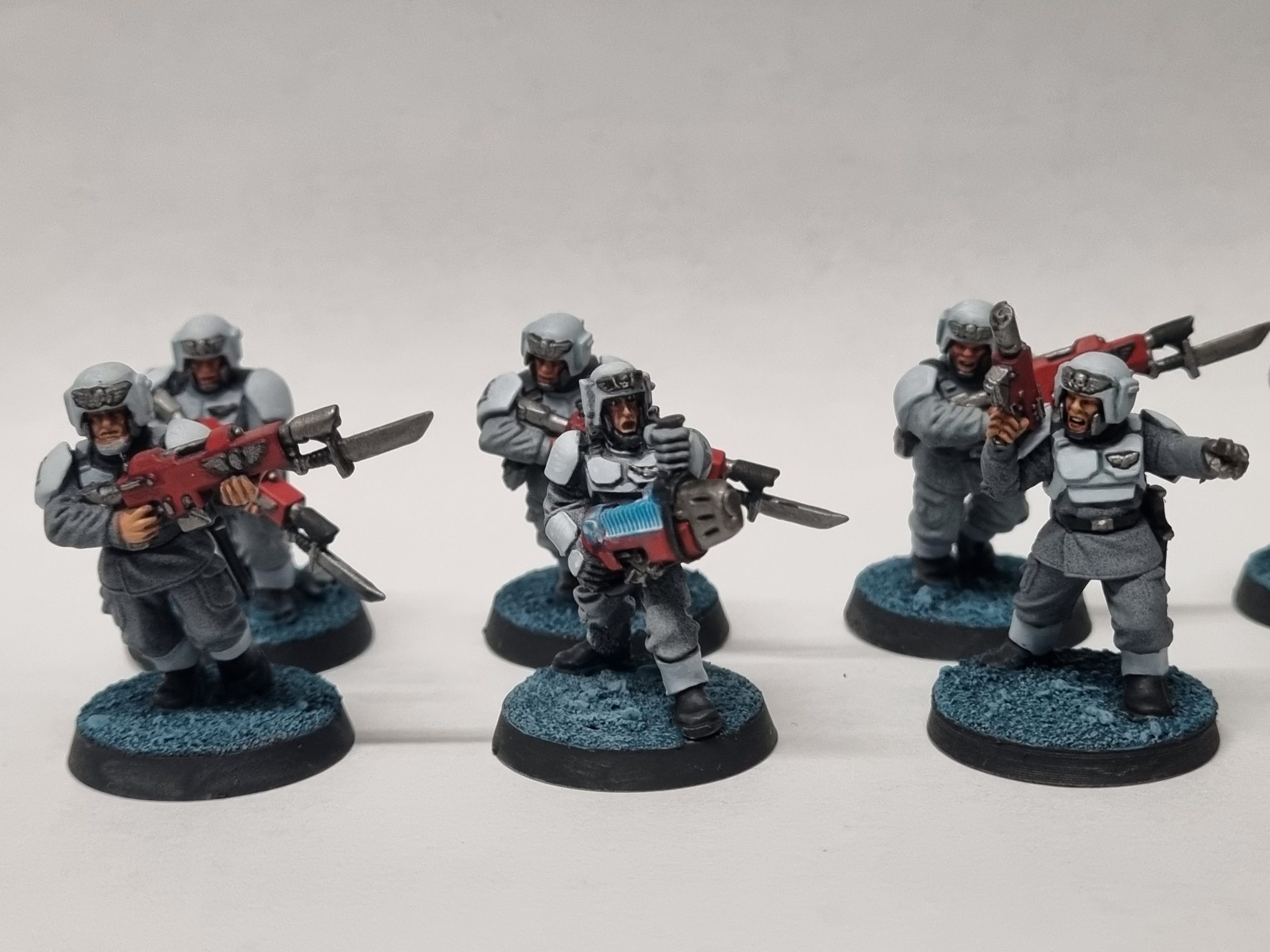 These are my 10 veterans, they’re from the newer guard kit so have a bit more character in them. The hair on a few aren’t yet done, I was thinking of making them quite brightly coloured but haven’t quite settled on that yet as it would draw attention away from the fairly muted other colours. I didn’t really want the focal point of the model to end up being their hair.