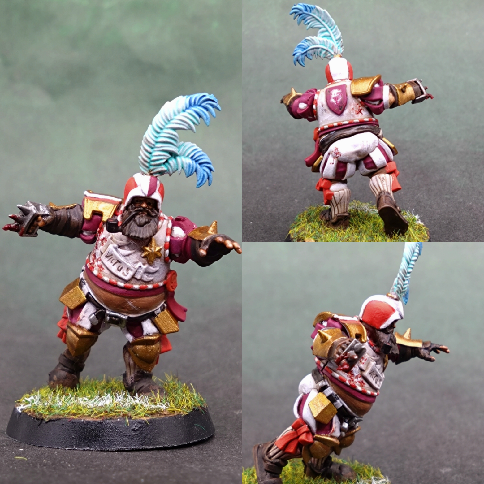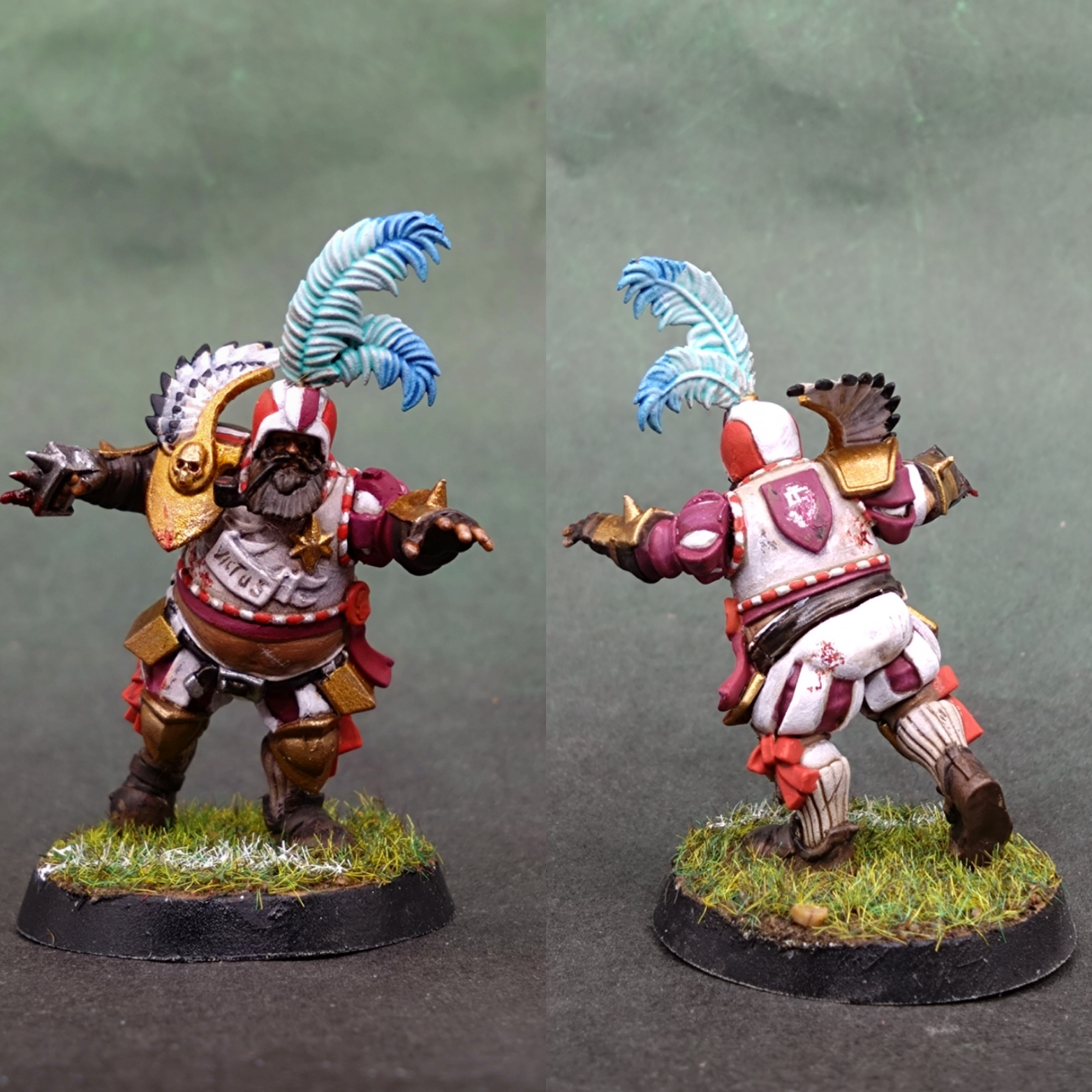 I like Screaming Pink as a nice regal purple colour and a bright red and white scheme seemed to work. Writing "Victus" on the chest was a challenge. I spattered the chest with blood to hide elements I wasn't happy with.