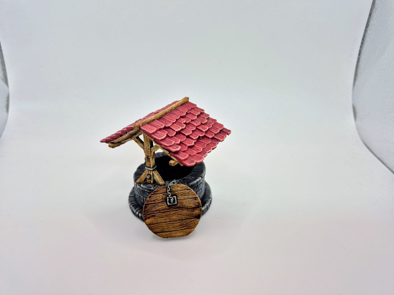 I painted up a well to be placed in the center of the buildings in addition to the rest, just because it made sense. Also, an outhouse, because every self respecting village needs one!