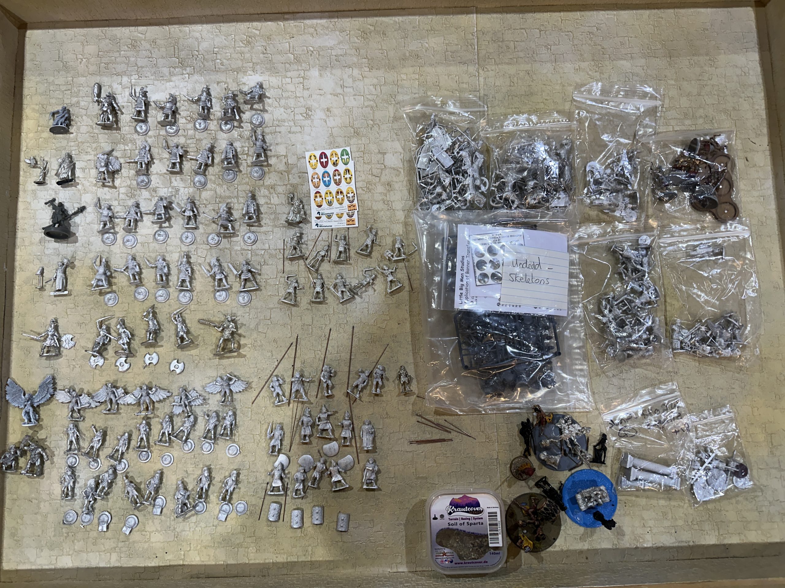 Working from left there are a range of character models down the left hand edge including; Warlord Games (Sacrificing priest), Crocodile Miaitures (female and owl in tree), Reaper Bones (Priest adventurer), Crooked Dice (Perseus and Bubo), Lucid Eye (Odysseus), Ral Partha Europe (Harpy) and at the bottom Theseus and the Minotaur by Foundry Next to them are the Wargames Foundry Argonauts (top) Lucid Eye Achilles and Myrmidons with Relic Calibos and then more Foundry below, harpies and two blisters of Greeks, Spartans and Athenians. In the middle there are Relic undead with some shield transfers and below them more Foundry, satyrs, Trojan characters and Aeëtes with guards. In the bags are some Lucid Eye Sea People and Amazons as well as some Wargames Atlantic skeleton sprues and then bottom right are some Amazon and Ptolemaic command bases which are mostly Forge of Ice (next to the Krautcover Soil of Sparta basing material), and finally a couple of Foundry columns and tropaion from Footsore.