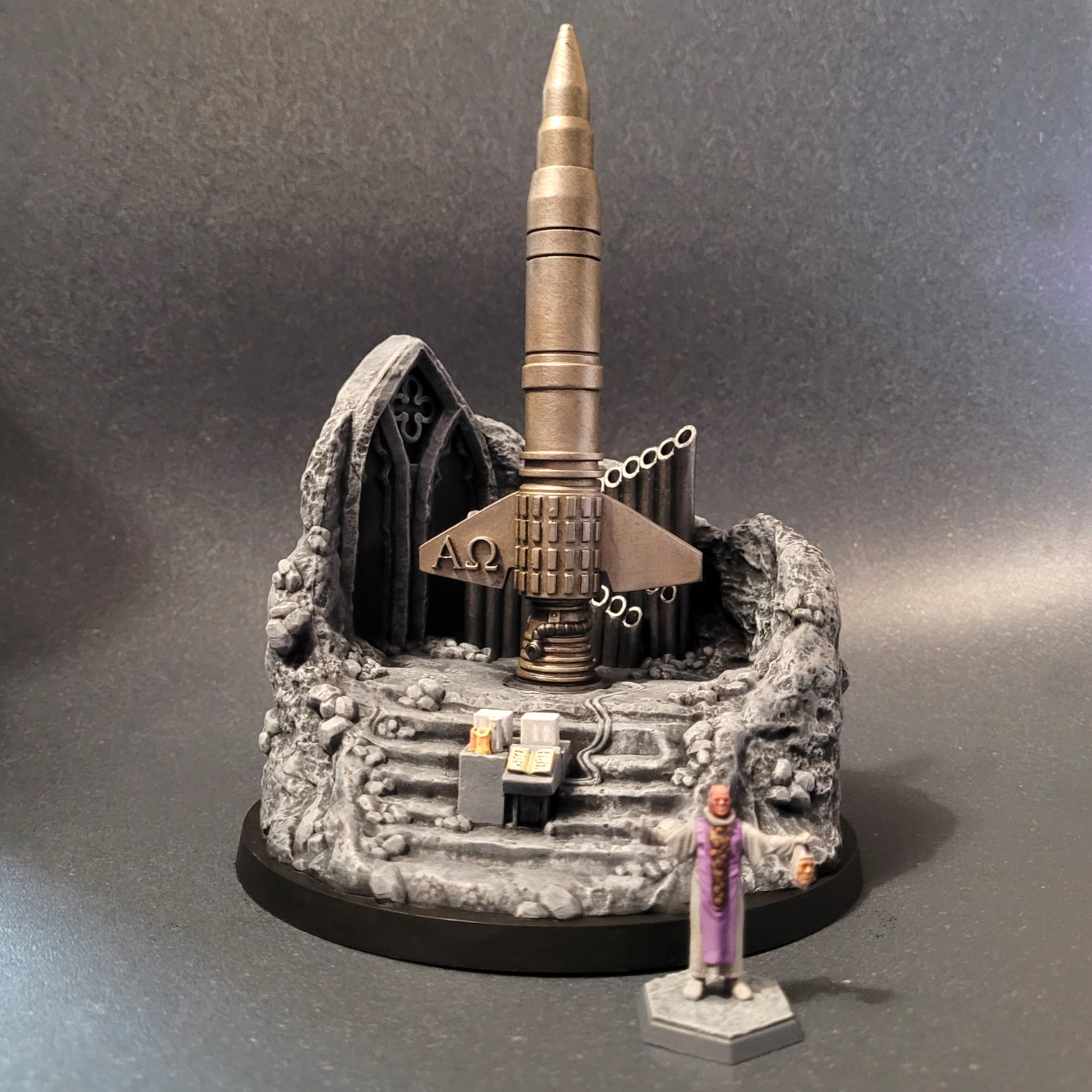 I have the remaining five miniatures mostly done — they’re just waiting on a coat of varnish. I’ve also got a terrain/display piece: the Alpha/Omega missile from Beneath the Planet of the Apes. I most likely won’t need it for the game, although part of the campaign does take place in the underground ruins of New York so you never know…