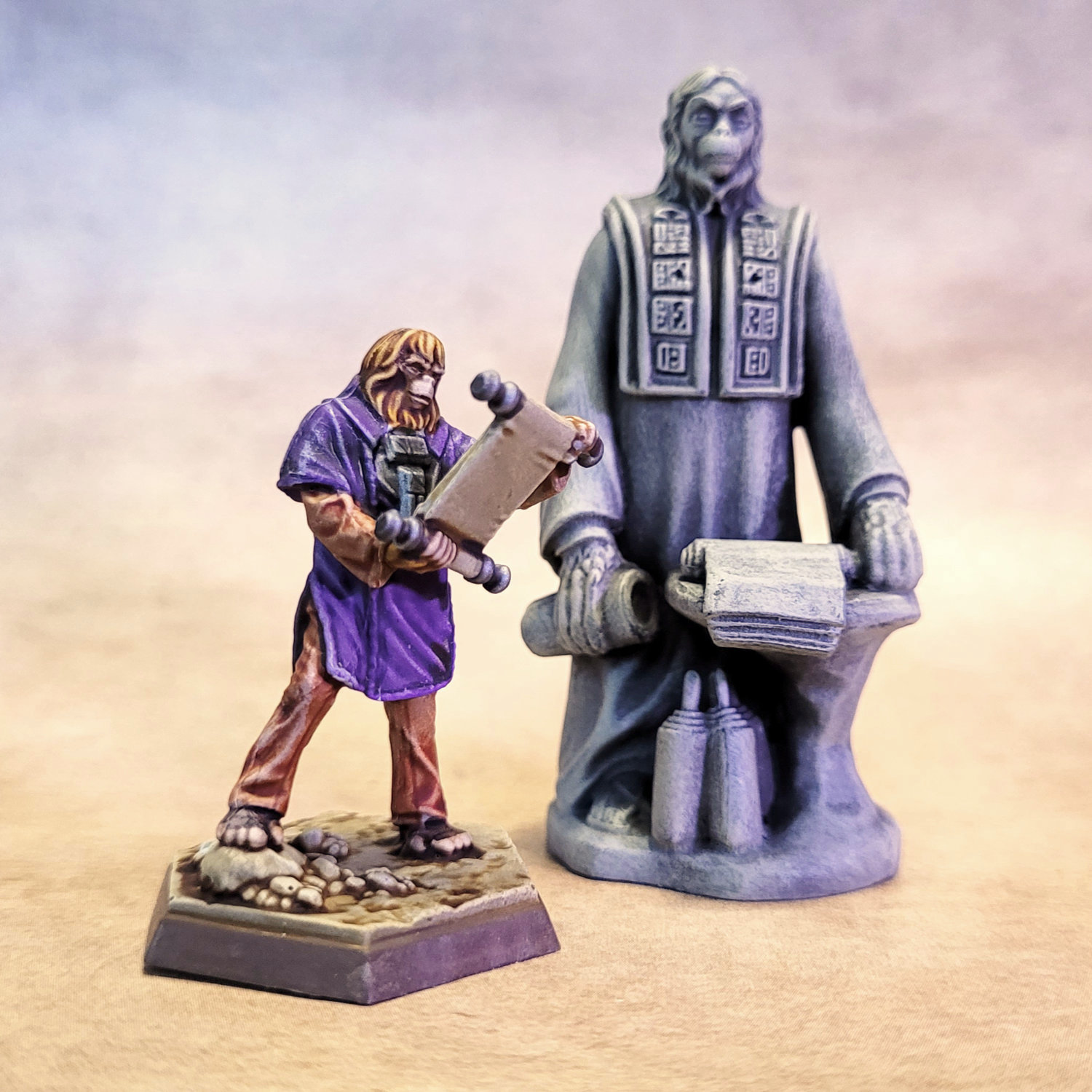 When I backed the Kickstarter for The Roleplaying Game of the Planet of the Apes, I had originally skipped the Higher Calling miniatures set. It consists of two usable miniatures and two terrain pieces, one of which is pretty much just a big display piece. I couldn’t really see a diorama of the missile-turned-religious-icon from Beneath the Planet of the Apes being particularly useful.