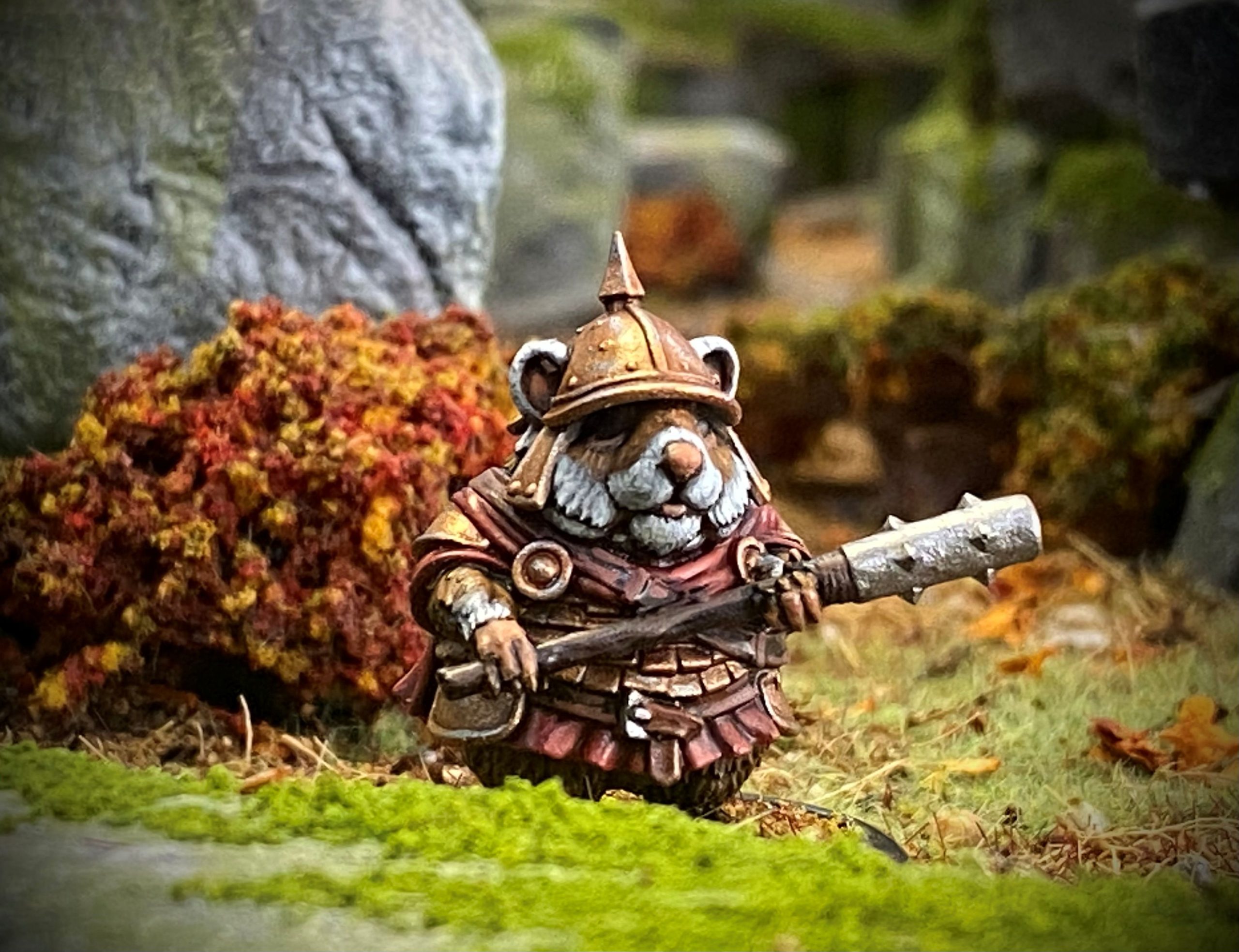 Barry scratched at his whiskers; his beady eyes fixed on the dusty old armour hanging on the wall of his burrow. The dented helmet, adorned with its large spike, seemed to gaze back at him with a knowing gleam. He nodded to himself, muttering, “Aye, solid oak and steel that club. Dealt many a savage blow…”