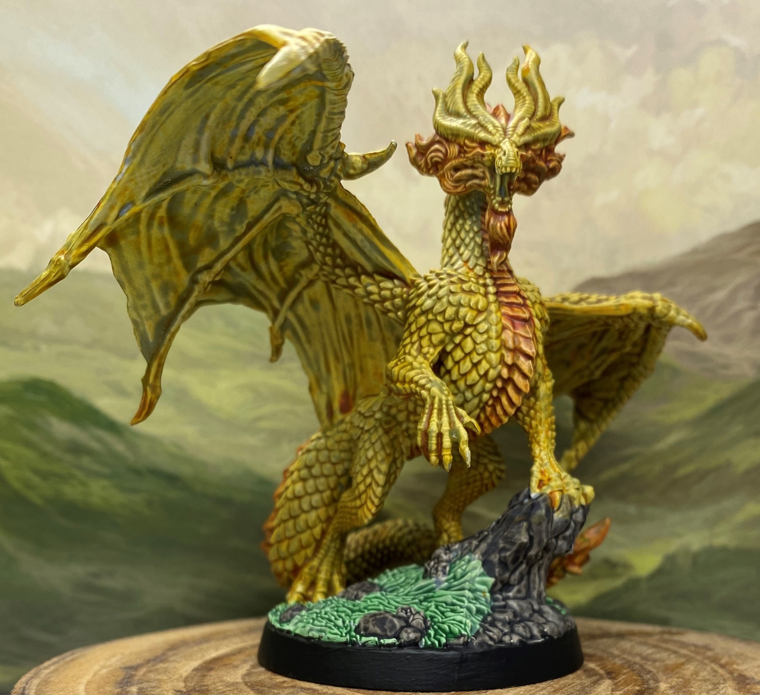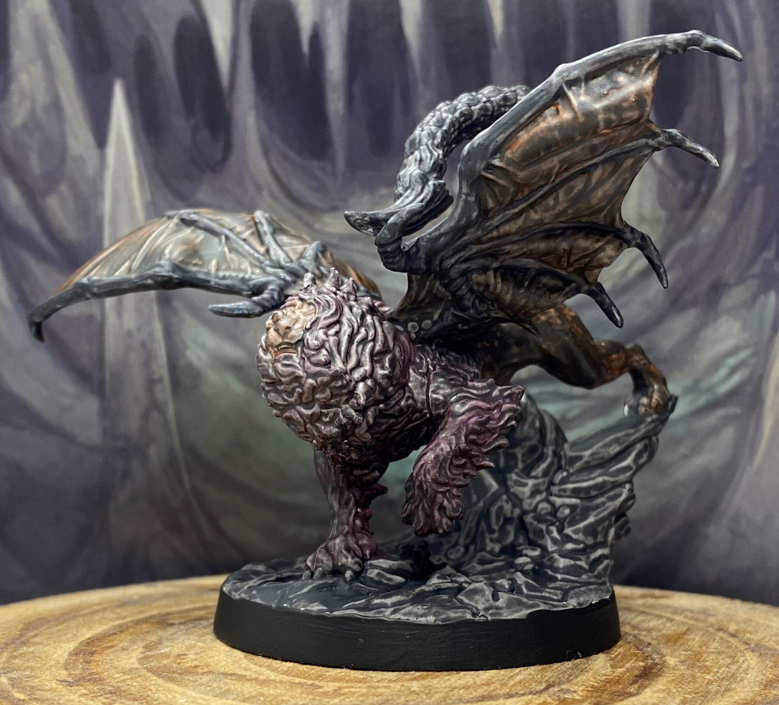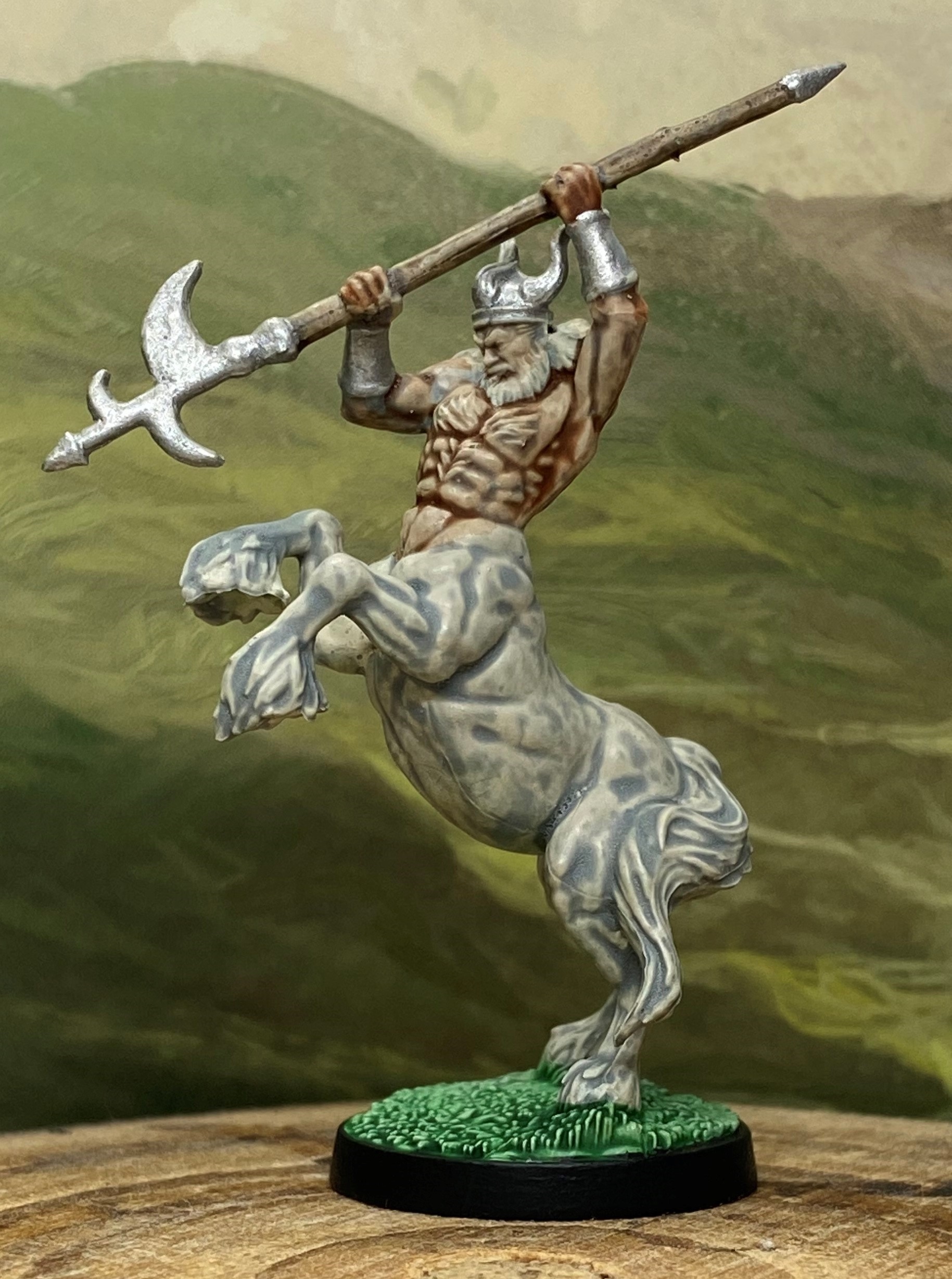 The Gorgon is supposed to have metallic skin, so after the coat of basilicanum grey the model was dry brushed runefang steel. The colour washes mostly covered all the metallic effect, so the model was dry brushed runefang steel again after the colours had been applied.