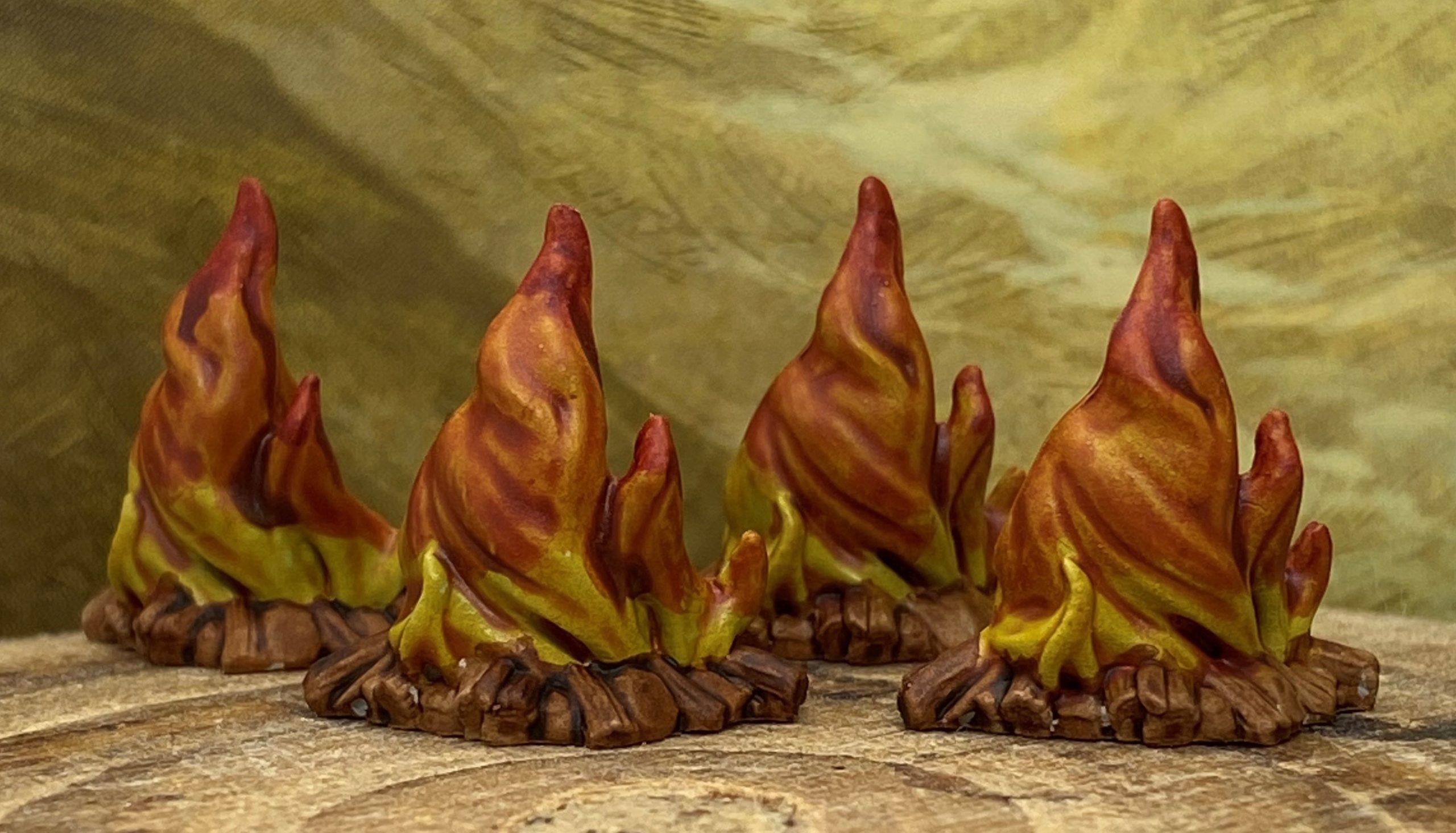 The campsite tokens were painted iyanden yellow, with gryph-hound orange painted over the top two thirds, and then blood angels red painted on to the tips. The bases were painted gore-grunta fur.