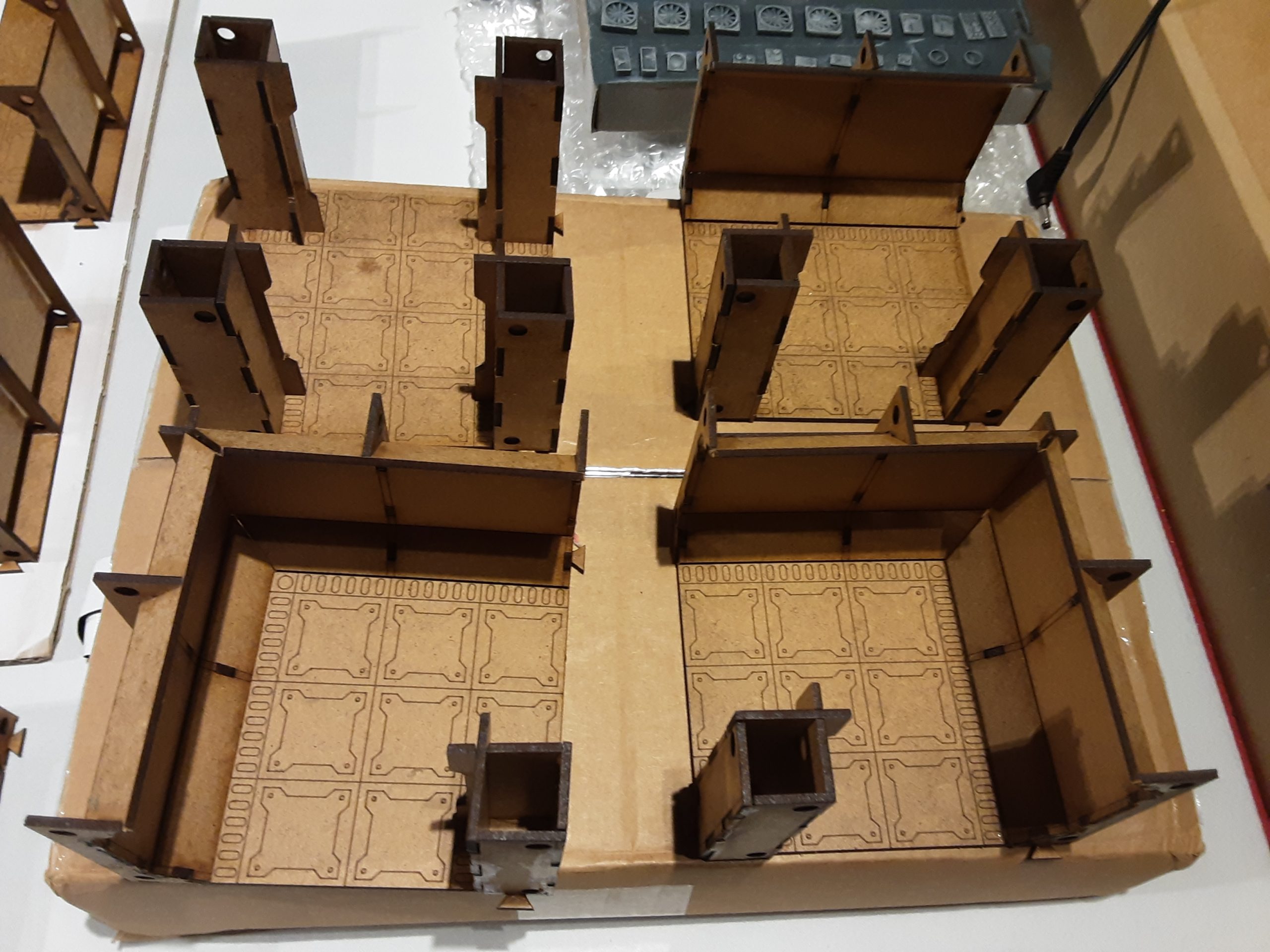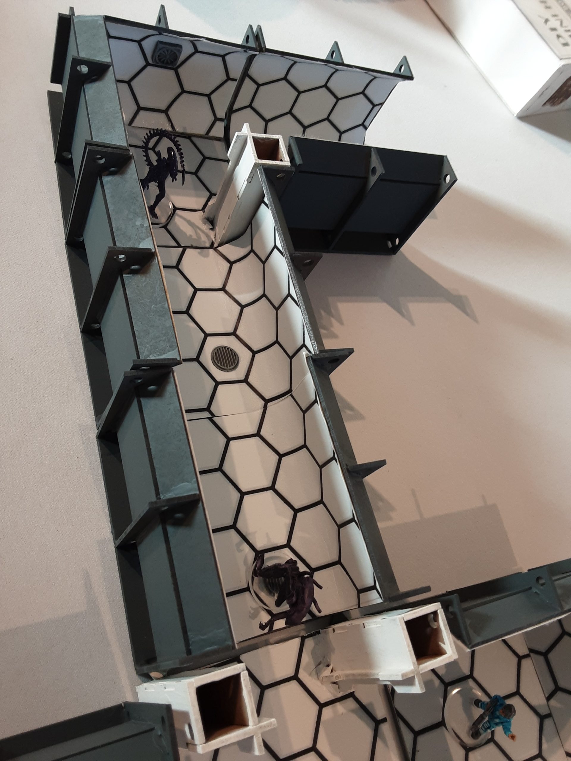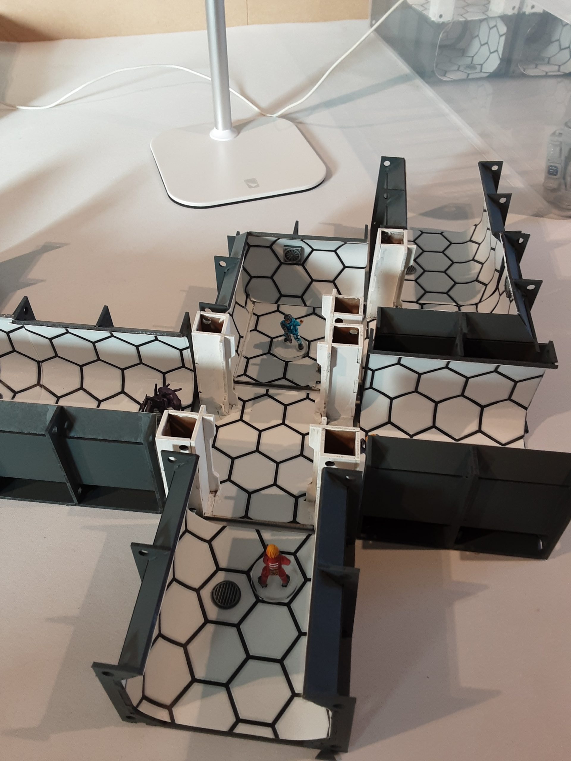 Purchased some items from Warbases for use with games such as Alien RPG, Five Parsecs from Home, Stargrave etc. I added the hex pattern by using hex pattern wallpaper available from B&Q, along with 3D printed items like air duct entrances on the walls and floors. The doors / tunnel blockers were made from 6mm foam core board with the holes cut out for the removable doorways, and the foam core glued to the door bases
