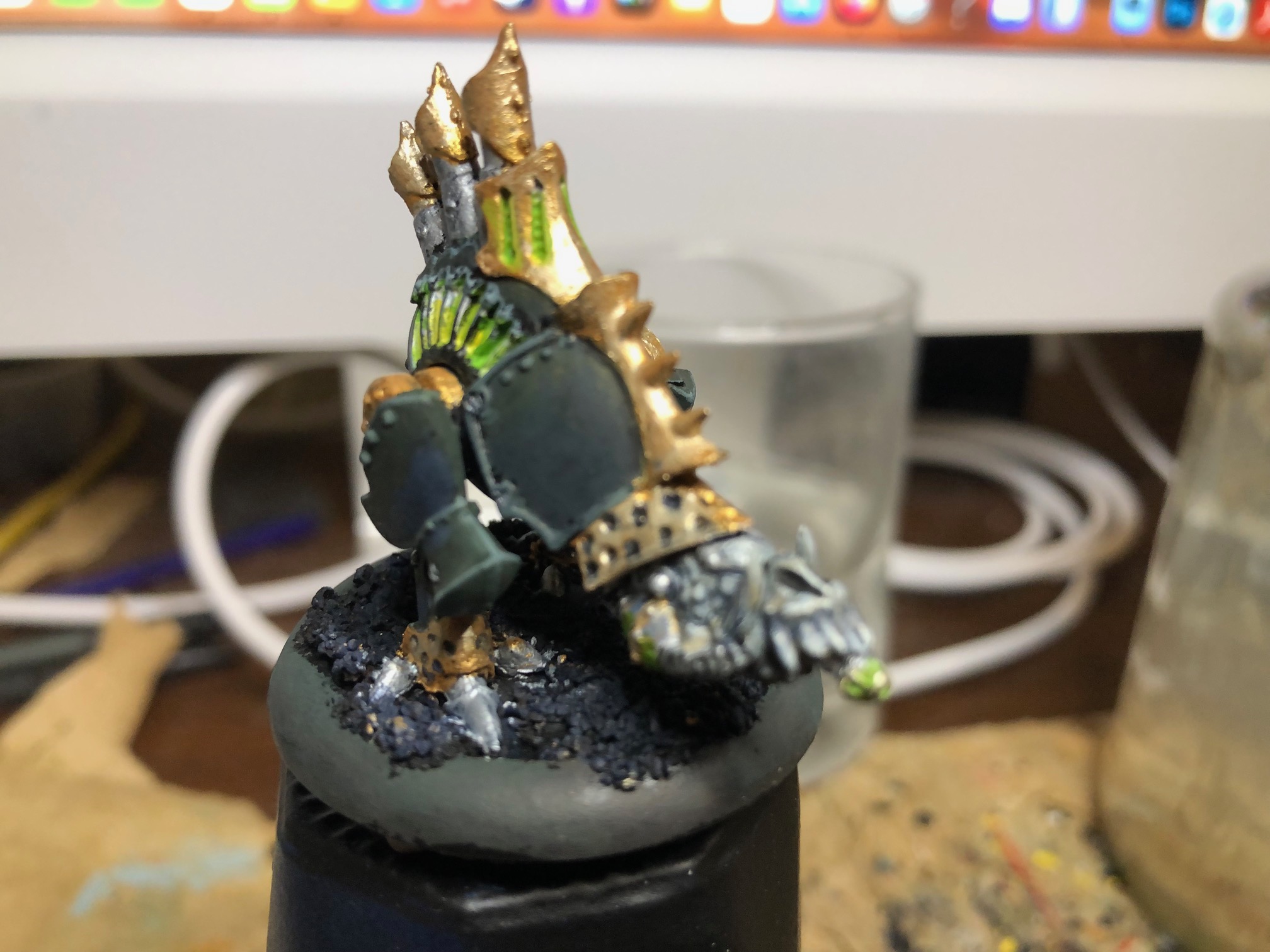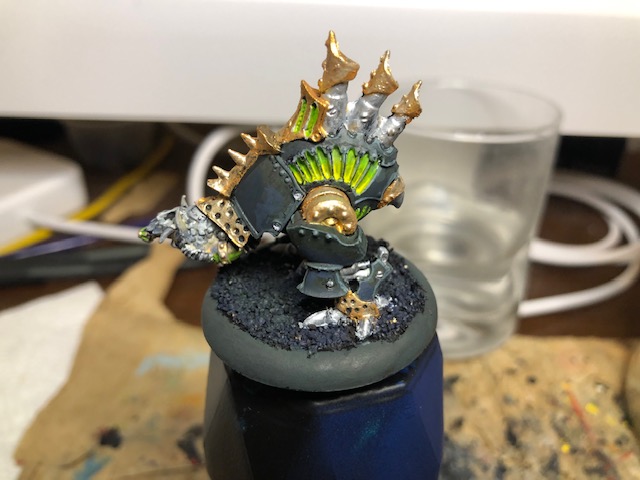 So I have managed to secure a little time to work on the Cryx models. Here I have gotten a personal mix of Pro-Acryl paints to make a Cryx dark grey. Something that is 2 parts coal black, 2 parts green and maybe 1 part white (roughly). For the teeth the original P3 jack bone, with Pro Acryl Bright White. For the metals I don’t have any more blighted gold, so I mixed together Pro Acryl Bright Gold and Pro Acryl Silver. Unlike when I first did a Deathripper, here I did a little bit of edge highlighting with a lighter shade of my Cryx Gray, and I used a Pro Acryl Dark Blue for some shadding. I used a blend of P3 Necrotite Green and Pro Acryl Bright Yellow. So overall, I am not a great pro-painter and its not a display model, but I am excited for it to be on the table. Well I hope you have enjoyed.