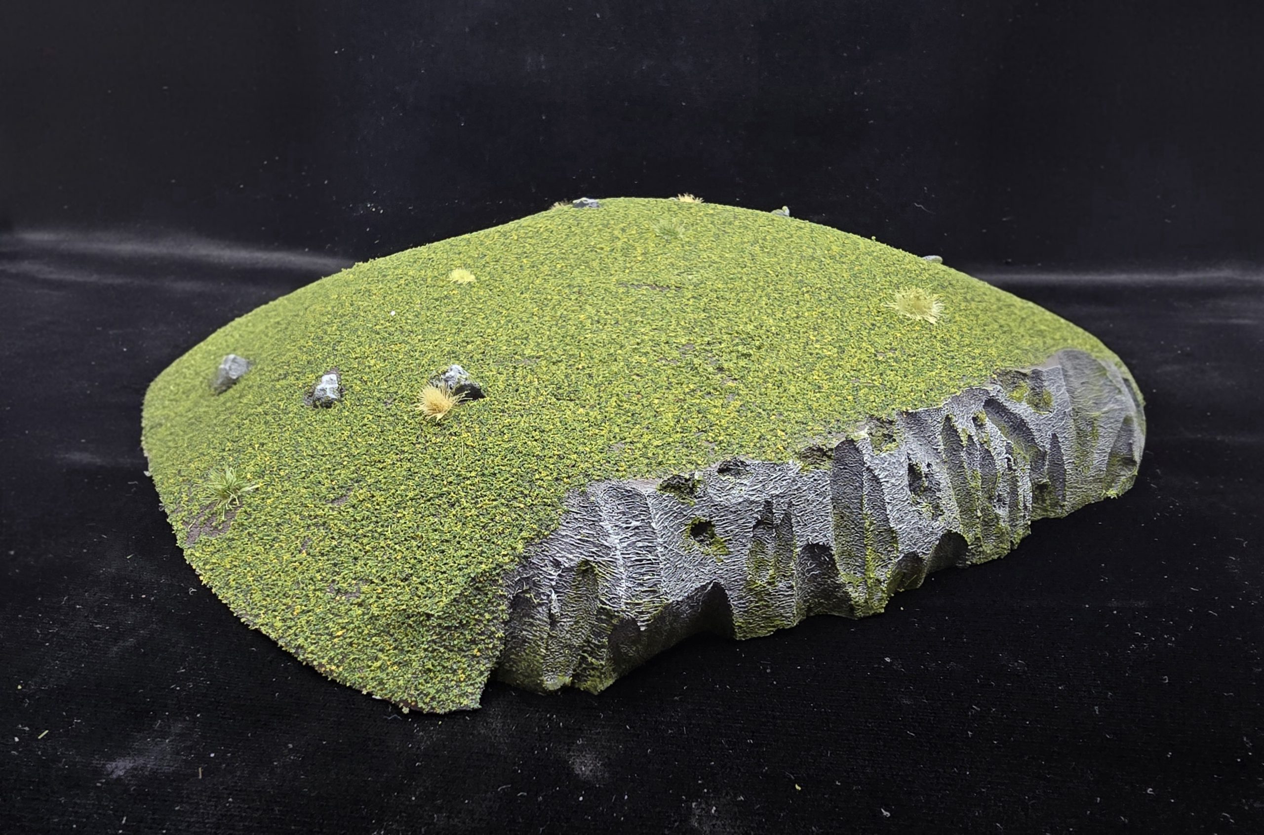 I thought I would have one with more gentle slopes, and another with rocky sides. I used a handheld hot wire cutter on XPS foam for the basic shapes, then glued large rocks (also cut from xps foam) along with smaller rocks and cork rubble on the sides of one, leaving a wee path up. If I did it again, I think I would try less to make the distribution of the rocks random, and more focus on large rocks at the bottom, getting smaller as you go up. Oh well, lessons learned and all that.