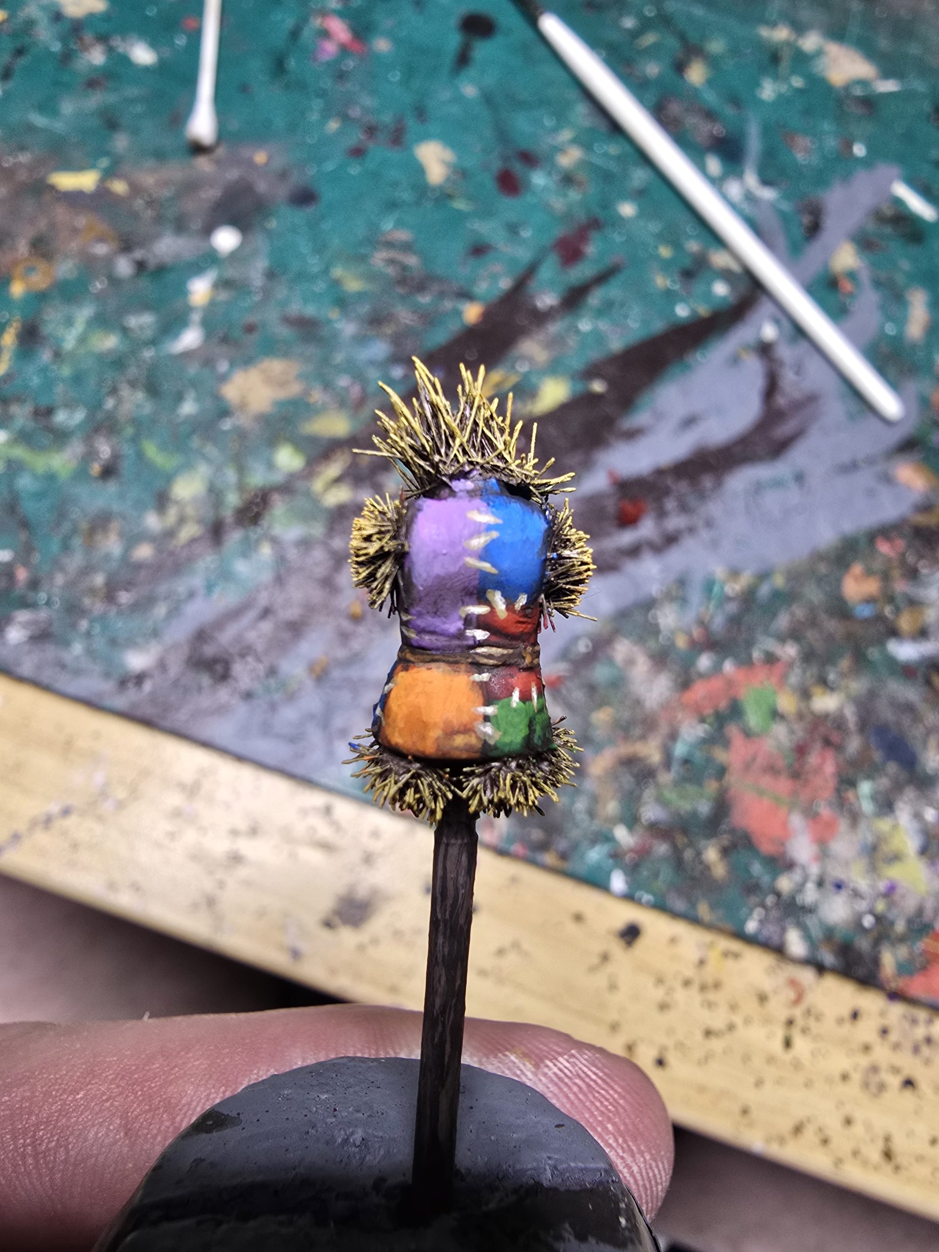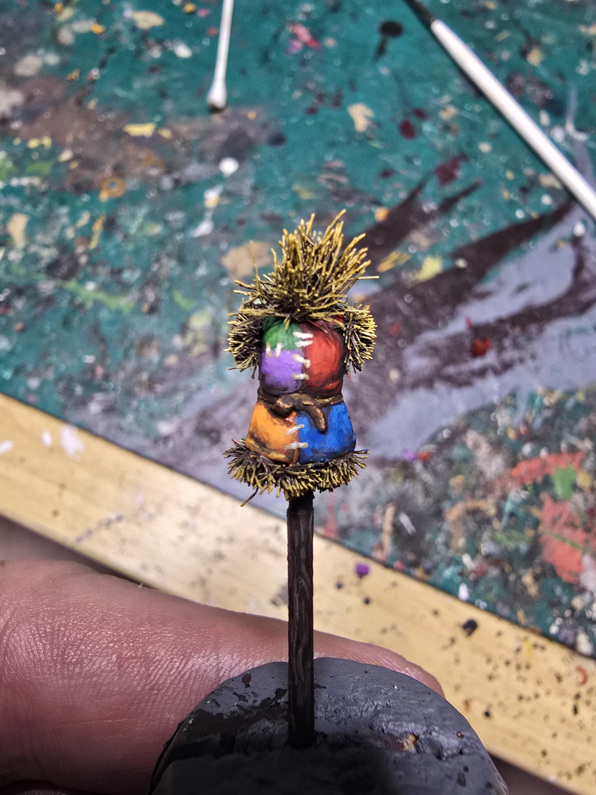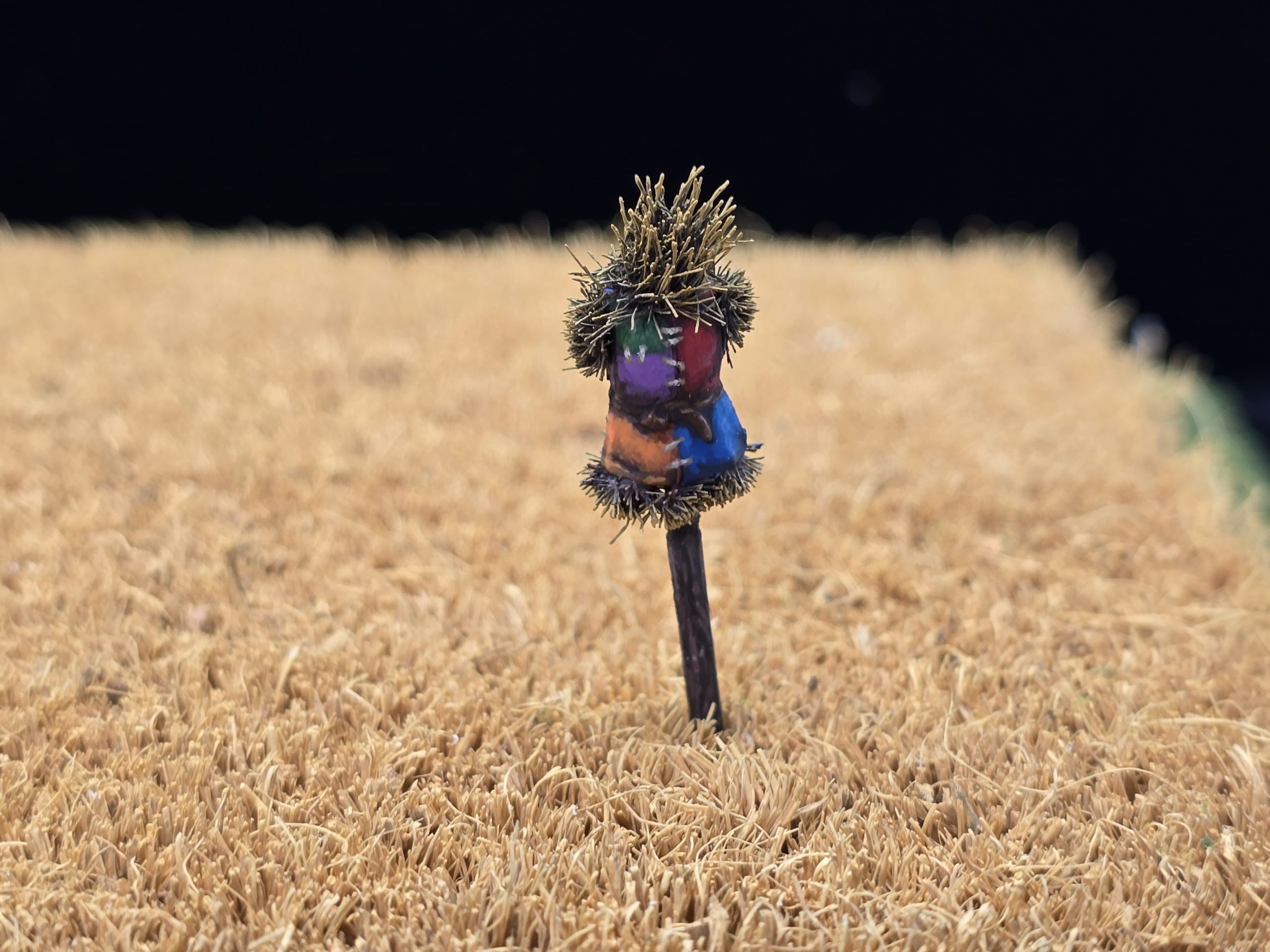 Obviously I had given myself a task that was too quick and easy, so I decided to add a scarecrow. I took an archer from Perry Miniatures, but the legs off, glued grass tufts to the various ends and finished by drilling a hole and sticking a bamboo skewer right up somewhere very impolite. Also quite fun, at least for me. The archer may have other ideas, but he is busy scaring off crows, so no need to ask him.