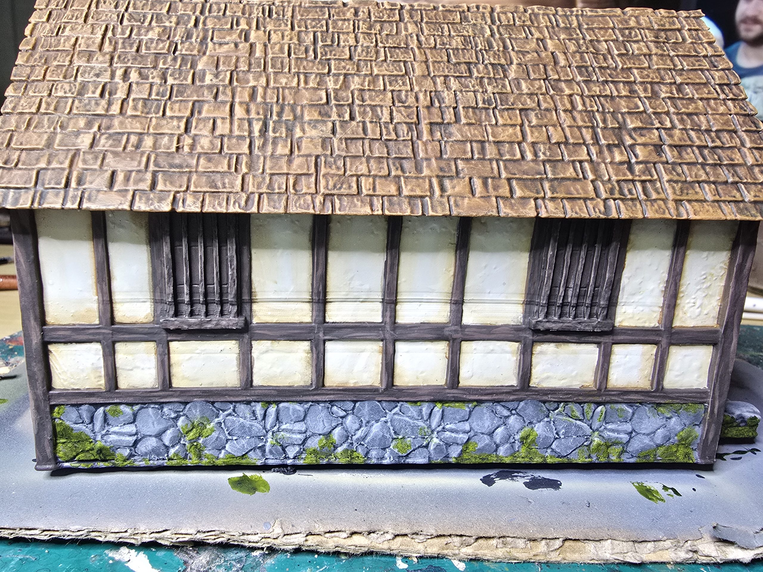 Good lord, but I underestimated how tedious painting all the wooden trim on these Tudor houses would be. They are just three dimensional enough that you have to paint all the sides of each beam, but so thin that it is a real chore trying to get it done neatly.